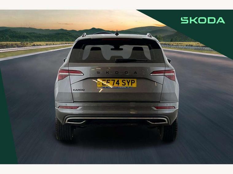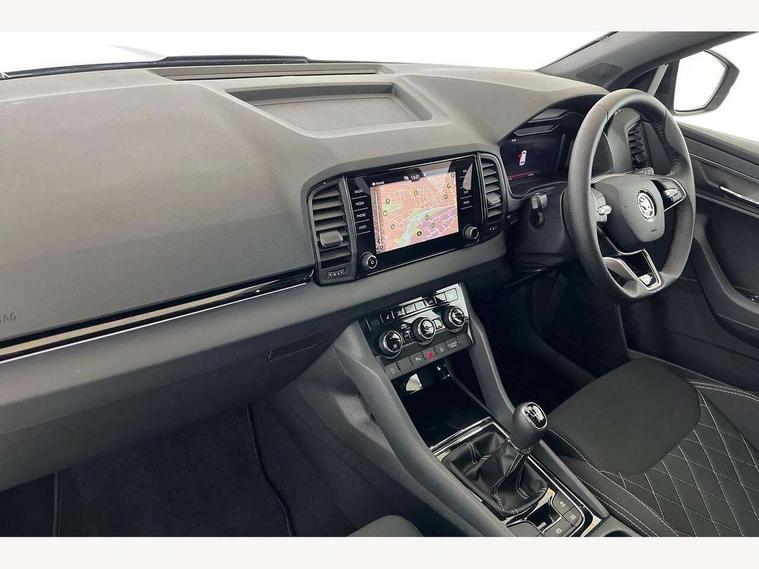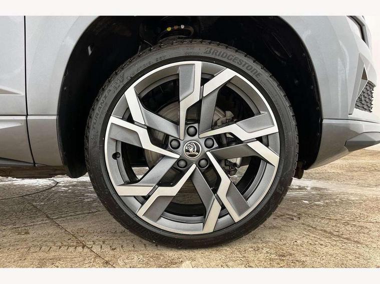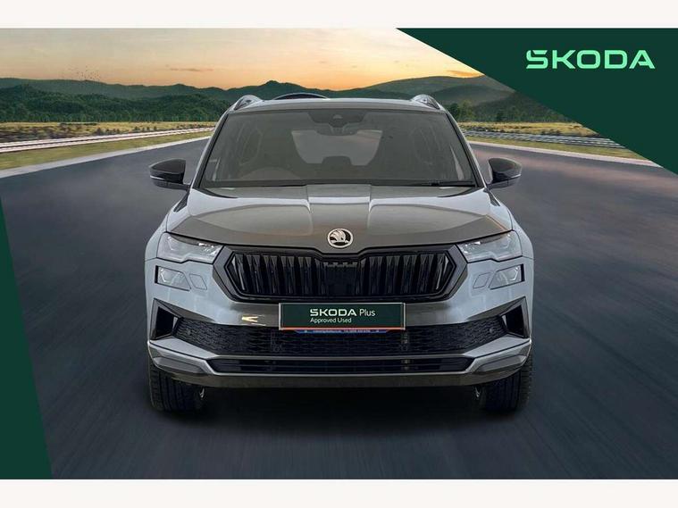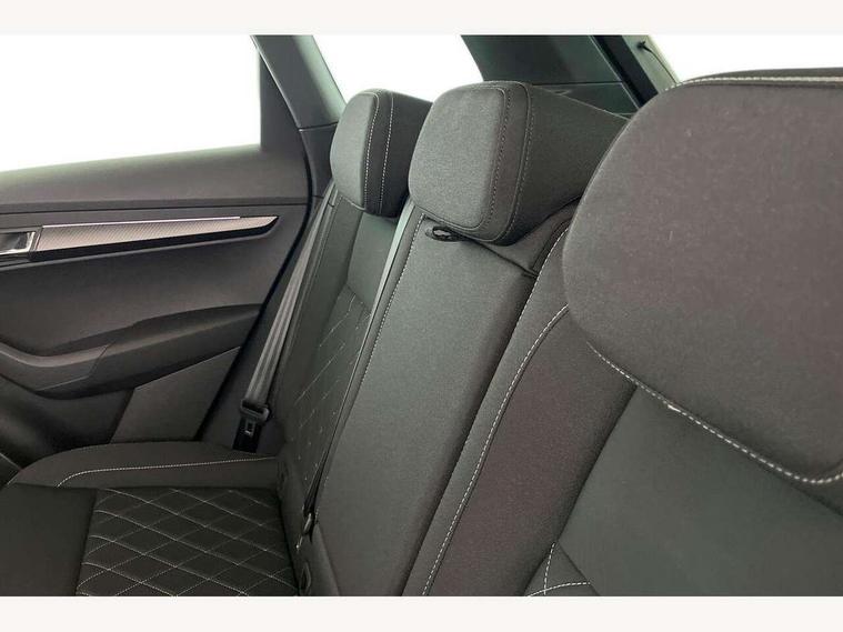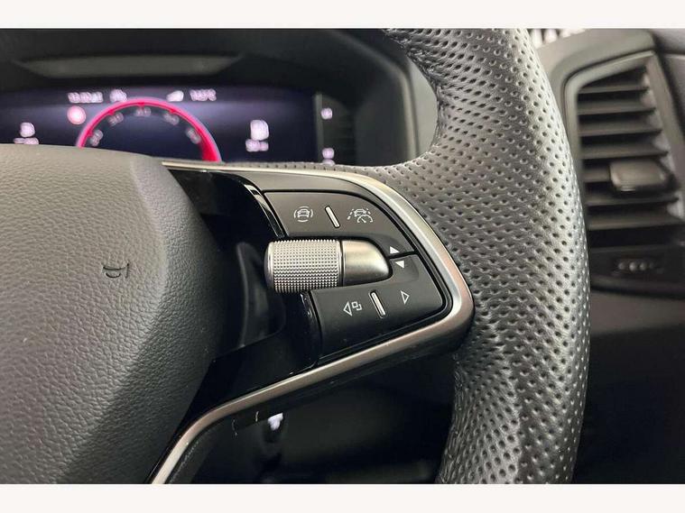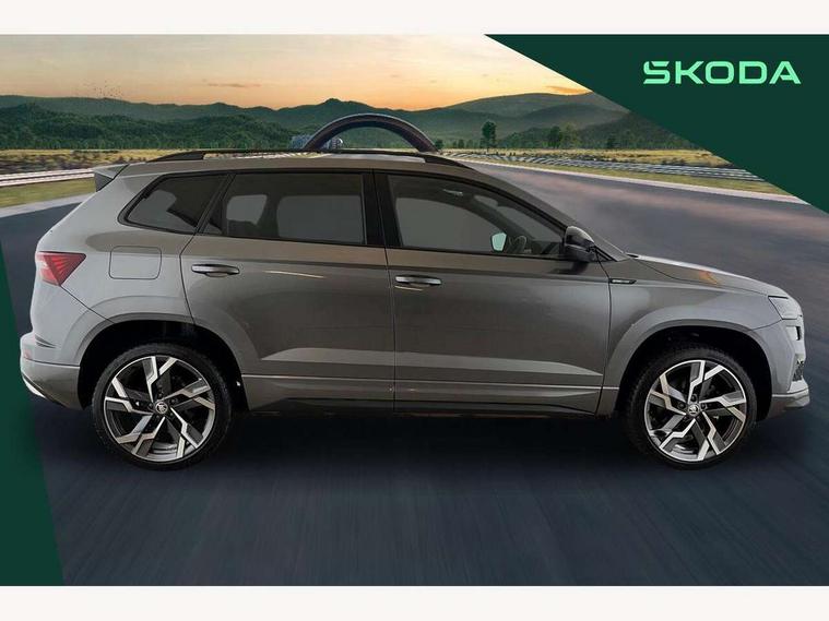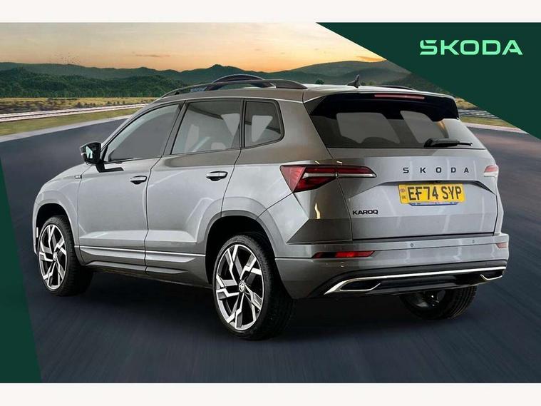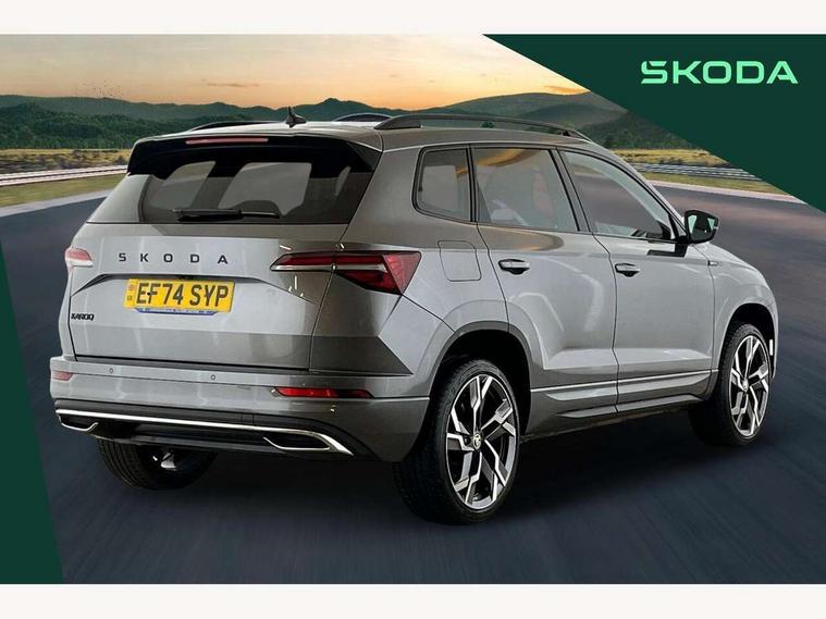 8" Digital display, Advanced driver attention and drowsiness monitor, Emergency services call system, Outside temperature gauge, Sensor for driver assistance systems, Service interval indicator, SmartLink wireless for Apple and wired for Android, Start/stop system with regenerative braking, USB C Port x 2 in front centre console, Virtual Cockpit - 10.25" digital display, Virtual pedal with electrically operated boot door, Wireless smartphone charging, DAB radio with Bluetooth, USB connection, Acoustic glass, Aero front windscreen wipers with intermittent function, Auto dimming rear view mirror with light and rain sensors, Black door mirrors, Black electric window control buttons, Black radiator grille, Black roof rails, Body colour door handles, Electric front and rear windows with child proof lock, Front door steps with SportLine logo, Heated rear windscreen, LED daytime running lights, LED rear lights with high functionality welcome effect and dynamic indicators, Light assistant (coming/leaving home/tunnel light), Panoramic sliding sunroof, Plastic scuff plates in door apertures, Privacy glass, Protective door side sills in body colour, Rear diffuser, Rear side wing doors, Rear spoiler, Rear window wiper with washer system and intermittent control, Safety reflectors on front doors, Skoda lettering on tailgate in black, Sportline badge on front fender, Sportline decorative inserts with badging, Sports front and rear bumpers, Third brake light, 1.5 litre bottle holders in driver and front passenger door panels, 12V socket in boot, 12v socket in front centre armrest with storage compartment and rear air vents, 2 x Tablet holder, 3 rear height adjustable headrests, 3 seat bench in 2nd row, 3 spoke sports leather heated multifunction steering wheel, 4 foldable roof handles with rear coat hooks, Black floor carpet, Black roof headlining, Chrome inner door handles, Foldable hooks in the boot, Front head restraints, Height adjustable front three point seats belts with tensioners, Height/reach adjust steering wheel, Ice scraper, Illuminated glovebox, Illuminated luggage compartment, Isofix child seat preparation for front passenger seat, Isofix child seat preparation outer rear, Manual lumbar support for front seats, Pen holder, Pollen filter, Rear boot cover, Rear reading lights, Rear seats fixed folding and divided 60:40, Rubbish bin door, Safety vest holder, Single front passenger seat, Storage box in upper central dashboard closed, Sunvisors with illuminated vanity mirrors, Textile floor mats, Ticket holder, Titan black interior ceiling, Umbrella under passenger seat, Under passenger seat storage compartment, LED Interior lighting pack with Skoda welcome logo - Karoq, Light Pack - Karoq, Non Smokers pack, Automatic door unlocking in case of crash, Automatic fuel cut off in case of crash, Driver airbag, Electronic parking brake with auto hold function, Emergency rear braking signal, ESC (incl. ABS+MSR+ASR+EDS+HBA+DSR+RBS+MKB), Front side airbags, Head airbags, Hill hold control, Knee airbags, Passenger airbag with switch-off function, Pedestrian monitor, Seatbelt reminder signalisation and pretensioner for all seats, Three point seatbelts rear, Two tone horn, Tyre pressure monitor, Alarm with interior monitoring, back up horn and tilt sensor with safe function, Electronic engine immobiliser, Keyless entry and start/stop, Remote central locking with 2 remote folding keys, Black air vent surround, Black centre console, carbon door decor, Satin black dashboard, Satin black door trim, 19" Sagittarius anthracite alloy wheels, Anti-theft wheel bolts protection, Breakdown and tool kit,