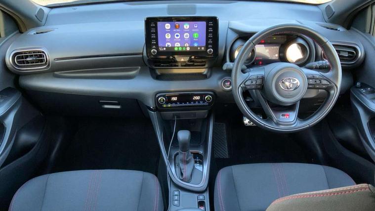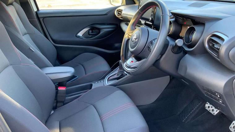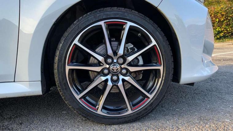Adaptive cruise control, Adjustable speed limit with speed warning, Bluetooth connectivity, Colour binocular inspired displays with digital speedometer, E-call, Electric power steering, Hybrid energy display, Multi information display switches on steering wheel, Reversing camera, Smartphone integration with Apple CarPlay and Android auto, Voice recognition, Vehicle Stability Control (VSC), 6 speakers, 8" Multimedia display touch screen, Toyota Touch 2 with DAB, USB connection, Acoustic windscreen glass, Auto windscreen wipers, Automatic headlights, Body coloured door mirrors, Dark chrome lower front grille, Electric adjustable heated door mirrors, Follow me home headlights, Front auto power windows with anti jam protection, Full LED rear lights, LED daytime running lights, LED front fog lights, LED front light guide, LED Headlights, LED High mounted stop lamp, LED Indicators, LED rear light guide, Manual headlight levelling, Painted chequered front grille with hot stamp in mesh design, Rain sensor, Rear auto power windows with anti jam protection, Rear privacy glass, Rear side wing doors, Rear spoiler, Rear wiper, Shark fin antenna, Turning signal integrated indicators in door mirrors, 3 adjustable rear headrests, 3 spoke leather steering wheel, 60/40 split folding rear seat, Active headrests, Adjustable boot height, Black roof lining, Coat hooks in rear grab handles, Cup holders (2 front & door), Data Communication Module (DCM) connected services, Dual zone automatic air conditioning, Fabric upholstery with red stitching, Front armrest, Front sport seats, Glovebox, Height adjustable driver's seat, Height adjustable passenger seat, Isofix seat fixing, Leather gearshift, Map pockets on the backs of the front seats, Pollen filter, Shopping bag hooks, Single front passenger seat, Tilt/telescopic steering column, 3 point seatbelts on all rear seats, ABS+EBD+Brake assist, Electronic parking brake, Emergency brake light system (EBS), Front passenger airbag on/off switch, Front seatbelt reminder, Hill start assist control (HAC), Rear child proof door locks, Rear seat belt reminder, Supplemental Restraint System (SRS) 8 airbags: Driver & passenger's airbags, dual side curtain airbags, side impact airbags, front centre airbag, Toyota Safety Sense 2, Precollison + Night time Pedestrian & Cyclist Detection, Lane Trace Assist, Auto High Beam, Intelligent ACC & Road Sign Assist, Tyre pressure warning system, 2x Master key, Alarm/immobiliser, Keyless smart entry with push button start, Remote AC via MyT, Remote locking via MyT, Remote powered central double locking doors, GR Sport interior styling with accents and exterior styling, Piano black interior trim, Soft touch instrument panel, Space saver spare wheel,