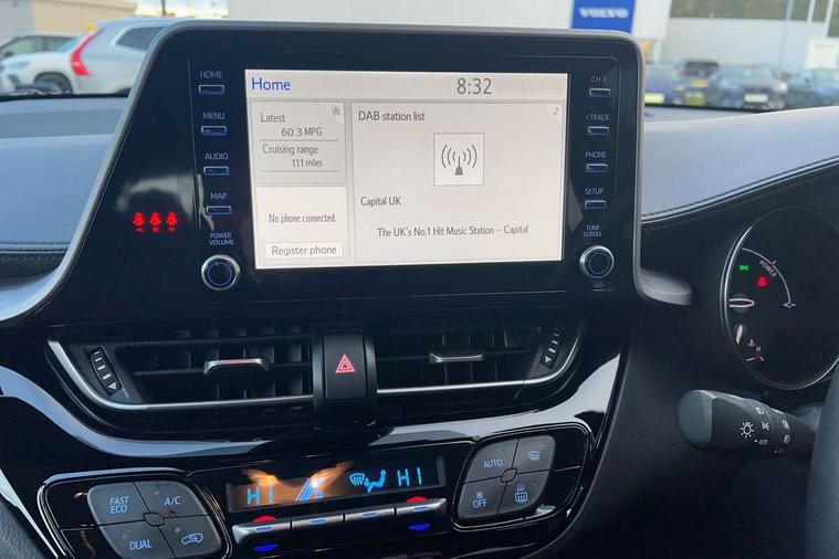 4.2" coloured TFT screen for multi-information display, Adaptive cruise control, Apple car play and Android auto, Bluetooth connectivity, E-call, Electric power steering, Hybrid system indicator, Lane departure alert with steering control, Lane trace assist, Push button start, Push button tailgate release, Remote boot door release in cabin, Remote boot door release in key, Reversing camera, Road sign assist - RSA, Smart voice assist, Trip computer, Voice recognition, Vehicle Stability Control (VSC), 6 speakers, AM/FM radio, DAB Radio (Digital Audio Broadcasting), Toyota touch 2 multimedia system with 8" display, USB connector, Wi-fi connectivity, Anti-jam protection on power windows, Auto high beam, Auto up and down function on all power windows, Automatic headlights, Automatic headlights cut-off, Black and body coloured rear bumper, Black lower front grille, Black upper front grille, Body colour door handles, Body colour door mirrors, Body colour front spoiler lip, Body coloured front bumper, Boot door release with push button, Electric heated door mirrors, Follow me home headlights, Front and rear power windows, Front fog lights, Headlight cut off reminder, Honeycomb lower front grille, LED daytime running lights, LED High mounted stop light, LED rear brake lights, LED rear combination lights, Manual headlight levelling, Manually retractable door mirrors, Noise reduction layer on front windows and windscreen, Power adjustable door mirrors, Rear side wing doors, Rear spoiler, Rear tailgate, Rear window defogger, Rear window wiper, Reflective LED headlights, Shark fin antenna, UV-filter on driver and passenger windows, UV-filter on rear windows, Variable front intermittent wipers, 12v power outlet - front, 3 rear headrests, 3 seat bench in 2nd row, 3 spoke leather steering wheel, 60/40 split folding 2nd row rear seats, Adjustable rear headrests, Adjustable speed limiter switch on steering wheel, Assist grips front and centre pillar, Audio and telephone switches on steering wheel, Black front door assist grips, Boot light, Chrome interior door handles, Cloth upholstery, Driver and front passenger personal light, Driver and front passenger Whiplash Injury Lessening seats, Dual zone automatic air conditioning, Floor mats, Front cupholders, Front head restraints, Front sports seats, Glovebox with internal light, Hard tonneau cover, Hooks for luggage holding net, Humidifying Nanoe air purifier, Illuminated entry system, Isofix attachments on outer rear seats, Leather gearshift, Light on driver sun visor, Light on passenger sun visor, Manual telescopic steering wheel, Manual tilt steering wheel, Manually adjustable lumbar support on driver seat, Manually height adjustable driver seat, Manually height adjustable front passenger seat, Manually reclining driver seat, Manually reclining front passenger seat, Manually sliding driver seat, Manually sliding front passenger seat, Microphone on front personal light, Mirror on driver sun visor, Mirror on passenger sun visor, Multimedia switches on steering wheel, Pollen filter, Shopping bag hooks, Single front passenger seat, Slow opening on lower glovebox, Voice recognition switch on steering wheel, 16 Disk front wheel brake, 3x3 point rear seatbelts, ABS+EBD+Brake assist, Electronic parking brake, Front and rear seatbelt reminder, Front passenger airbag on/off switch, Hill start assist control (HAC), Pre collision system with pedestrian detection, Pre-tensioners and force limiters, Rear door child safety locks, SRS Airbags - Driver + Front passenger, front side, front and rear curtain and driver's knee airbags, Toyota safety sense, Tyre pressure monitoring system, Tyre pressure warning system, Acoustic vehicle alert system (AVAS), Glass-breaking alarm sensors, Immobiliser, Intrusion alarm, Intrusion sensor, Motion sensor alarm, Power door locks, Power passenger window lock, Remote central locking, Black lower dashboard, Black upper dashboard, Grey deco line on upper dashboard, Matte black centre console, Tyre repair kit,