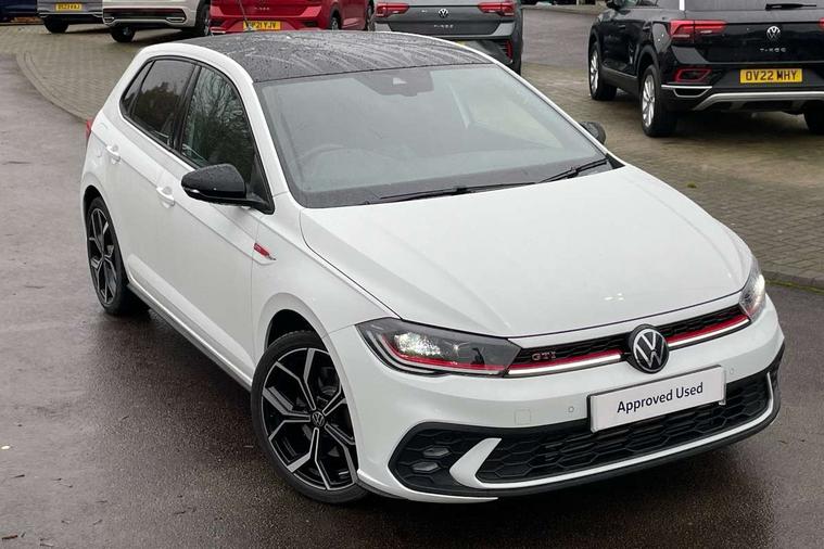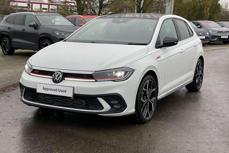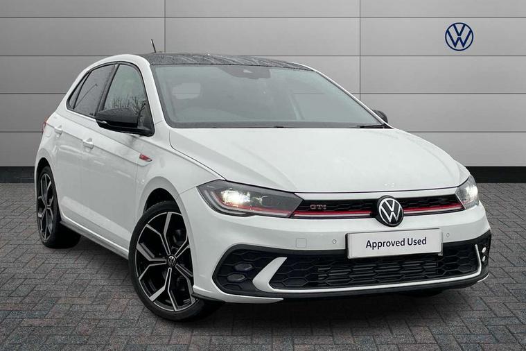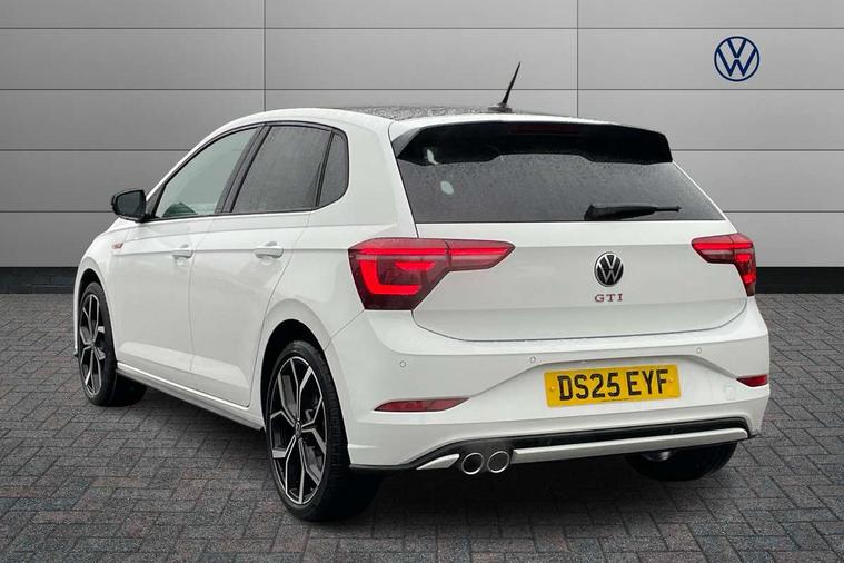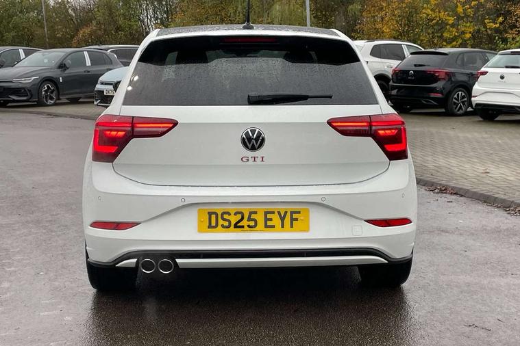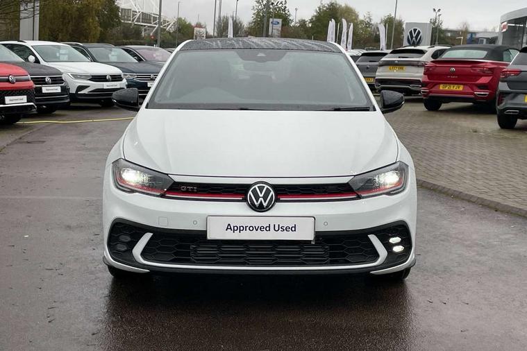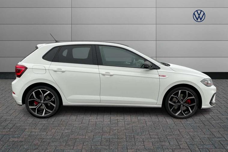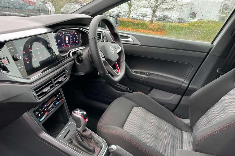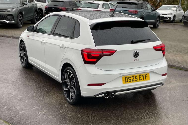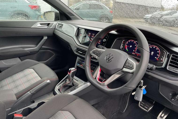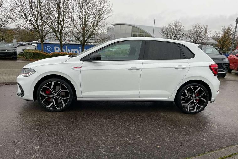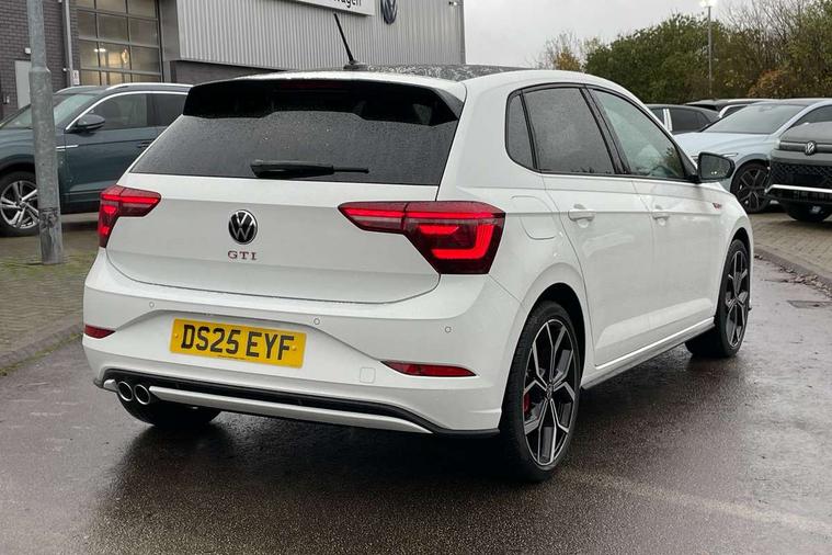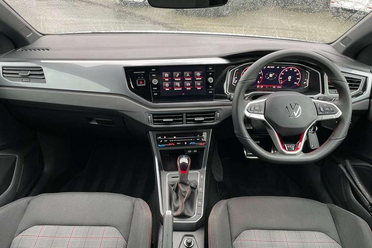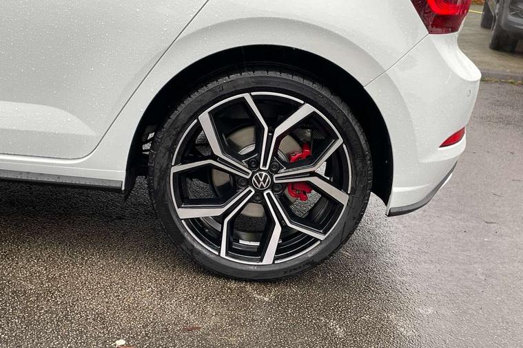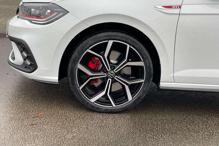 Adaptive cruise control with follow-to-stop and speed limiter, Advanced driver attention and drowsiness monitor, Bluetooth mobile phone interface, Digital Cockpit Pro with 10.25" Display, Dynamic road sign display, Eco mode, Emergency call service, Multifunction camera, Power assisted speed sensitive steering, Preparation for We connect and We connect plus, Speedo and rev counter, electronic odometer, trip, service interval display and fuel gauge, Travel Assist - Lane keeping system and traffic jam assist, Travel assist including emergency assist, Trip computer, Warning signal and warning light for front and rear seatbelts not fastened, Washer fluid level indicator, Wireless app connect, Adaptive chassis control, Front wheel drive, Heavy duty rear axle, Rear shock absorpion sports version, Sports select suspension lowered by 15mm, Start-stop system with battery regeneration (recuperation - energy recovery during braking), DAB Digital radio, Diversity antenna for FM reception, Front and rear 6 speakers, Body colour bumpers, Body colour door handles, Electric front windows, Front scuff plates in aluminium with GTI logo, Heat insulating glass windscreen, Power folding adjustable/heated exterior mirrors and front passenger exterior mirror lowering function, Rain sensor, Rear electric windows, Rear fog light, Rear side wing doors, Rear windscreen washer and wiper with interval delay, Sport bumpers with air intakes with honeycomb structure, Third brake light, Twin chrome exhaust tailpipes, 12V power socket in centre console, 2 USB-C ports in the front, 2 USB-C charging sockets on the center console in the rear, 3 rear head restraints, 60/40 split folding rear seat and rear seat bench not split, Air care climatronic air conditoning system with active combination filter and 2-zone temperature control, Black roof lining, Carpet mats, front and rear, Chrome plated radiator grille inserts, air vent surrounds and light switch surrounds, Door and side trim panel, Driver and front passenger seat height adjustment, Driver/passenger sunvisors with illuminated vanity mirrors, Front centre armrest, Front footwell illumination, Front seat backrest storage pockets, GTI sports gearshift knob in aluminium leather, Handbrake lever handle in leather, Headliner in recycled material, Isofix child seat preparation easy-fit (for two outer rear seats, and front passenger seat) compatible with I-size, LED interior light with switch off delay and dimmer, 2 reading lights front and rear, Luggage compartment cover, Luggage compartment floor, Luggage compartment lighting, Lumbar adjustment for front seats, Single front passenger seat, Stainless steel pedals, Standard pedal cluster, Three spoke leather wrapped multifunction sports steering wheel with shifting paddles, IQ LED matrix headlights pack - Polo, Light and sight pack - Polo GTI, 3 point height adj front seatbelts + pretensioners, 3x3 point rear seatbelts, ABS, Driver and front passenger airbag with front passenger airbag deactivation, Drivers and front passengers safety optimised head restraints, ESC (Electronic stability control) + EDL (Electronic Differntial lock) and ASR (Traction control), Extended and predictive pedestrian/ cyclist protection, Front and rear disc brakes with red brake calipers, Front curtain and side airbags with center airbag, Hill hold control, Manual child lock in rear doors, Two tone horn, Tyre pressure loss indicator, Alarm with interior protection, Anti-theft alarm system with interior monitoring, backup horn, and towing protection, Anti-theft wheel bolts, Electronic engine immobiliser, Chrome applications on rotary light, mirror adjustment, window regulator switches, outlet with frame in black, Low rolling resistance tyres,