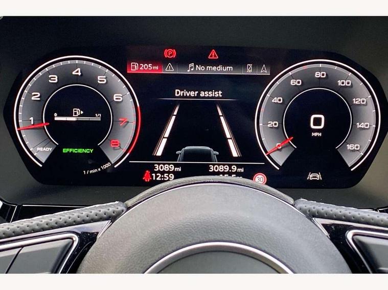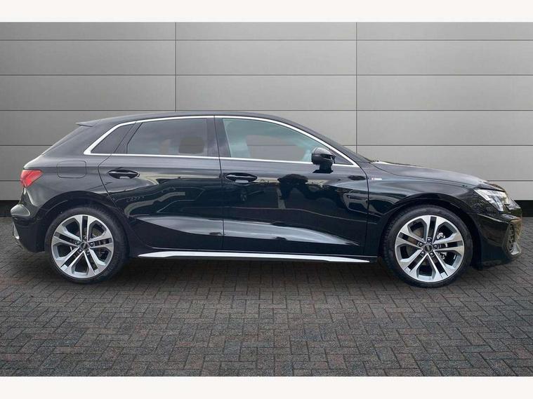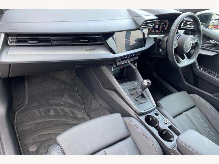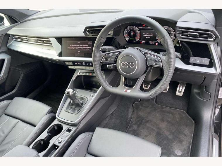 Adjustable speed limiter, Audi drive select, Audi smartphone interface with app store includes wireless Apple carplay, Android auto and Amazon alexa integration, Audi virtual cockpit plus - 12.3" full HD resolution dynamic digital instrument cluster, Automatic start/stop system with recuperation, Bluetooth interface, Camera based traffic sign recognition, Collision avoidance assistant, Cruise control, Distraction and Fatigue warning, e-Call (emergency call), Electromechanical power speed sensitive steering, Lane departure warning system, MMI Navigation Plus with high resolution 10.1" colour touch screen display, Park Assist with parking system Plus, Service indicator, Tailgate, Trip computer, Voice control system with natural language interaction, Sports suspension, Audi Phonebox light with wireless charging, Audi sound system - 10 loudspeakers including centre loudspeaker and subwoofer, DAB Digital radio, USB ports with charging function in the rear, Acoustic glass windscreen, All weather light, Aluminium window trim, Auto dimming frameless rear view mirror, Automatic dynamic range control, Body colour exterior mirrors, Chrome exhaust tailpipes, Dipped beam, main beam, position light and turning light, Electrically adjustable/heated/folding/auto dimming door mirrors with integrated LED indications + kerb view function for passenger side, Exterior model badging, Front and rear side air inlets in grained matt black with dark liquid chrome frame, Front electric windows, Front radiator grill in high gloss dark chrome, Heat insulating glass windscreen, Illuminated door sills with aluminium inserts at the front with S logo, Intersection light, LED 3rd brake light, LED brake lights, LED daytime running x3, LED headlights with LED rear lights and dynamic rear indicators, LED rear number plate lights, LED reverse light, LED tail lights, Light and rain sensors, Manoeuvring light, Motorway light, Privacy glass - dark tinted rear window, rear door and side windows, Rear diffuser and grill in grained matt black with inlay in dark liquid chrome, Rear electric windows, Rear side wing doors, Rear wiper, S line bumpers, S roof spoiler, Side S line emblems on front wings, Side sill trim in dark liquid chrome, Static Cornering lights, 12V socket and storage compartment in front centre console, 3 seat bench in 2nd row, 3 spoke flat bottomed multi-function leather sport steering wheel, 3-zone deluxe automatic air conditioning, 4 way electrically adjustable lumbar support for driver and front passenger, 40/20/40 split folding rear seat bench, Black cloth headlining, Black front and rear floor mats, Front and rear centre armrest in artificial leather with contrasting stitching on armrests and instrument panel, Front and rear headrests, Heated front seats, Height and reach adjustable steering wheel, Manual boot compartment lid, Manually adjustable front seats, Rear centre armrest with cupholder, S badging on the steering wheel, Seat side bolsters, Single front passenger seat, Stainless steel pedals and front footrest in black, Twin leather upholstery with front sports seats S embossed logo, Aluminium interior elements pack - A3, Multi-coloured LED interior lighting package with Multi-coloured contour lighting of instrument panel - A3, 3x3 point rear seat belts, Driver and front passenger airbag with passenger airbag deactivation, Electronic Stabilisation Control (ESC) including ABS, ASR and EDL, First aid kit with warning triangle and 2 safety vests, Front side airbags with head airbags and interaction airbag, Hill hold assist, Pre-sense front with pedestrian and cyclist detection, Seatbelt monitoring, Tyre pressure loss indicator, Anti theft alarm, Anti-theft wheel bolts, Electronically operated child locks, Immobiliser, Remote central locking with safelock, Black dashboard, Inlay in dark aluminium spectrum,