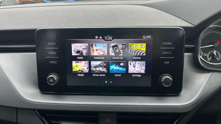 Bluetooth system, E-call, Front assist system, PAS, Service indicator, Speed limiter, Wireless Smartlink for Apple CarPlay (wired for Android Auto), 8 Speakers, Auxiliary input socket, DAB Digital radio, Body colour bumpers, Body colour door mirrors and handles, Chrome grille surround, Dimming rear view mirror with black surround, Electrically adjustable and heated door mirrors, Front and rear electric windows, Headlight range control, Heated rear window, LED rear lights - low functionality, LED third brake light, Light sensors, Rain sensor, Rear fog lights, Rear side wing doors, Rear wiper, 12V Accessory socket in centre console, 3 seat bench in 2nd row, Chrome inner door handles, Cloth upholstery, Front head restraints, Glove compartment with illumination, Ice scraper, Isofix child seat fittings on outer rear seats, ISOFIX on front passenger seat, Manual lumbar support for front seats, Rake/reach adjustable steering wheel, Reading lights, Single front passenger seat, Sun visors with illumination on front passenger, Textile floor mats, Third rear headrest, Top tether for front passenger seat, Umbrella in driver's door, 3x3 point rear seatbelts, Airbags - driver and front passenger, ESP, Front passenger airbag deactivation switch, Front side airbags with curtain airbags, Hill hold control, Manual parking brake, Manual rear child locks, One tone horn, Rear disc brakes, Seatbelt reminder for driver an co-driver, Traction control, Tyre pressure monitor, Anti-theft alarm system with interior monitoring, backup horn, towing protection and remote central locking with SAFE system, Anti-theft wheel bolts, Electronic engine immobilizer,