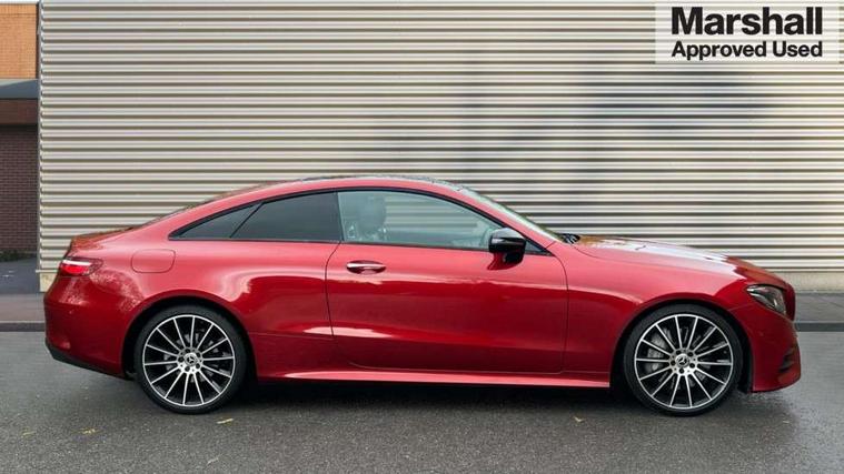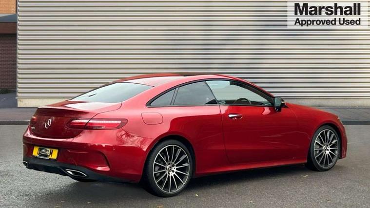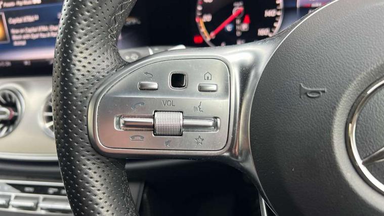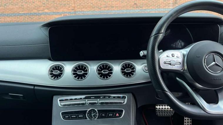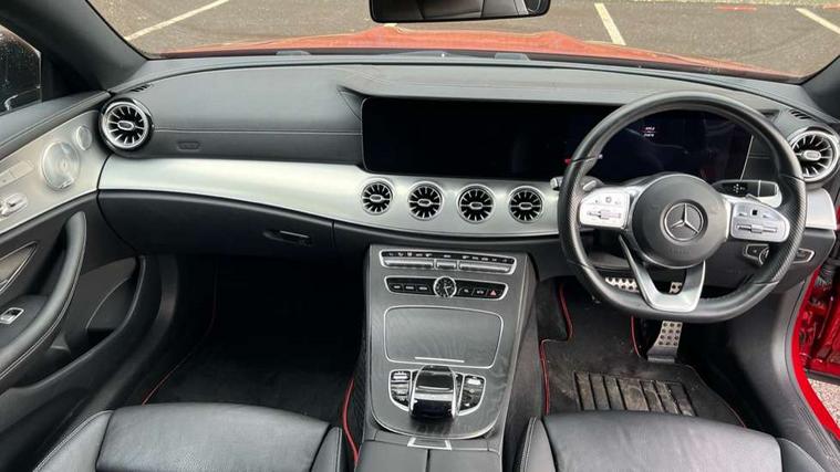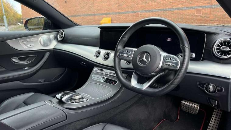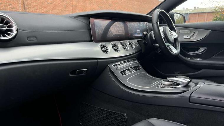 360 degree parking camera, Active parking assist including front and rear parking sensors, Analogue clock, Attention assist, Blind spot assist, Bluetooth interface for hands free telephone, Brake wear warning display, Cockpit display 12.3" widescreen digital instrument cluster, Collision prevention assist plus, COMAND online HDD navigation with Radio/Media interface, linguatronic + smartphone integration/Apple CarPlay/Android Auto and 12.3" Cockpit display, Direct steer speed sensitive steering, Direct steering, DYNAMIC SELECT with a choice of driving modes (ECO, Comfort, Sport, Sport+ and Individual), ECO start/stop function, Engine start/stop button, Mercedes connect me, Multi function trip computer, Outside temperature display, Remote boot release, Service indicator (ASSYST), Status display for rear seat belts in instrument cluster, Touchpad with control wheel, Wireless charging, 66 litre fuel tank, 2 USB ports in centre console, Audio 20 with USB, touchpad and control wheel with Media Interface with Bluetooth interface and hands-free function, Burmester surround sound system with 13 speakers and a 9 channel amplifier with total output of 590 watts, DAB Digital radio, Adaptive brake lights, AMG bodystyling front and rear aprons, side skirts, AMG boot lid spoiler in body colour, AMG front, rear apron and side skirts, Body colour door handles, Body coloured bumpers, Electric windows with one touch opening/closing and obstruction sensors, Exterior mirrors heated and electronically adjustable, Fog lights, Illuminated front door sill panels with Mercedes-Benz lettering, Magic Vision Control heated windscreen wiper system, Multibeam LED Intelligent Light System with Adaptive Highbeam Assist, Panoramic electric glass sunroof, Pre-installation for roof rail systems, Privacy glass Includes rear side windows and rear windscreen, Rain sensing windscreen wipers, Rear LED lights, Sports exhaust system, Top surround of side windows in polished aluminium, Visible twin pipe exhaust system integrated into bumper, 3-spoke flat bottom multifunction AMG steering wheel with Touch Control buttons, trimmed in black nappa leather, 4 way adjustable front head restraints and 2 way rear head restraints, 40:20:40 split folding rear seats, Artico man-made leather upper dashboard and beltlines with contrast stitching, Automatic child seat recognition sensor, Automatic two zone climate control, Bag hook in luggage compartment, Belt feeder driver and front passenger seat belt automatically positioned within easier reach, Black roof lining, Central stowage compartment with 12 V socket in centre console, Centre armrest and door handle illumination, Chrome door pins, Easy entry seats, Floor mats with AMG lettering, Front and rear door pockets, Front centre armrest with stowage compartment, Front footwell lights, Glasses compartment in overhead control panel, Glove compartment - lockable, air conditioned and illuminated, Heated front seats, Interior lighting - 64 colour Ambient lighting, Interior rear light/integral reading lights, Isofix rear child seat fastenings, Multi contour front sports seats, Multi function steering wheel, Rear centre armrest with 2 cupholders + storage, Seat occupancy sensor for front passenger seat, Sports pedals in brushed stainless steel with black rubber studs, Steering column manually adjustable for height and reach, Steering wheel gearshift paddles, Steering wheel touch control buttons for audio and onboard settings, Storage net in luggage compartment, Sunvisors with illuminated vanity mirrors, Twin front cupholders, Keyless Go comfort pack - E Class, Memory pack - E Class, Mirror pack - E Class, Stowage pack - E Class, Active bonnet, Active brake assist, Adaptive brake system, Adaptive driver and front passenger airbags, Anti-lock braking system (ABS), Crash sensor (auto door unlocking), Drivers knee airbag, Electric parking brake, Electronic Stability Programme, Front and rear window airbags, Front seatbelt pretensioners, Front side airbags, Head airbags, Hill hold function, Perforated front brake discs with "Mercedes-Benz" lettering, Seatbelt warning, Three point rear seat belts, Tyre pressure monitoring system, Warning triangle and first aid kit, Alarm system/interior protection/immobiliser, Central locking with interior switch, automatic locking and crash sensor with emergency opening function, Chrome surround in electric key, Black open pore ash wood, Open pore black ash wood centre console, Run flat tyres,