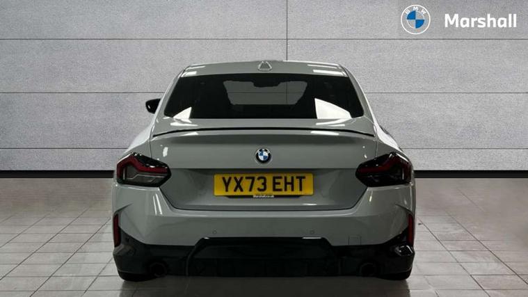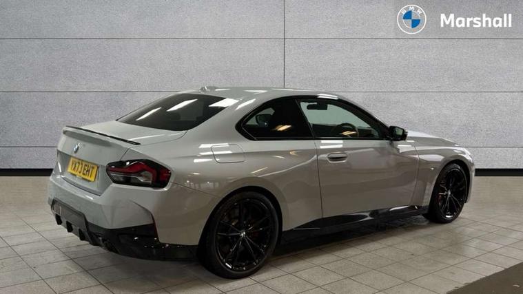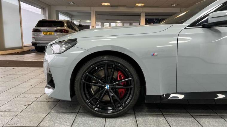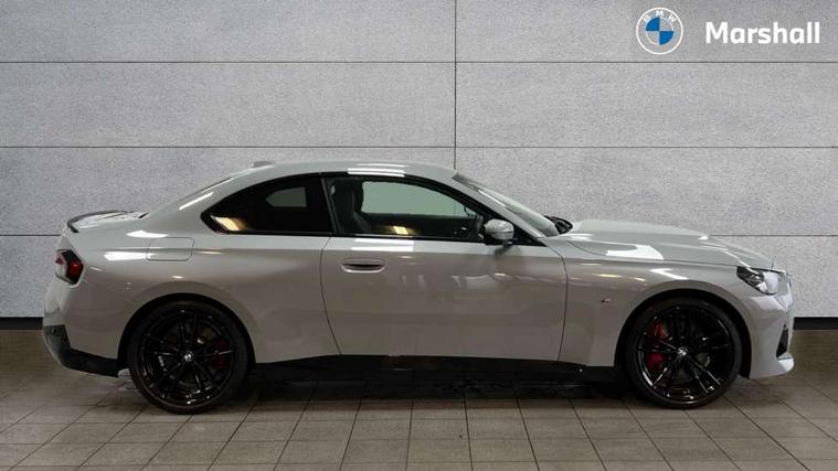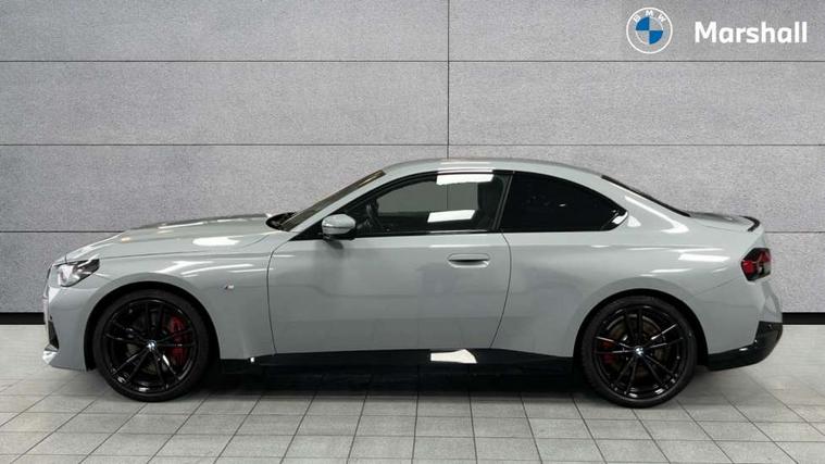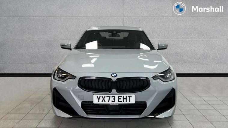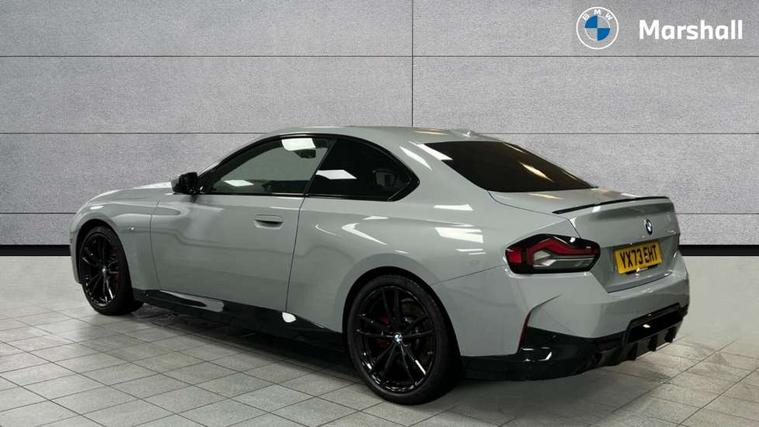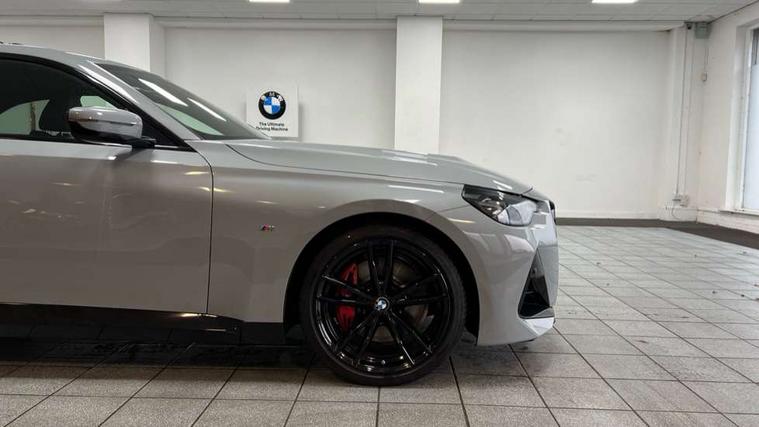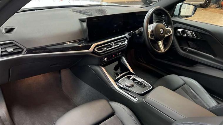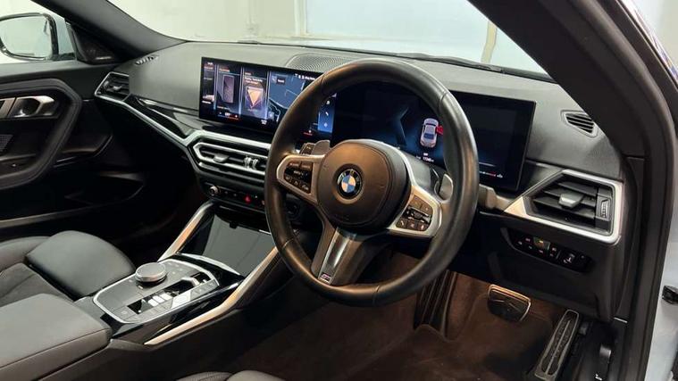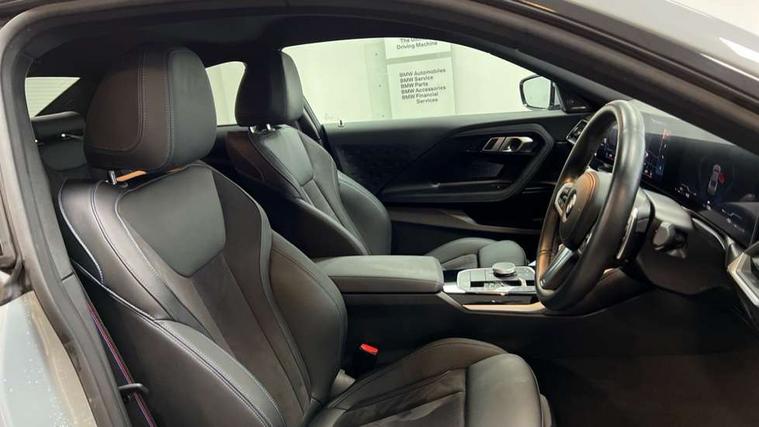 2 USB connections for charging and transferring data, 4G LTE connectivity with hard wired 4G network sim card, Attentiveness assist, Bluetooth with USB, BMW ConnectedDrive online services, BMW Intelligent Personal Assistant, BMW operating system 8 with variable, configurable widgets display information in real time, BMW Teleservices, Check Control warning system for monitoring of lights and door/luggage compartment open warning, Direct selection buttons, Drive off assistant, Eco pro mode, Electric power steering, Front and rear parking sensors, Front/rear Parking distance control, iDrive controller with turn and press function, Integrated owners handbook, Intelligent functions, Live cockpit plus with nav function 12.3" instrument cluster and 14.9" centre display, Oil sensor for level and grade, Optimum shift indicator, Personal Profile, Touch operation on control display, Variable sport steering, Widescreen multi-media display, WiFi interface for wireless connection of mobile terminal devices, Aluminium lightweight construction, Balancer shaft, BMW TwinPower Turbo four-cylinder petrol engine, Double VANOS, Drive performance control with ECO PRO comfort + sport mode, Electronic differential lock, High precision injection, M sport suspension, Petrol Particulate Filter, Sport automatic steptronic transmission with gearshift paddles, manual gearshift time display, launch control, coasting idle ECO PRO/COMFORT modes, Twin scroll turbocharger with Valvetronic, DAB tuner, Acoustic windscreen wipers for reduced driving noise, Adaptive LED Headlights, Automatic windscreen wipers and automatic headlight, Automatically dimming rear view mirror, Body colour door handles flush with door surface, Body colour door mirrors, Body colour front and rear bumpers, Daytime running lights, Electric windows - front and rear, with open/close fingertip control and trap release, Exhaust tailpipes x2 - 90mm in left and right, Fading support, Front and rear bumper system with replaceable deformation elements, Front door sill finishers in black plastic with BMW designation, Front windscreen wipers with integrated washer jets, Green tinted heat protection glazing, High beam assistant, High gloss black sill, bumper trim sides and diffuser insert, High gloss shadowline exterior trim in mirror triangle cover, mirror cover panel, mirror bezel and window border, High level third brake light, Indicators integrated int mirror housing, LED registration plate light, LED technology rear tail lights, brake lights and turn indicators, Lightweight engineering, Model designation on right side of tailgate, One piece kidney grille with hight gloss chrome surround, Rear boot, Rear fog lights, Reversing light in rear light cluster, Shark fin antenna, Single part LED rear lights with smoked glass components, Trailer stabilisation logic, Visible VIN plate, 12V power socket in front centre console with blanking plug, 2 cupholders in front centre console, 2 zone automatic air conditioning, Ambient lighting, Compartment in front of cupholder, Conditioned based service, Driver seat backrest width adjustment, Front and rear side armrests integrated into door trim, Front armrest, Front door pockets, Front head restraints, Front sport seats, Heated front seats, Illuminated glove compartment with separate small compartment, M headliner Anthracite, M sport leather steering wheel, Manually adjustment steering wheel column, Rear seat backrest with manual 40:20:40 split folding, Rear seat centre foldable armrest with integrated cup holder, Single front passenger seat, Storage compartment between rear seats, Storage tray and compartment with cover in centre console, Sun visors with vanity mirrors and insert tab, Through loading system with 40/20/40 split folding 2 rear seat in 2nd row, Two folding rear seat headrests, Velour floor mats, Additional storage compartment pack without USB - 2 Series Coupe, Connected pack professional - 2 Series Coupe, Interior and exterior mirror pack - 2 Series Coupe, M Sport exterior styling aerodynamics pack - 2 Series Coupe, 2 tone horn, Anti lock braking system (ABS) with cornering brake control, Automatic Stability Control (ASC), BMW emergency call, Brake drying, Child seat ISOFIX attachment for the two outer rear seats, Crash sensor activating of airbags, Unlocking doors, hazard warning lights, interior light, safety battery terminal, Deactivation of fuel pump in the event of a crash, Driver and front passenger airbags, Driver and front passenger side airbags, integrated in the door side seat backrest bolsters for all seat variants, Dynamic brake control, Dynamic stability control + (DSC+), Dynamic Traction Control - DTC, Electrically operated hand brake including automatic hold function and automatic release when driving off, Front and rear disc brakes, Head airbags for all 4 outer seats, Manual deactivation of front passenger airbag, Seat belt security check for driver and front passenger, Seatbelt warning, Side impact protection, Three point seat belts on 4 seats including front belt stopper, pyrotechnic belt tensioners and belt force limiters, Tyre pressure sensor, Warning triangle and first aid kit, Alarm system (Thatcham 1) with remote control and electronic engine immobiliser, Central locking switch for all doors, fuel filler cap and luggage compartment, Deadlocking function system to all doors, Drive away locking system on all doors and luggage compartment, Locking wheel bolts, Start/Stop button (illuminated) in centre console with keyless engine start and Auto Start-Stop deactivation button, Two remote control key with integrated key - one button for open and close doors/fuel flap/tailgate and separate button for unlock luggage compartment, BMW mobility tyre sealing system, Electrically powered 12V compressor, Reduced rolling resistance tyres,