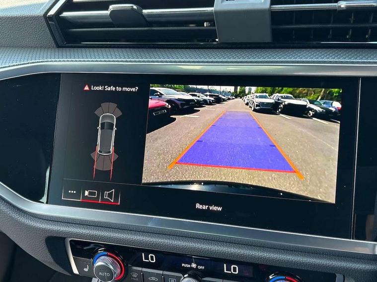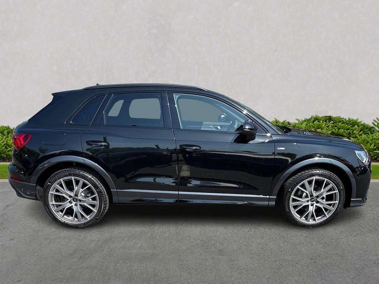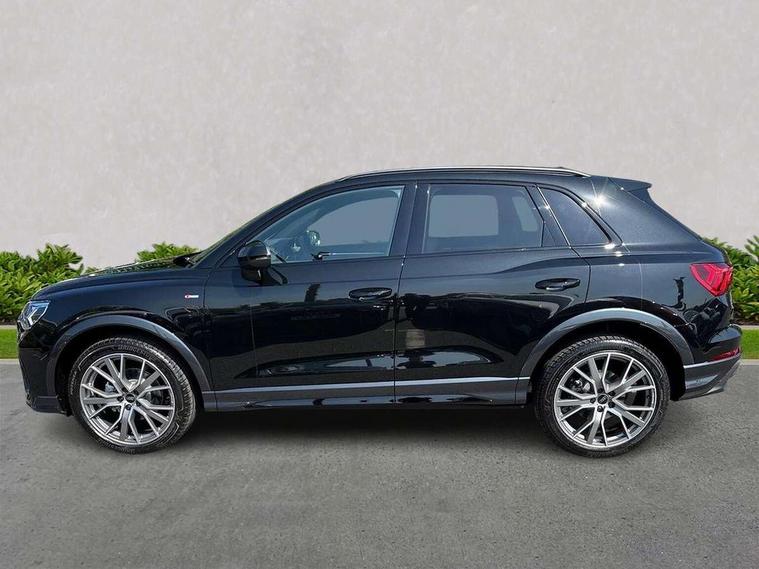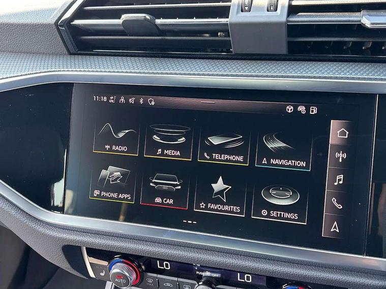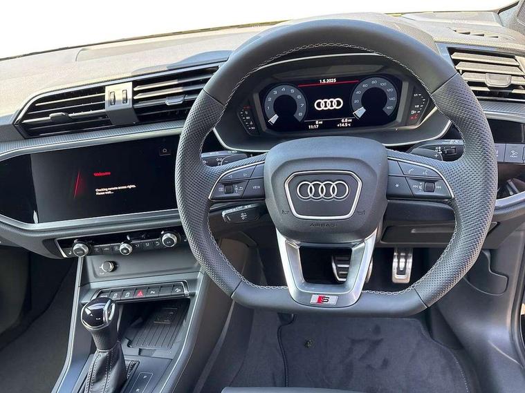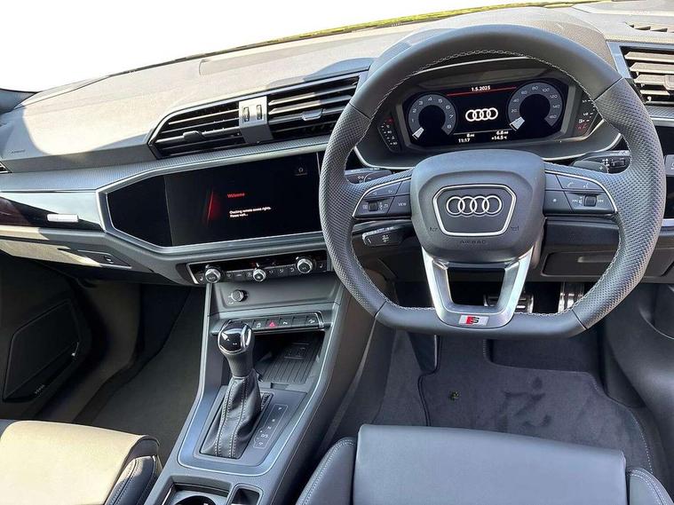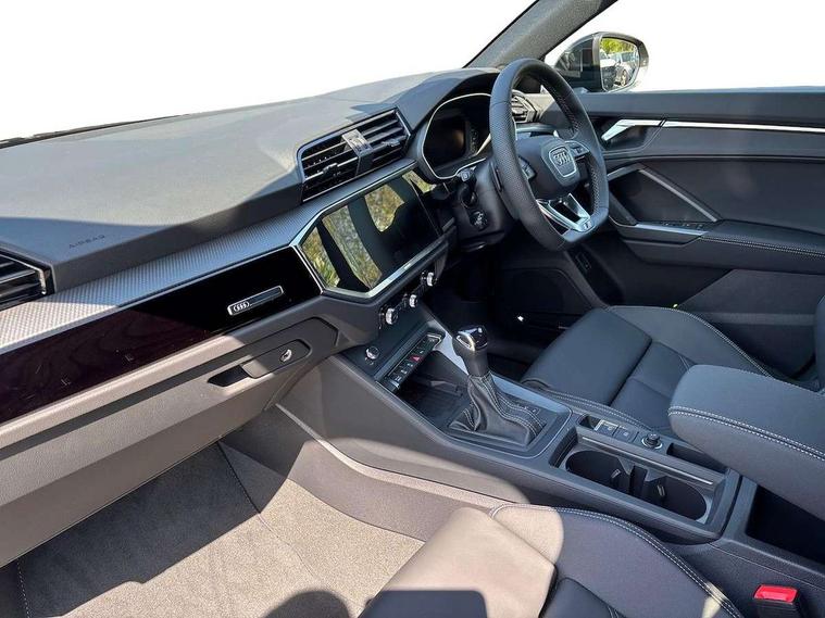 Amazon alexa Integration, Audi connect safety and service, Audi drive select, Audi lane departure warning, Audi Virtual Cockpit - 10.25" display, Bluetooth interface, Camera based traffic sign recognition, Distraction and Fatigue warning, Legal emergency call, MMI Navigation Plus with high resolution 10.1 inch touchscreen colour display, Power operated tailgate, Progressive steering, Service interval indicator, Smartphone interface includes wireless Apple carplay/Android Auto, Start stop system with recuperation, Voice control system with natural language interaction, Sports suspension, 2 USB-C ports with charge and data functions, 6 passive loudspeakers, DAB digital radio module, Acoustic windscreen, Audi Beam uses LEDs to project the Audi logo onto the ground as you exit your Q3, Auto dimming door mirrors, Auto dimming frameless rear view mirror, Black roof rails, Electrically folding, adjustable and heated door mirrors with integrated LED side indicators and kerb view function for passenger side, Front and rear electric windows, Front fog lights, Grille vertical bars in aluminium silver/Matt, High gloss black finish B and C pillars, LED Dynamic rear indicators, LED headlights with LED daytime running lights, LED rear lights, LED third brake light, Privacy glass dark tinted rear and rear-side windows (from B-pillar backwards), Rain and light sensors, Rear diffuser grille in grained matt black, Rear diffuser strip in matt anthracite black, Rear side wing doors, Rear wiper, S line bumpers in contrasting Manhattan grey, Variable front intermittent wipers, 12V socket in rear centre console, 3 seat bench in 2nd row, 40:20:40 folding with manual adjustment for 60:40 forwards/backwards position and backrest angle, Adjustable rear seat bench/backrest with centre armrest and cupholder, Black cloth headlining, Dual zone electronic climate control, Electric lumbar support, Front and rear black floor mats with contrast stitching in rock grey, Front and rear headrests, Front centre armrest, Height and reach adjustable steering wheel, Illuminated door sill trims with S logo, ISOFIX child seat mounting for front passenger with airbag deactivation and outer rear seat including top tether attachment point for outer rear seats, Manual front seats with height adjustment, Perforated leather gearknob, Single front passenger seat, Stainless steel luggage compartment sill finisher, Stainless steel pedals, Twin leather upholstery with front sport seats + S embossing, Black styling pack - Q3, Non smoking pack - Q3, 3x3 point rear seatbelts, 6 airbags - Driver, front passenger, curtain and side windows, Audi pre-sense front with pedestrain and cyclist recognition, Electrically operated child locks on rear doors, Electromechanical parking brake, Electronic stabilisation control including ABS, ASR and EDL, Front seatbelt reminder, Hill descent control, Hill hold assist, Pre sense basic, Seatbelt monitoring, Tyre pressure warning, Warning triangle and first aid kit, Anti theft wheel bolts, Immobiliser, Remote central locking, Thatcham approved category 1 anti theft alarm, Aluminium look interior elements, Detail dashboard around MMI touch colour display in glass look, black with surround in aluminium look, Leatherette door armrest, Piano black inlay,