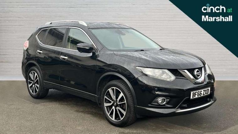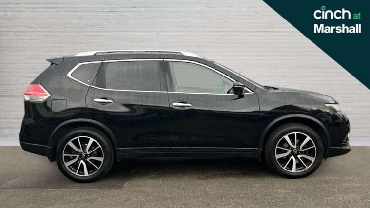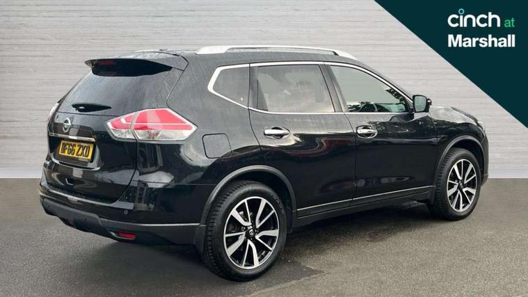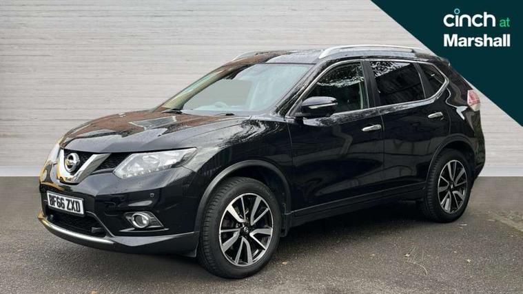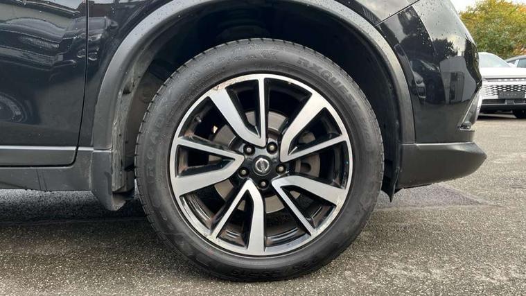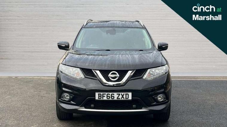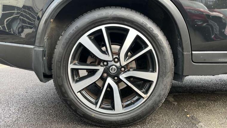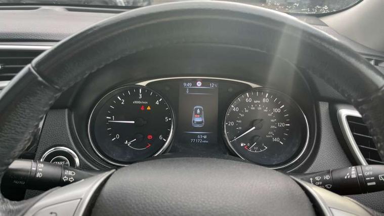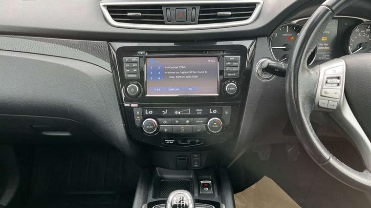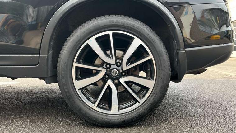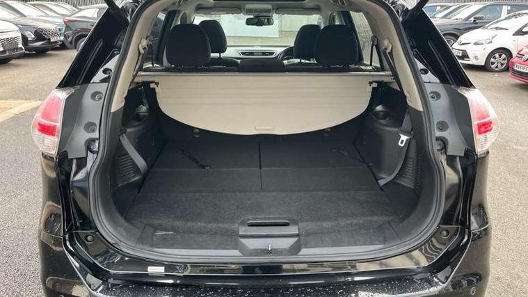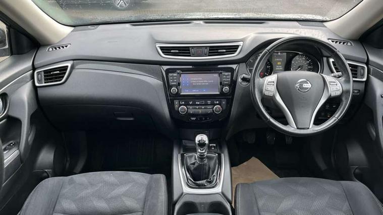 5" TFT driver information centre, Around View Monitor, Automatic tailgate opening, Bluetooth phone integration system, Cruise control + speed limiter, Engine start button, Front and rear parking cameras, Front and rear parking sensors, Lane departure warning system, Nissan connect sat nav system, PAS, Service interval indicator, Side view cameras, Traffic sign recognition, Trip computer, Diesel particulate filter, 6 speakers, Audio remote control in steering wheel, DAB Digital radio, Radio/CD, USB/aux input socket, Auto dimming rear view mirror, Automatic headlights, Automatic rain sensing wipers, Black honeycomb front grille, Body colour bumpers, Chrome door handles, Chrome window surround, Electric folding door mirrors, Electric panoramic sunroof, Electrically adjustable and heated door mirrors, Front and rear power windows, Front foglights with chrome rings, LED daytime running lights, Rear privacy glass, Rear wiper, Satin silver roof rails, 60/40 split folding rear seat, Cloth upholstery, Configurable luggage board system, Driver's seat manual height adjust, Dual zone climate control, Front and rear headrests, Front armrest, Isofix child seat attachment, Leather steering wheel and gear knob, Rake/reach adjustable steering wheel, Rear armrest, 3 point seatbelts on all seats, ABS, Child locks on rear doors, Driver and passenger airbags, EBD + Brake Assist, Electronic parking brake, ESP + traction control, Forward emergency braking, Front and rear curtain airbags, Hill start assist, Tyre pressure monitoring system, Warning triangle, Alarm, Immobiliser, Intelligent Key, Remote central locking, Metal grain interior trim, 19" 5 spoke alloy wheels, Space saver spare wheel,