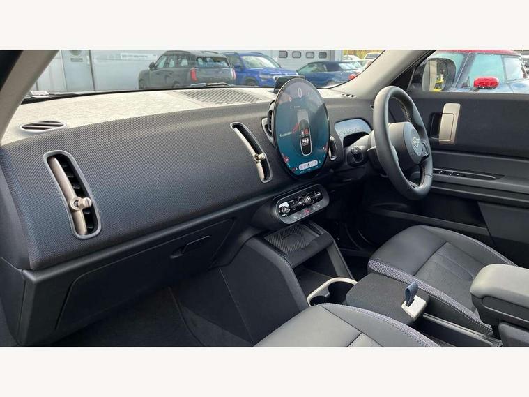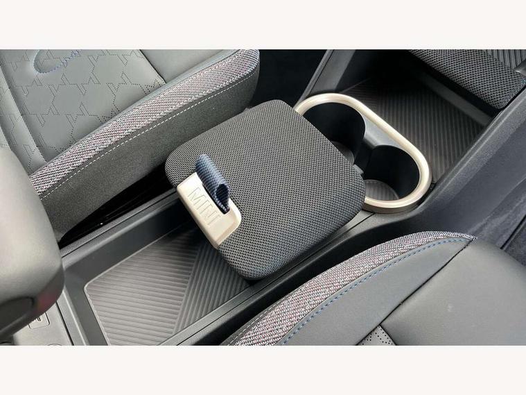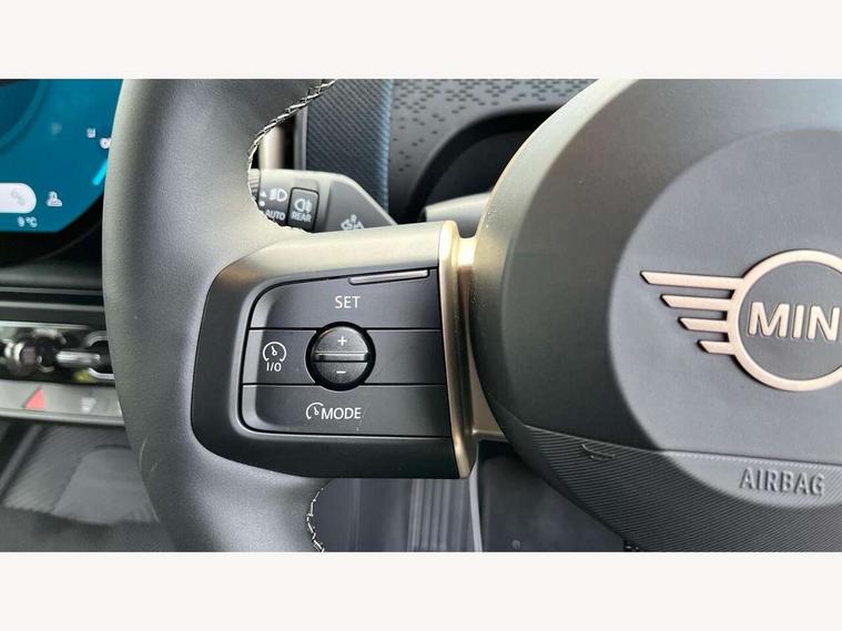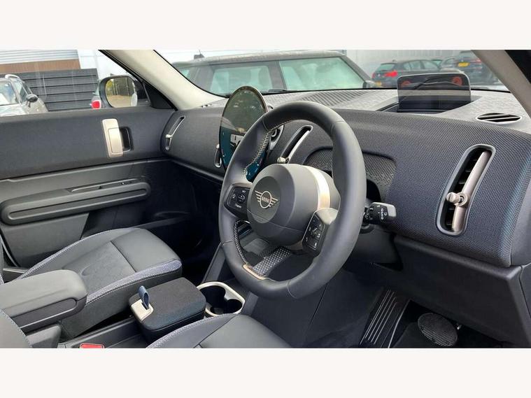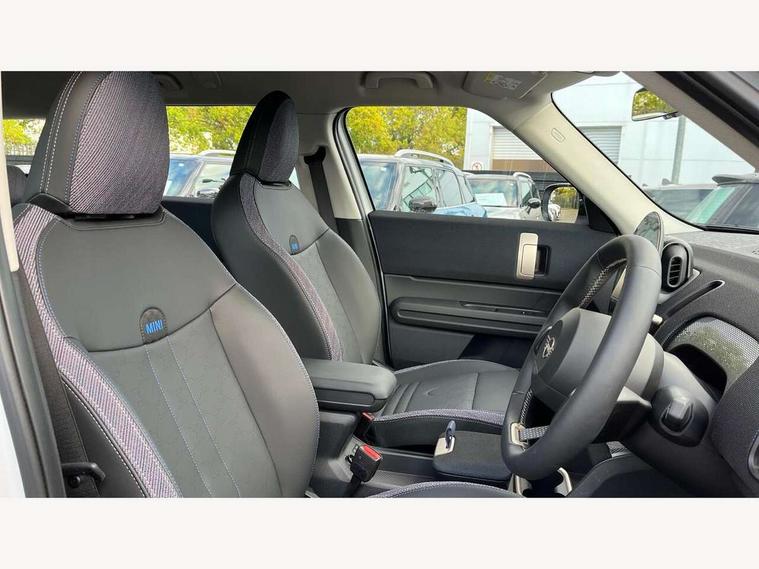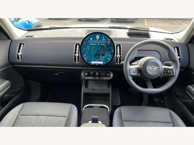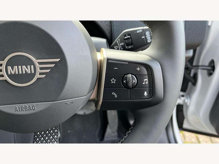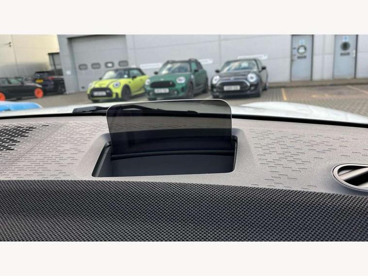 Bluetooth connection, Circular OLED Screen, Compatible mobile phone bluetooth with audio streaming, Cruise Control (DCC), Digital dashboard display, Driving assistant, E-call, Electro-mechanical speed dependant steering assistance, MINI Experience Modes, Mini navigation system, MINI TeleServices, Parking assistant in camera and ultrasound based assistance system, rear view camera, parking aid and distance control, Auto transmission with Paddles, Larger capacity fuel tank, 6 speakers, DAB Digital radio, Personal eSim, Auto tailgate, Electric adjustable heated door mirrors, Front and rear electric windows, Heated rear window, LED daytime running lights, LED Headlights, LED rear lights, LED third brake light, Rain sensor with auto headlights, Rear side wing doors, Rear window wiper, Roof rails, 3 seat bench in 2nd row, 60/40 split rear bench seat, Auto air conditioning, Floor mats, Front armrest, Front headrests, Heated steering wheel, Height and length steering column adjustment, Light headliner, Rear headrests, Single front passenger seat, Sport Vescin Steering Wheel, Sunvisors with vanity mirrors, Vescin/Cloth upholstery, 3x3 point rear seat belts, 6 Airbags - front, side, head and seat belt tensioners, ABS, DSC - Dynamic Stability Control, Electronic handbrake, Electronic Stability Programme (ESP), Front ISOFIX (iSize), Hill hold assist, Hill start assist, Manual rear child locks, Traction control, Tyre pressure monitoring system, Warning triangle, Alarm system with tilt sensor, monitoring doors, bonnet interior and tailgate, Auto drive away locking, Deadlocking function, Electronic vehicle immobiliser, Locking wheel bolts, Remote control locking, Start/stop toggle with keyless go, Black/Blue dashboard knit, MINI Mobility Kit,
