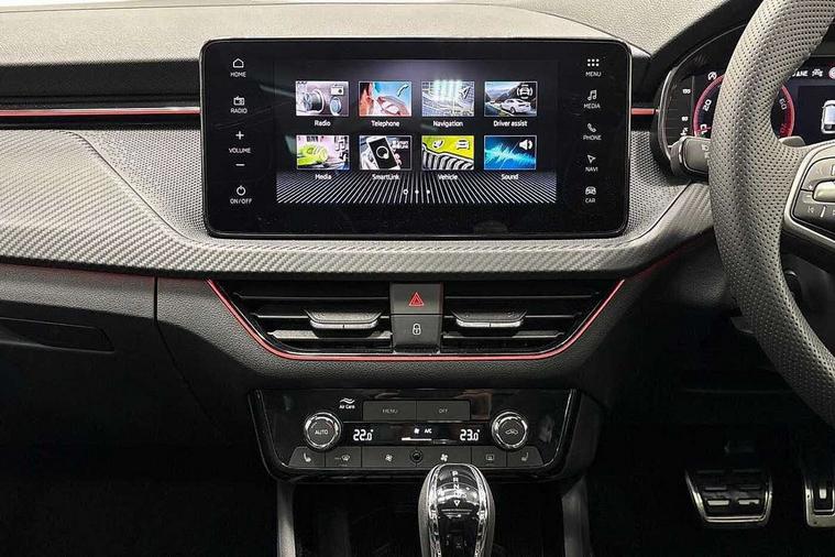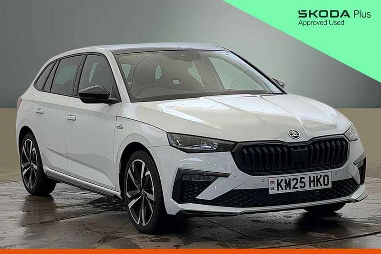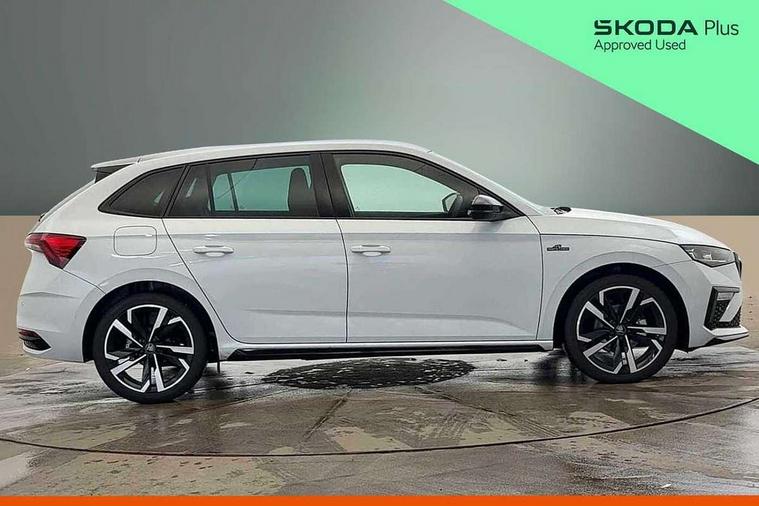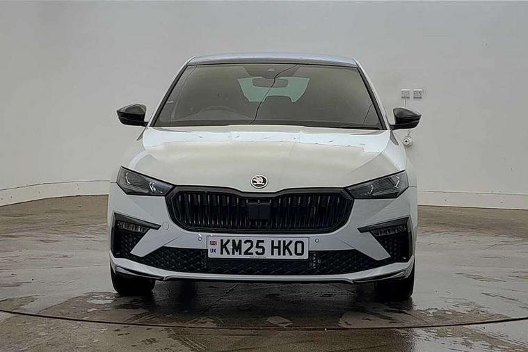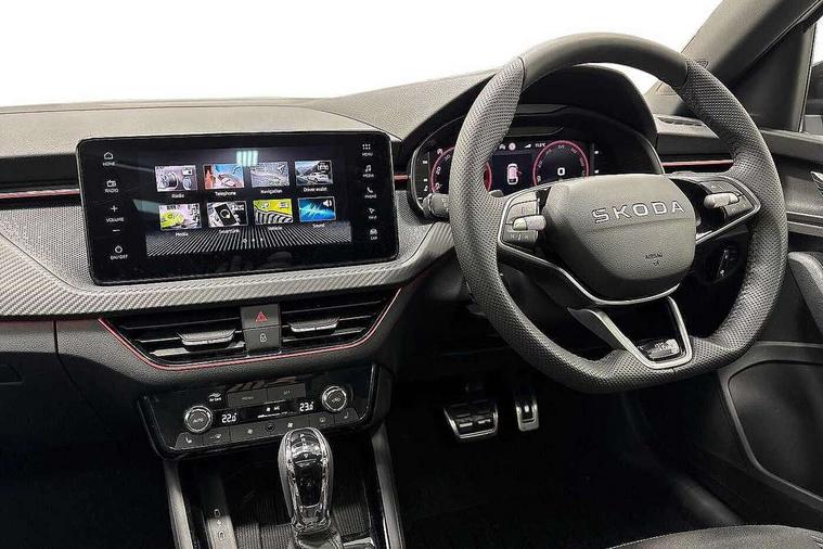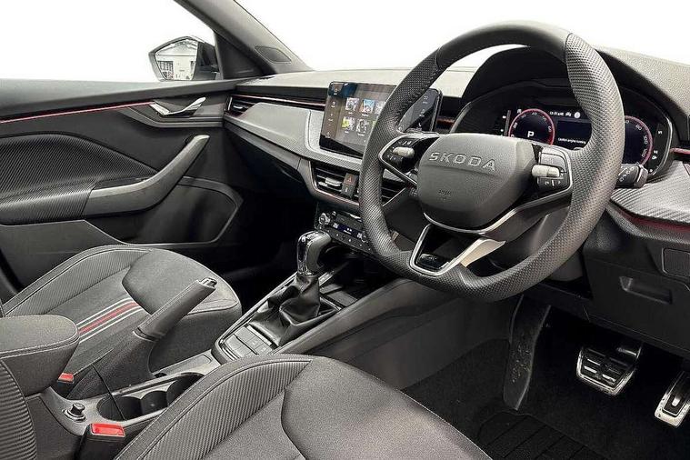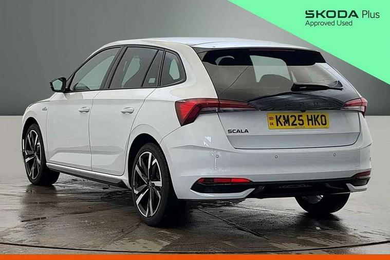 Advanced driver attention and drowsiness monitor, Bluetooth, e-Call (emergency call), Front assist system, PAS, Rear parking sensors, Rear view camera, Speed limiter, Tailgate, Traffic sign recognition, Virtual Cockpit - 10.25" digital display, Voice control system, Wireless smartlink, 4 USB C ports, 8 Speakers, 9.2" Skoda navigation display, DAB radio, Auto dimming rear view mirror, Automatic headlamp activation with Coming home and Leaving home feature, Automatic high/low beam, Automatic intermittent wipers, Black door mirrors, Black lettering on boot lid, Black radiator grille, Black rear diffuser, Black roof spoiler, Body colour bumpers, Body colour door handles, Chrome moulding around grille, Extended tailgate glass, Front and rear electric windows, Heated rear window, LED 3rd brake light, LED brake lights, LED daytime running lights, LED high beam, LED low beam, Light sensors, Monte carlo plaque, Panoramic glass roof, Privacy glass, Rear LED fog light, Rear side wing doors, Rear wiper, Tinted windows, Unique dark chrome design logo on alloy wheels, 12V socket in luggage compartment, 3 seat bench in 2nd row, Aluminium pedals, Ambient lighting in white/red, Black / White armrest stitching, Black ceiling, Black roof headlining, Cargo elements, Chrome inner door handles, Door inserts in art.leather carbon, Driver and passenger sun visors with vanity mirror, Dual zone climate control, Front and rear roof lights, Front centre armrest, Front head restraints, Height adjustable driver seat, Height adjustable passenger seat, Ice scraper, Illuminated glove compartment, Inner circulation control with pollen filter, ISOFIX for front passenger seat, Isofix preparation for back seats, Leather gearknob and handbrake lever, Luggage net under rear parcel shelf, Manual lumbar support for front seats, Monte Carlo cloth upholstery, Net package and top tether hooks in boot space, Pocket on the back of both front seats, incl. mobile phone pockets, Rear centre armrest, Red hotstamping, Single front passenger seat, Skoda lettering on steering wheel, Sport seats, Textile floor mats, Third rear headrest, Ticket holder, Top tether for front passenger seat, Umbrella in driver's door, Light and view plus pack - Scala, 3x3 point rear seatbelts, ABS, Child locks, Curtain airbags and front side airbags, Disc brakes, Driver and front passenger airbags, ESP, Hill hold control, Manual leather parking brake, One tone horn, Passenger airbag switch off function, Seatbelt reminder for driver and front passenger, Tyre pressure monitoring system, Anti theft alarm system with interior monitoring, backup horn and towing protection, Anti-theft wheel bolts, Remote central locking with 2 remote folding keys, SAFE function for remote central locking, Carbon effect decorative inserts, 18" Ursa black diamond cut alloy wheels,