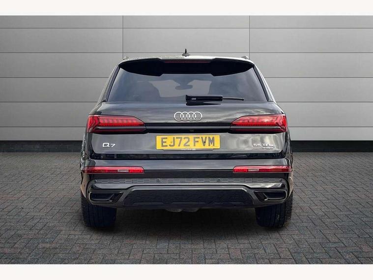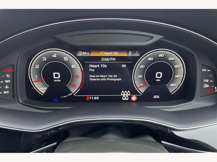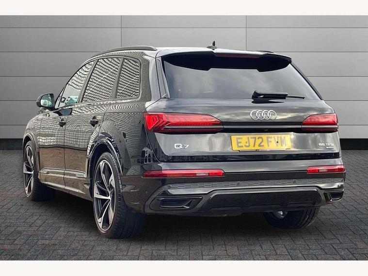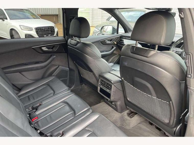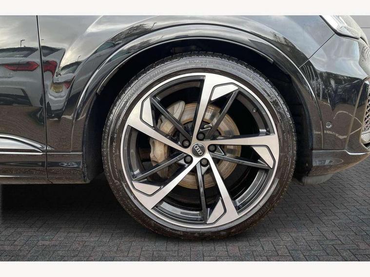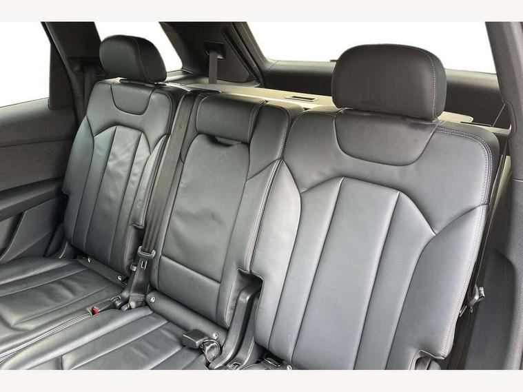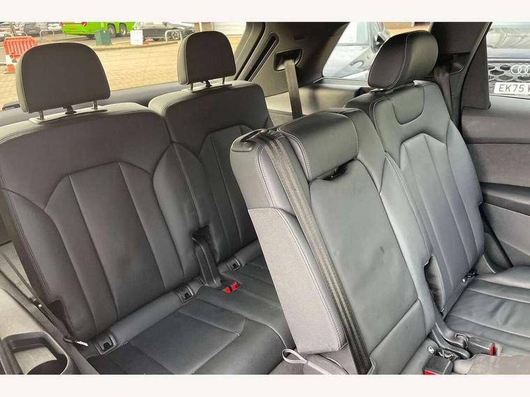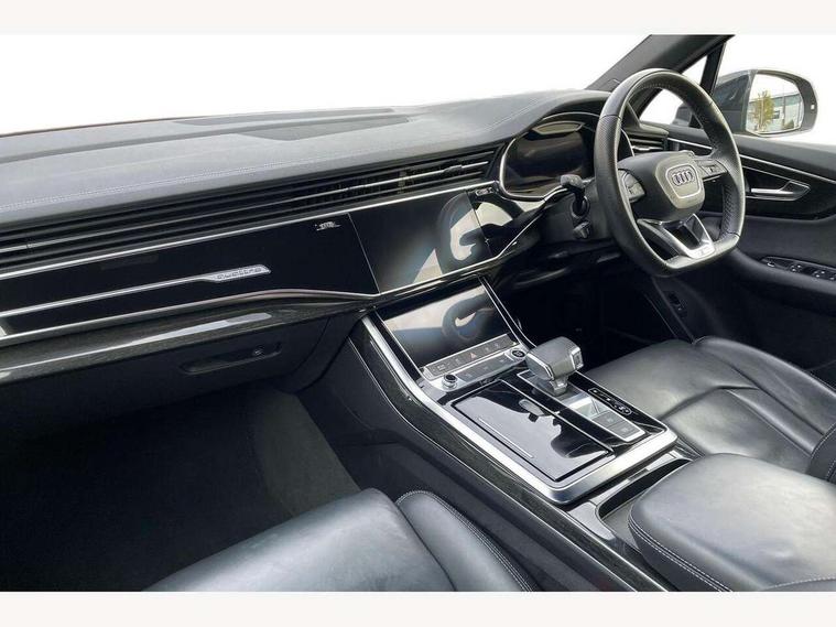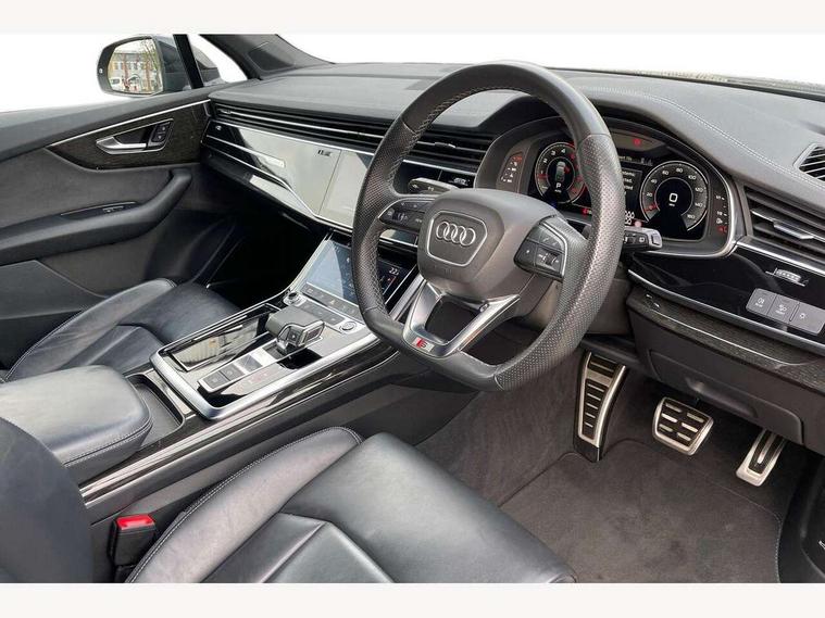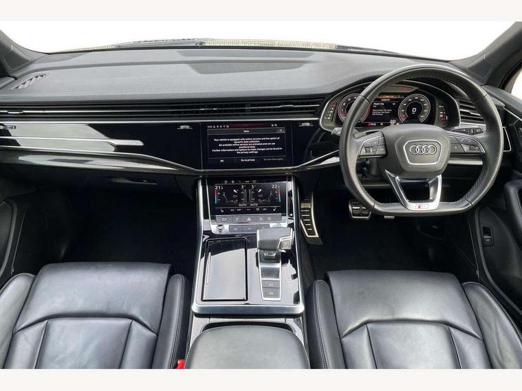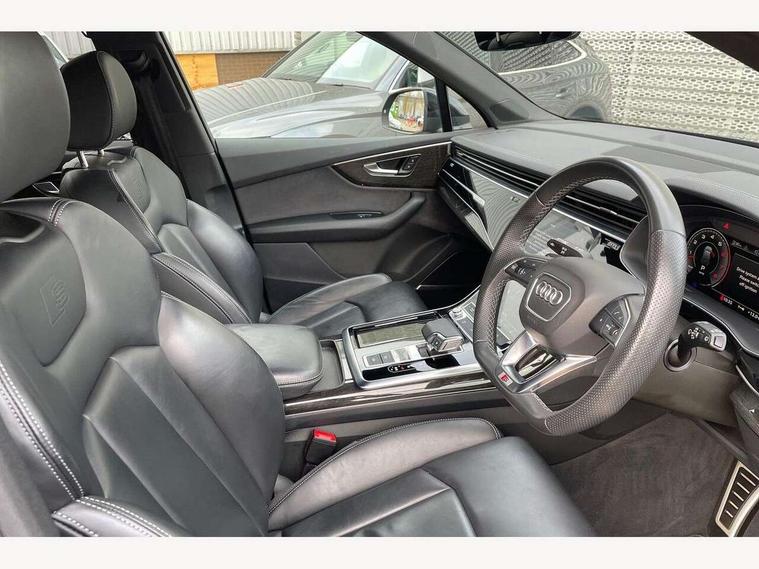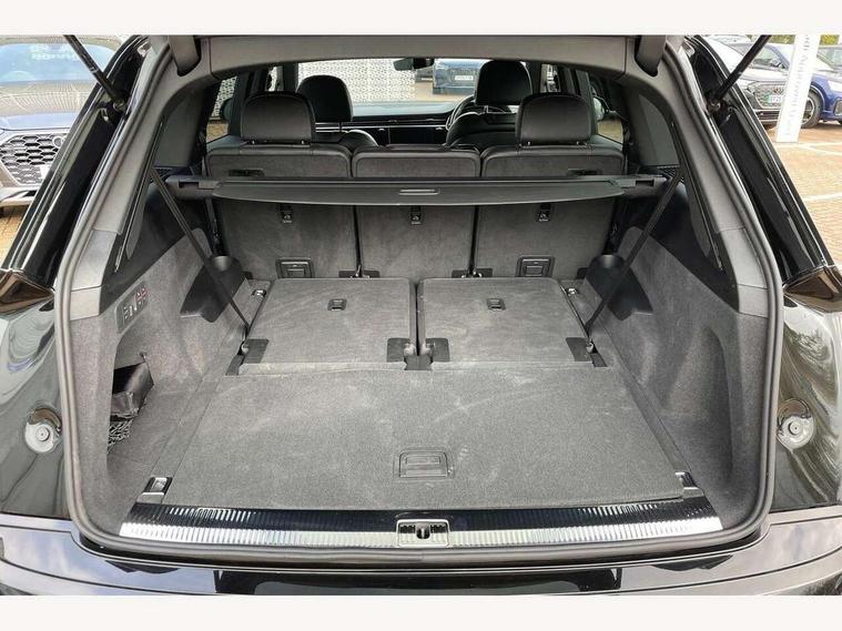 Audi connect safety and service (e-call), Audi connect with Amazon Alexa Integration, Audi drive select (Auto, Comfort, Dynamic, Efficiency, Individual, Off-road and All road), Bluetooth interface, Camera based traffic sign recognition, Electromechanical steering, MMI navigation plus with MMI touch screens includes 10.1" and 8.6" screens with haptic feedback, Natural voice recognition, Parking system plus with 360 degree display (front, rear and side sensors) - acoustic and visual park assist system, Power operated tailgate, Rear view camera, Smartphone interface includes wireless Apple carplay/Android Auto, Start/stop system, 48V Mild hybrid technology, 85 litre fuel tank, Adaptive air sports suspension, Quattro all wheel drive with self locking centre differential, Audi music interface - front 2 USB-C ports with charger and data functions, Audi sound system with 6 channel amplifier, 180 watt amplifying capacity and 10 loudspeakers including subwoofer, DAB digital radio module, 3rd brake light, Audi matrix LED headlights with dynamic front and rear indicators, Auto dimming frameless rear view mirror, Black roof rails, Bumpers in contrast paint scandium grey finish includes door trim and wheel arch trim strips, inlays in door strip contain quattro embossing, Electrically adj heated/folding + automatically dimming exterior mirrors with memory + automatic kerb side function for passenger side exterior mirror, Heat insulating glass in windshield, Integrated LED indications in door mirrors, LED daytime running lights, LED rear tail lights, Privacy glass - dark tinted rear and rear side windows from B-pillar backwards, Rear side wing doors, Rear wiper, 2 seat bench in 3rd row, 3 seat bench in 2nd row, 4 zone deluxe automatic climate control, 7 seat layout with ISOFIX points for the front passenger seat and rear passenger seat, Black cloth headlining, Comfort front centre armrest, Electric adjustable front seat with 4 way lumbar support, driver memory functionality, Folding rear seats, Front head restraints, Front/rear floor mats, Heated front seats, Illuminated door sill trims with S logo, LED interior ambient lighting, Luggage compartment cover, Luggage compartment sill protection in stainless steel, Rear head restraints, Single front passenger seat, Stainless steel pedals, Sunvisors with illuminated vanity mirrors, Titanium black styling pack - Q7/SQ7, 3 point seatbelts on all rear seats, Audi pre sense front, Child locks on rear doors, Driver and front passenger, front side and curtain airbags, Electromechanical parking brake, Electronic Stabilisation Control (ESC) including ABS, ASR and EDL, Extended pedestrian protection measures, Hill hold assist, Seatbelt monitoring, Tyre pressure loss indicator, Warning triangle and first aid kit, Anti theft alarm, Anti-theft wheel bolts and wheel loosening detection, Keyless Go, Remote central locking, Polished oak trim with grey finish inlay, Tool kit, Tyre repair kit,