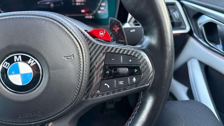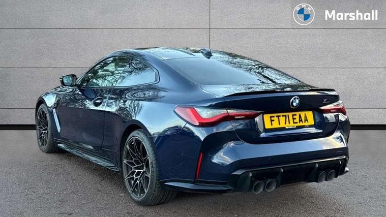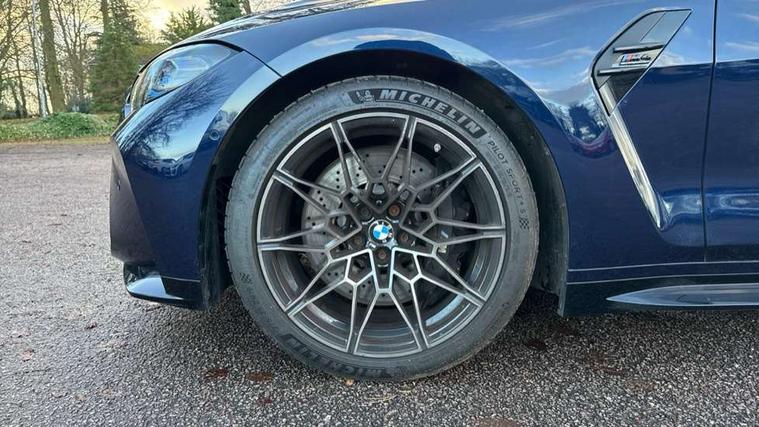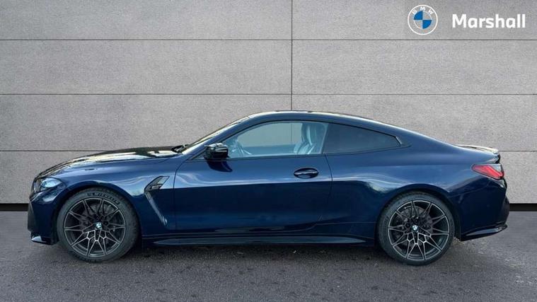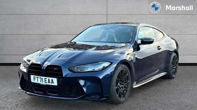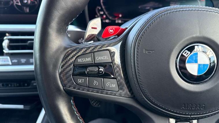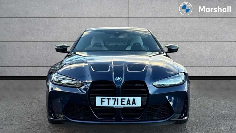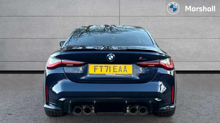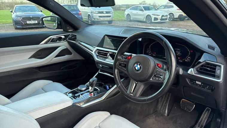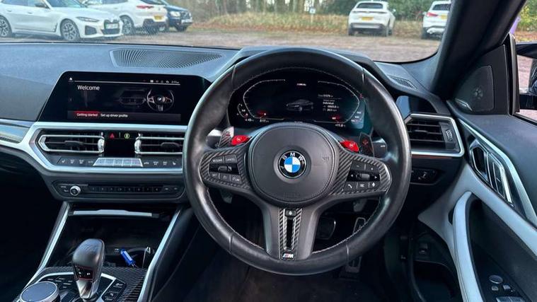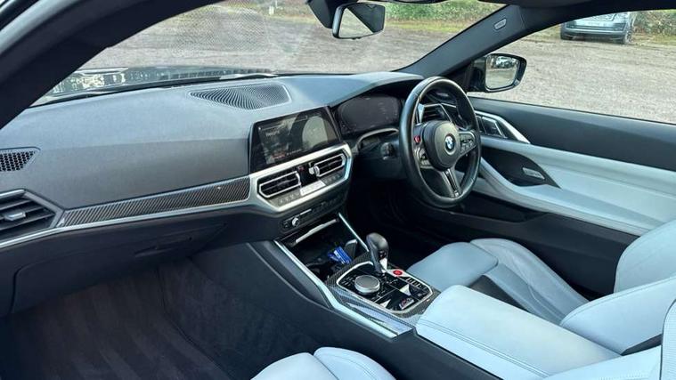 Automatic start/stop system, Bluetooth with USB, BMW iDrive controller on centre console, BMW legal emergency call, BMW Live Cockpit Professional sat nav system with 12.3" instrument display and high resolution control display, BMW Online services, BMW Teleservices, Brake pad wear indicator warning light, Door/boot open warning light, Electric Power Steering (EPS) with Servotronic, Enhanced bluetooth with wireless charging, Head up Display, Instrument cluster with extended contents, Lights on warning, Oil sensor for level and grade, warning by check control system, Oil temperature gauge, On board computer, On board diagnostics, Optimum shift indicator, Outside temperature display, Pull away assistant, Run flat indicator, Service interval indicator, Speed limiter, Wi-Fi hotspot, Adaptive M Sport suspension, M Drive Professional including track mode, laptimer, traction control & Drift analyser, M Sport differential, M steptronic sport transmission with drivelogic, 8 programmable favourite buttons, Auxiliary point for auxiliary devices, BMW professional radio/CD/MP3, DAB Digital radio, Harman/Kardon loudspeaker system, USB C dual charger in rear centre console, Acoustic laminated side glass, Auto dimming driver's door mirror, Auto dimming rear view mirror, Automatic headlights + automatic windscreen wipers, Black chrome exhaust tailpipes, Black model designation badges, BMW high gloss shadow line with extended contents, BMW Individual shadowline lights, Body colour bumpers, Body colour door handles, Carbon fibre reinforced plastic (CFRP) roof, Day time running light, Door mirror integrated indicators, Door sill finishers with aluminium inserts, Dynamic brake lights, Electric adjustable heated door mirrors, Electric folding door mirrors, Follow me home headlights, Front and rear bumper system, Front electric windows with open and close fingertip control, anti trap facility and comfort closing, Heat protection, sun protection glazing, High beam assistant, High gloss black frameless kidney grille with M badge, LED number plate light, LED tail lights with 3D L-shaped LED light design, M designation, Mirror glass aspheric on driver's side, convex on passenger side, Rain sensor, Rear boot, Rear fog lights, Rear reflectors, Shark fin roof aerial, Third brake light, Visible VIN plate, Welcome lighting, Windscreen wipers with integrated washing jets, 12V power socket in front centre console with blanking plug, 12V socket in luggage compartment, 2 cupholders in front centre console, 2 rear head restraints, 40:20:40 split folding rear 2 seat bench with loading system, Ambient lighting, Anthracite headlining, Carbon fibre centre console incl. cover for cupholders, Carbon fibre decorative steering wheel finishers, Carbon fibre shift paddles, Carbon fibre strip in instrument panel on front passenger side, Compartment in front of cupholder, Driver/passenger sunvisors with illuminated vanity mirrors + covers, Electric front seats + driver memory, English handbook, Footwell lighting, Front and rear door exit lights, Front door storage bins with bottle holder, Front interior light, Front isofix attachment + airbag deactivation, Front seat backrest width adjustment, Front seats lumbar support, Front/rear door armrests, Gearshift lever with embossed M badge, Heated front seats, Height adjustable front headrests, Interior mirror lighting, Isofix on 2nd row outer seats, Lockable/illuminated glovebox, Luggage compartment lighting, Rake/reach adjustable steering wheel, Single front passenger seat, Storage compartment in rear doors, Storage tray and compartment with cover in centre console, Three zone automatic air conditioning, Toolkit located in luggage compartment, Additional storage compartment pack - M4, Connected package professional - M4, High gloss shadowline exterior trim pack - M4, 4 x 3 point seatbelts, ABS/EBD, Automatic Stability Control (ASC), Brake energy regeneration, Brake fade compensation, Compound structure brake discs, Cornering brake control (CBC), Crash sensor, Driver/Front Passenger airbags, Dry braking, Dynamic brake control, Dynamic Stability Control with M Dynamic mode, Dynamic Traction Control - DTC, Electromechanical parking brake, Front and rear head airbags, Front seat side impact airbags, Front seatbelt pretensioners + load limiters, Hill start assist, M Sport seat belts, Seatbelt warning, Side impact protection, Two tone horn, Tyre pressure sensor, Warning triangle and first aid kit, Electronic immobiliser, Remote central locking, Thatcham cat 1 remote alarm, Vehicle Key with 4 buttons including the integrated key, Galvanic finish to control surrounds, High gloss black interior trim, Tyre repair kit,