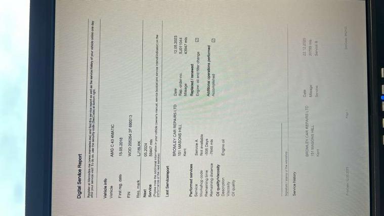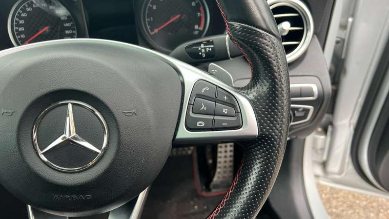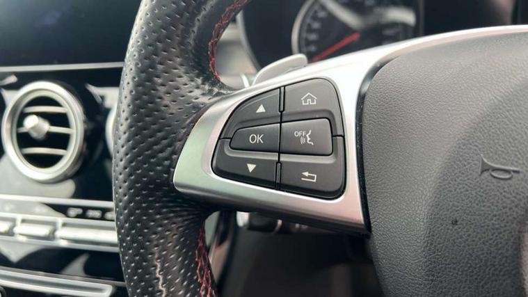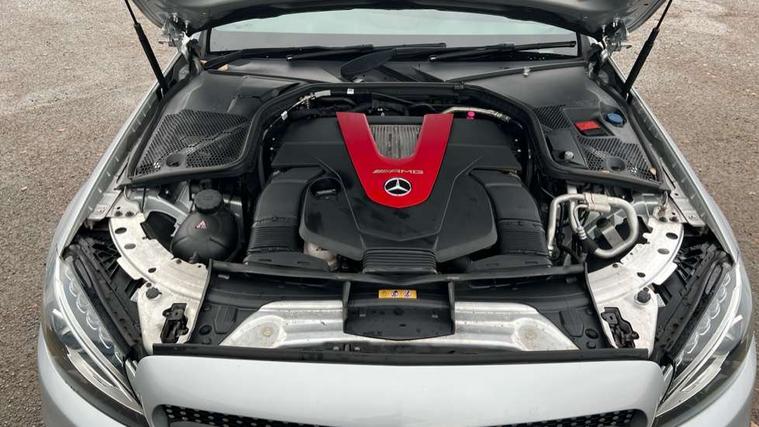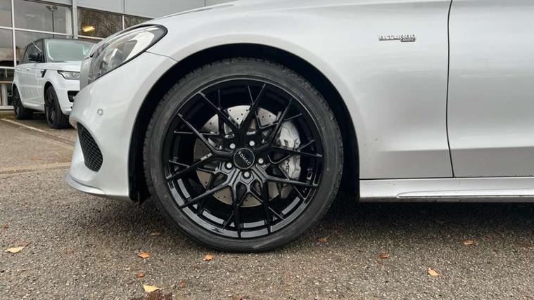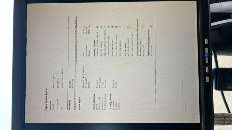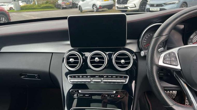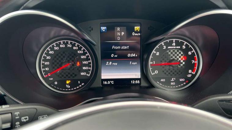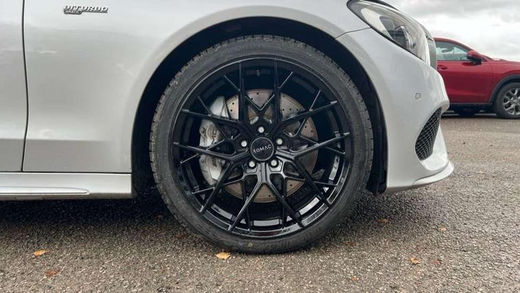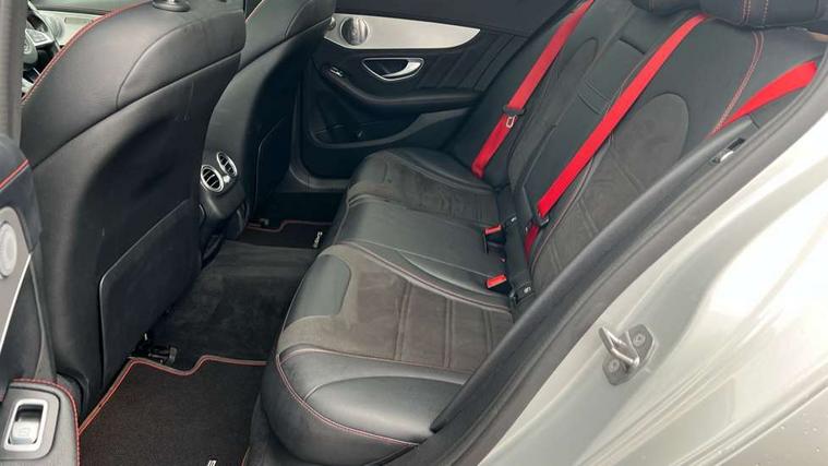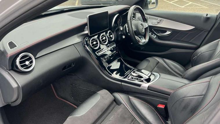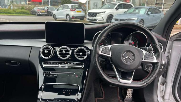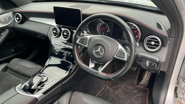 Active park assist with parktronic system, Analogue clock, Attention assist, Bluetooth system, Collision prevention assist, COMAND online nav with colour display, radio/CD/DVD/MP3, SD card, 10GB music, Emergency Call system, speed limit assist, linguatronic voice control, DYNAMIC SELECT with a choice of driving modes (ECO, Comfort, Sport, Sport+ and Individual), Multi function trip computer, Outside temperature gauge, Power opening/closing tailgate, Remote boot release, Service indicator (ASSYST PLUS), Speed sensitive steering, AMG Ride Control sports suspension, 2 USB ports in centre console, Burmester surround sound system, DAB Digital radio, SD card slot, Adaptive brake lights, AMG body styling, Black door mirrors, Body coloured bumpers, Chrome pins diamond radiator grille with integrated stars, Electric front sliding and fixed rear panoramic glass sunroof, Electric windows one touch open/close, Electrically adjustable and heated door mirrors, Green tinted glass, LED daytime running lights, LED tail lights, Rain sensor windscreen wipers, Rear wiper, 2 cupholders in front centre console, 3 spoke flat bottomed nappa leather sport steering wheel, 40:20:40 split folding rear seats, Advanced multicolour ambient light and LED interior light, AMG floor mats with red stitching, Auto Mercedes-Benz child seat recognition sensor, Dual zone automatic climate control, Front and rear head restraints, Front centre armrest with storage compartment, Gearshift paddles, Heated front seats, Illuminated glovebox, Load compartment cover, Lumbar support, Multifunction steering wheel, Rear top tether child seat ISOFIX attachment, Sports pedals with stainless steel surfaces and rubber studs, Sunvisors with illuminated vanity mirrors, Lighting pack - C class, Memory pack - C Class, Mirror pack - C Class, Seat comfort pack - C Class, Stowage space pack - C Class, 3 rear 3 point seatbelts, ABS with Brake Assist, Active bonnet, Adaptive brake system, Child proof door locks, Drivers knee airbag, Dual stage driver/passenger airbags, Electronic parking brake, ESP with ASR, Front passenger seat occupancy sensor, Front side airbags, Hill start assist, Rear seatbelt warning indicator, Red seat belts, Tyre pressure monitoring system, Warning triangle and first aid kit, Window airbags, Alarm system/interior protection/immobiliser, Chrome surround in electric key, Keyless entry and keyless start, Remote central locking, Artico upholstered dashboard with contrast stitching, Tyre inflation kit,