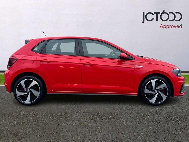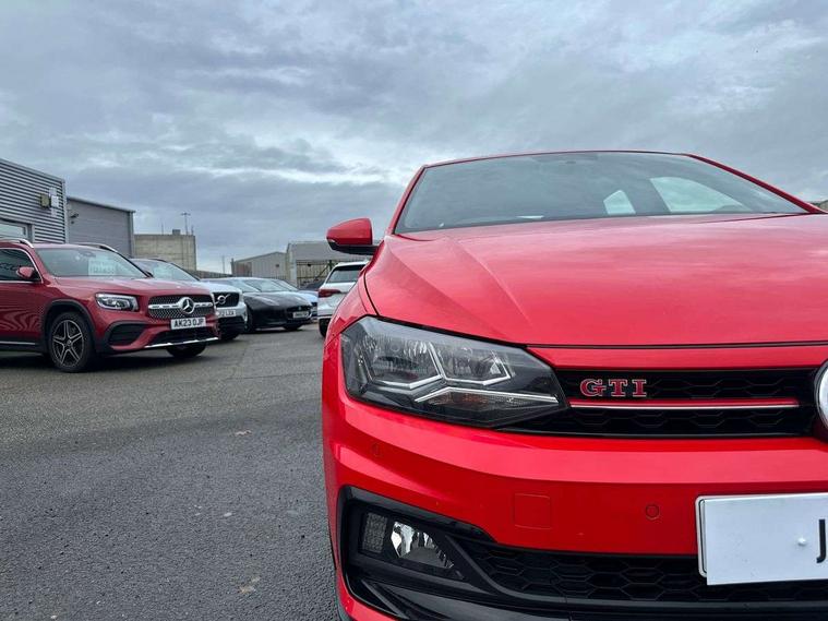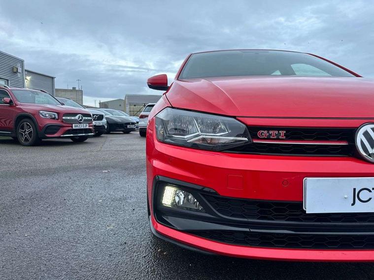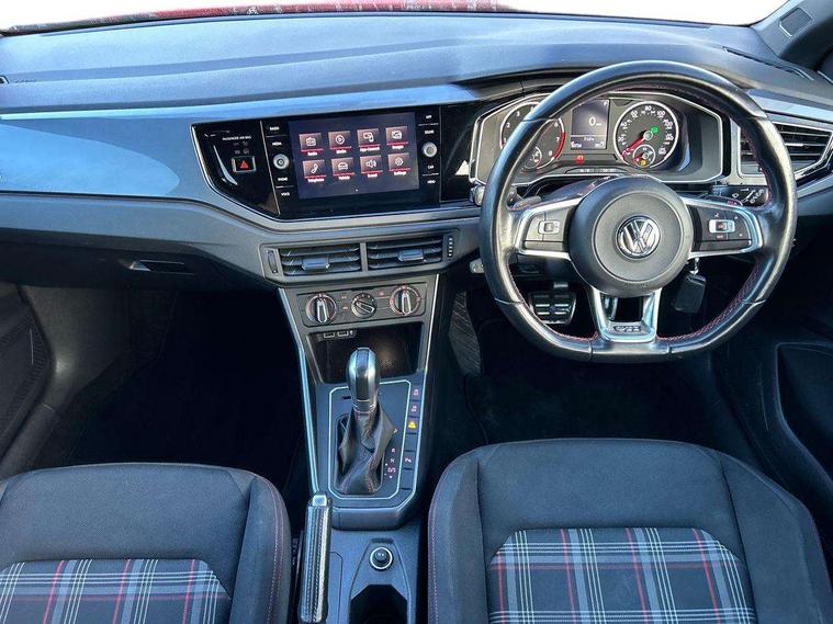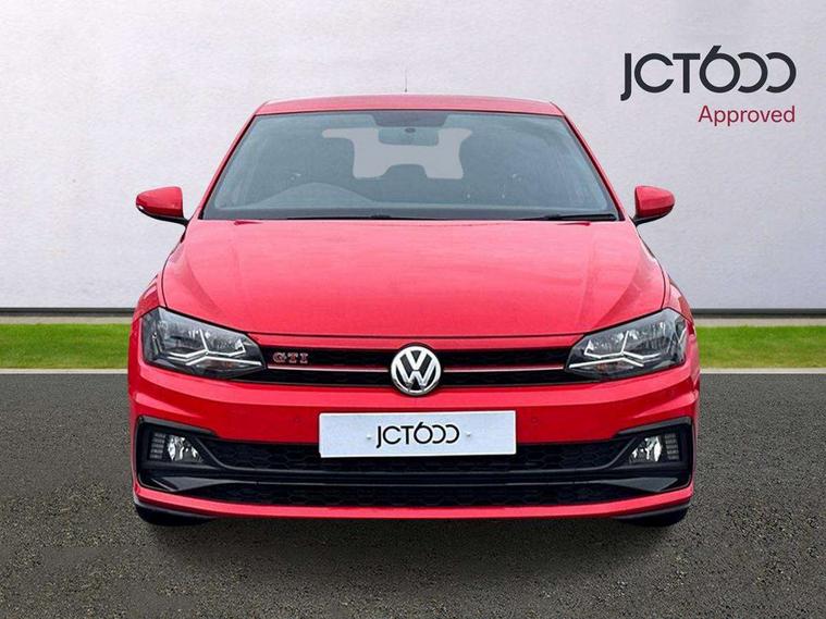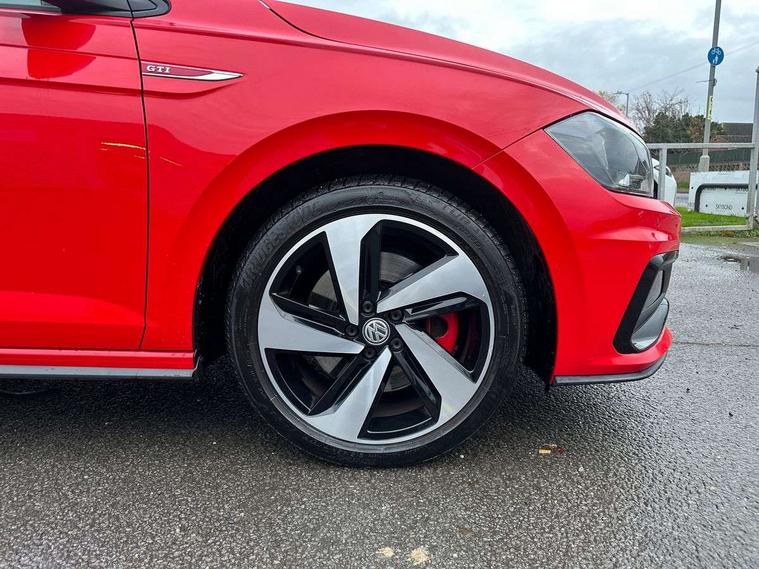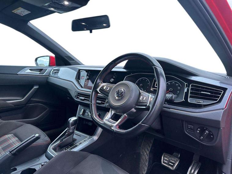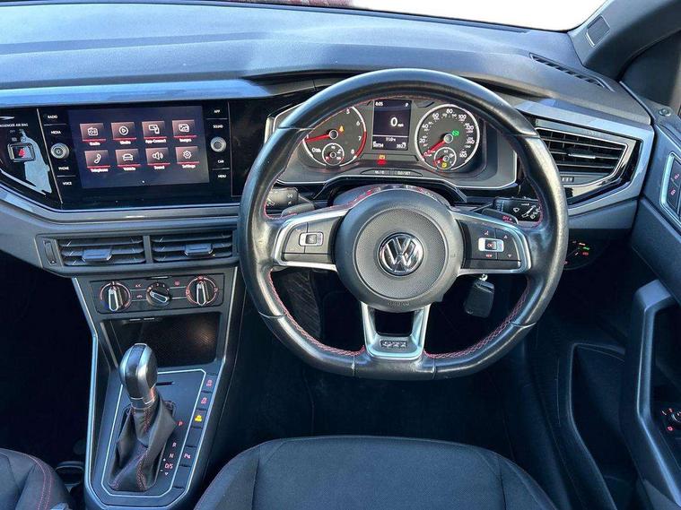 App-Connect, Bluetooth Telephone preparation, Drive mode selector, Driver alert system, Multifunction colour display, PAS - speed related, Service interval indicator, Trip computer, Warning buzzer and light for front seatbelts unfastened, Lowered sports suspension, XDS electronic differential lock, 6 speakers, Composition media system with radio, glovebox mounted CD, colour touch screen, SD card, aux-in, USB, multimedia interface, DAB Digital radio, Automatic headlamp activation, Black grille with chrome surround, Black rear spoiler, Body colour bumpers, Body colour door handles, Body coloured side sills, Chrome trimmed front air intake surrounds, Electric front windows, Electric operated/heated door mirrors, Front wash/wipe with interval delay, Heat insulated tinted glass 65% light absorbing from B pillar back, Heated rear window with auto timer, LED daytime running lights, LED rear number plate lights, LED tail lights, Rear electric windows, Rear windscreen washer and wiper with interval delay, Red radiator grille louvres, Stainless steel door sill protection, Twin chrome exhaust tailpipes, 12V power socket in centre console, 2 bag hooks in luggage compartment, 2 cupholders, 3 rear head restraints, 3 spoke steering wheel, 60/40 split folding rear seat, Ambient lighting, Chrome plated light switch, Driver/front passenger seat height adjustment + underseat drawers, Driver/passenger sunvisors with illuminated vanity mirrors, Dust/pollen filter, Front and rear carpet mats with red stitching, Front seat backrest storage nets, Front seats with lumbar support, Front/rear reading lights, Gearshift paddles, Glovebox, Height/reach adjustable steering column, Interior light with delay, Isofix Preparation 2 Rear child seats, Jack and tool kit, LED footwell lights, Luggage compartment cover, removable, Luggage compartment lighting, Matt chrome gear lever gaiter surround, Multifunction leather steering wheel with leather gear knob/handbrake grip, Stainless steel pedals, Storage compartment in front doors, Storage compartment in rear doors, Storage compartment under front seats, Titanium black headlining, GTI styling pack - Polo, 3 point height adj front seatbelts + pretensioners, 3x3 point rear seatbelts, ABS, Automatic post collision braking, Driver/front passenger airbag, Driver/Passenger whiplash optimised head restraints, ESP with EDL + ASR, Front and rear passengers curtain airbag system including front side airbags, Front passenger airbag deactivation, HBA (Hydraulic Brake Assist), Hill hold control, Red brake calipers, Two tone horn, Tyre pressure monitoring system, Alarm with remote central locking and interior protection, Anti-theft wheel bolts, Electronic engine immobiliser, Air vents in Matt chrome, Black high gloss trim, Space saver spare wheel,