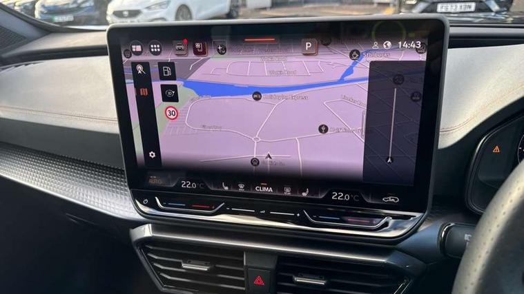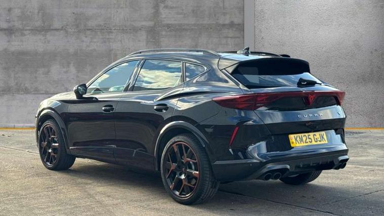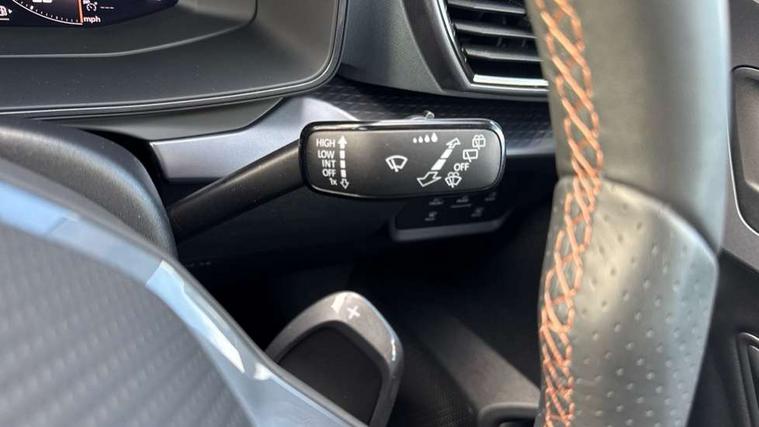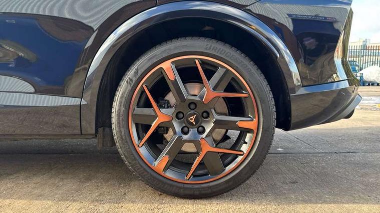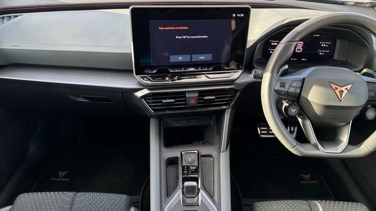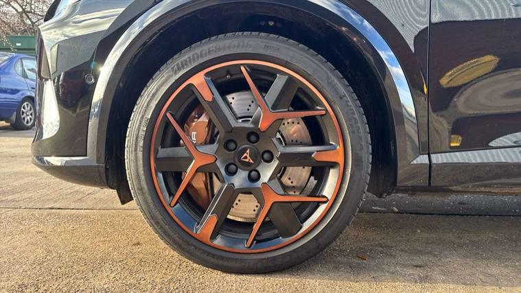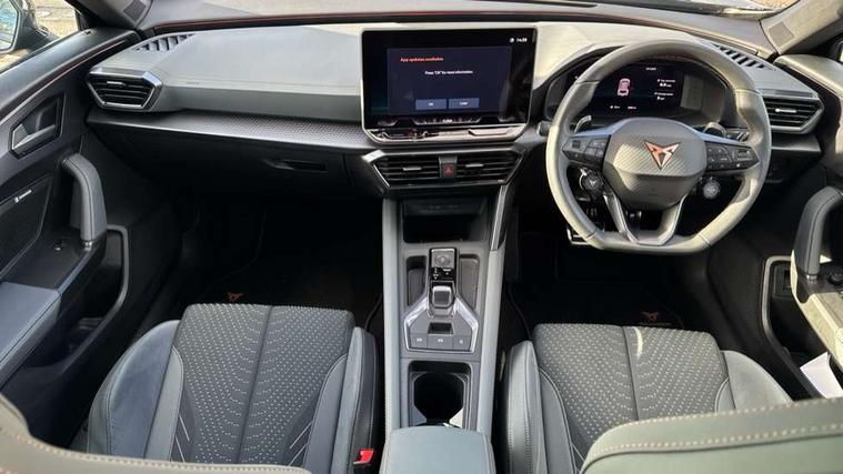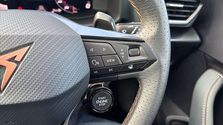 10.25" digital cockpit and configurable dashboard, Adaptive cruise control with follow-to-stop and speed limiter, Advanced driver alert system, Advanced lane assist with semi-automatic vehicle control in a medical emergency and traffic jam assist, Dynamic chassis control with driving profile selection (Comfort, Sport, CUPRA, Individual), Dynamic road sign display, Emergency steering support with turn assist, Forward collision warning with automatic braking, Full link phone integration, Intelligent park assist, RPM, trip computer, outside temp gauge, instrument light brightness, low fuel warning light, lights on reminder, gearshift indicator, Service interval indicator, Side and exit assist, Speed sensitive power steering, Start/stop system with regenerative braking, Top view camera, Virtual pedal and electric tailgate, Voice control system, Wired Android Auto, Wireless apple carplay, Wireless phone charger, Adaptive chassis control with continuous operation, CUPRA sport suspension, Electronic locking differential and dynamic traction support, 2 front and 2 rear USB type C sockets, Immersive by Sennheiser TM - 10 speakers, 1 central speaker, 1 subwoofer, Media system with navigation, 12.9" touchscreen display, voice control, DAB, steering wheel mounted controls, Auto dimming rear view mirror, Black roof spoiler, Body colour door handles, Body coloured bumpers, Dark grey wing mirror, Daytime running light with automatic headlight control and coming home feature, Door panel ambient lighting, Dynamic headlight range control, Electric front/rear windows, Electrically adjustable heated and folding door mirrors with memory function, Gloss black roof rails and window surrounds, High beam assist, LED 3rd brake light, LED front fog lamps with cornering function, LED Taillights with dynamic indicator, Matrix LED headlights with multifunction camera, Rain sensing wipers, Rear diffuser with twin exhaust pipe on each side, Rear fog lights, Rear side wing doors, Rear wash/wipe, Side skirts, Tinted rear windows, Welcome lights (within exterior mirror housing), 12V socket, 2 front and 2 rear reading lights, 3 seat bench in 2nd row, 60/40 split rear bench seat with armrest and mechanical seat release, Black headlining, Black interior roof lining, Cupra sports pedals, Dust/pollen filter, Electrically adjustable front seats with lumbar support and memory function, Front and rear head restraints, Front centre armrest, Heated front seats, Heated supersports multifunction leather steering wheel with satellite buttons and gear shift paddles, Height/reach adjust steering wheel, Illuminated aluminium doorsteps, Illuminated interior front door sills, Illuminated sunvisor with mirror, Isofix, Leather dashboard, door insert and side trim panel, LED smart wraparound lighting, PVC/Textile upholstery + cup bucket seats, Satellite steering wheel, Single front passenger seat, Three zone climate control with control panel in rear, Variable luggage/load compartment floor, 3 point seatbelts on all rear seats, ABS, Akebono brakes, Brake control system - ESC and brake booster, Child proof door locks, Driver and front passenger airbags with front passenger airbag de-activation, Driver and front passenger knee airbag, Electronic parking brake, Hill hold control, Performance brakes with front brembo calipers, Pre-crash front and rear seat belt tensioner, window closure and hazard lights, Public e-call, Seat belt reminder for front and rear seats, Side airbag for front and rear with curtain airbags, Tyre pressure monitoring system, Anti theft alarm system, KESSY Advanced - Keyless start, keyless entry with SAFELOCK, Locking wheel bolts, Copper and aluminium interior detailing, 19" Hailstorm forged machined R black and copper alloy wheels, Breakdown and tool kit,