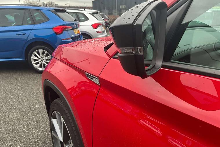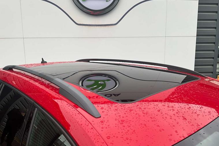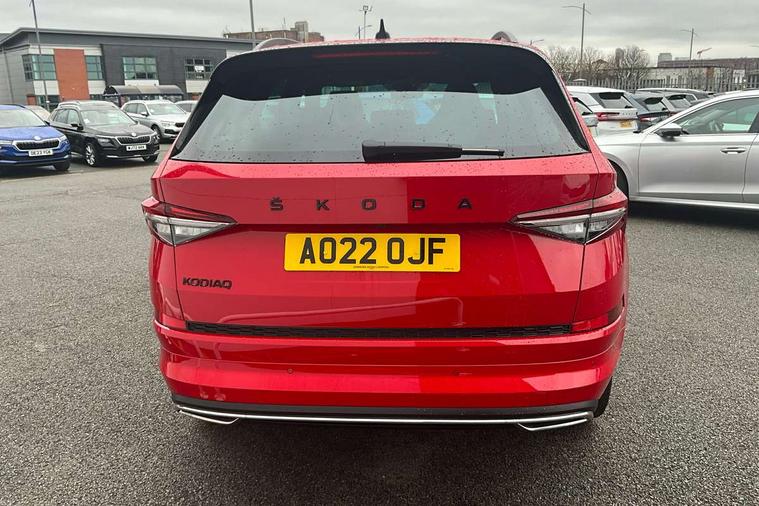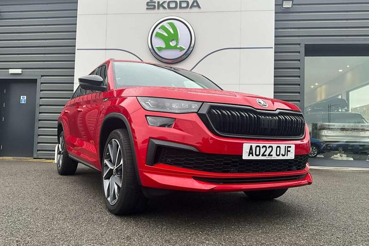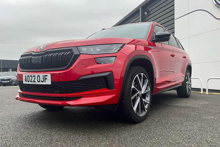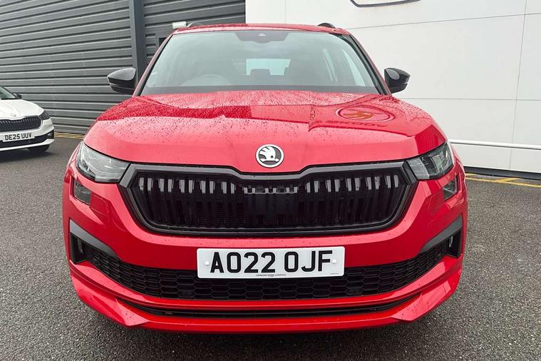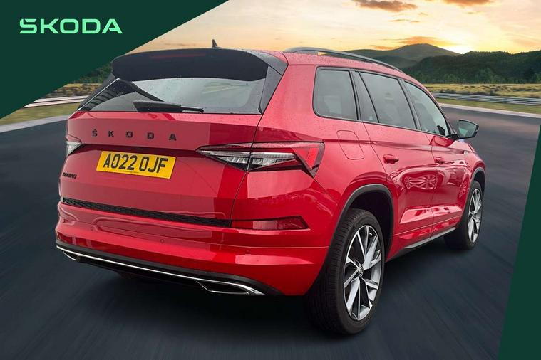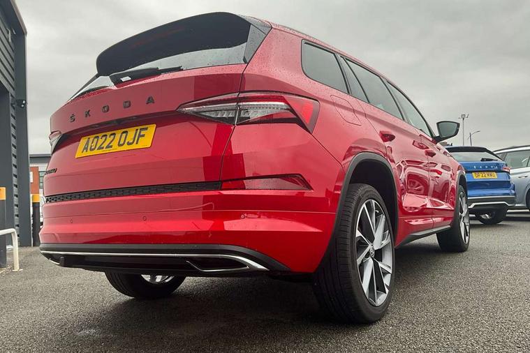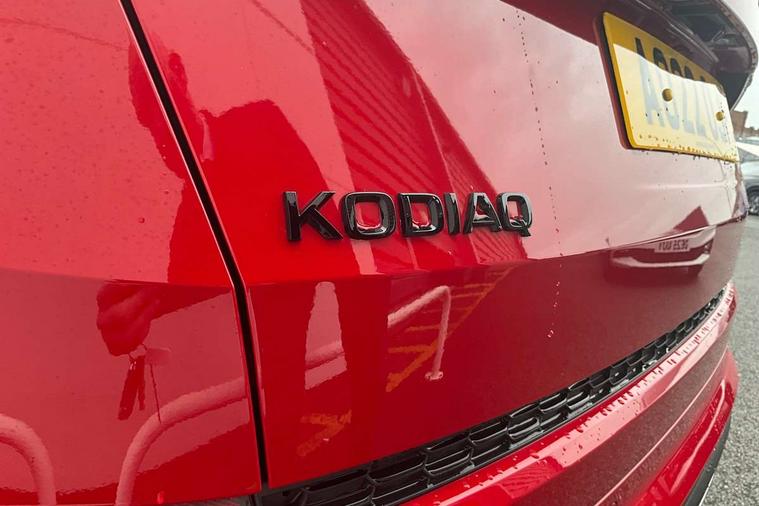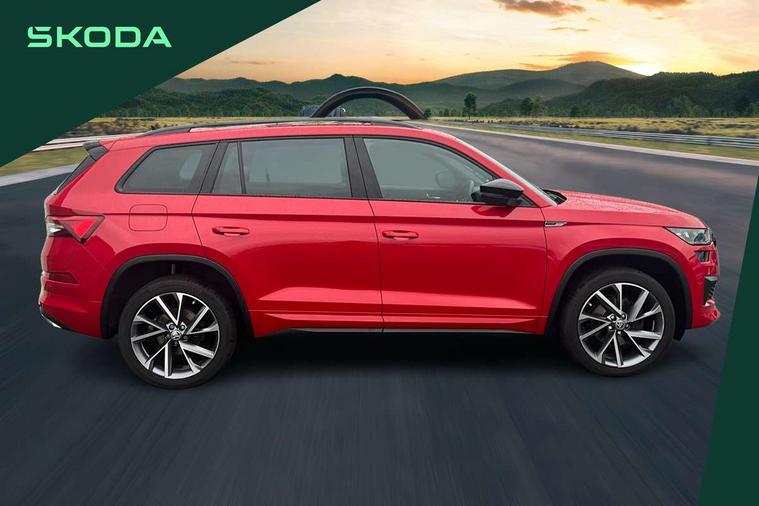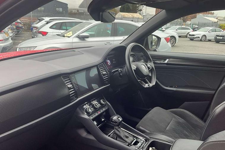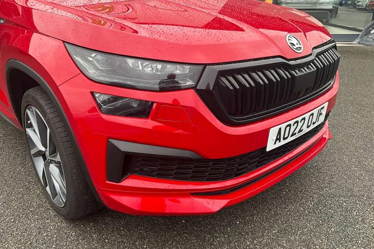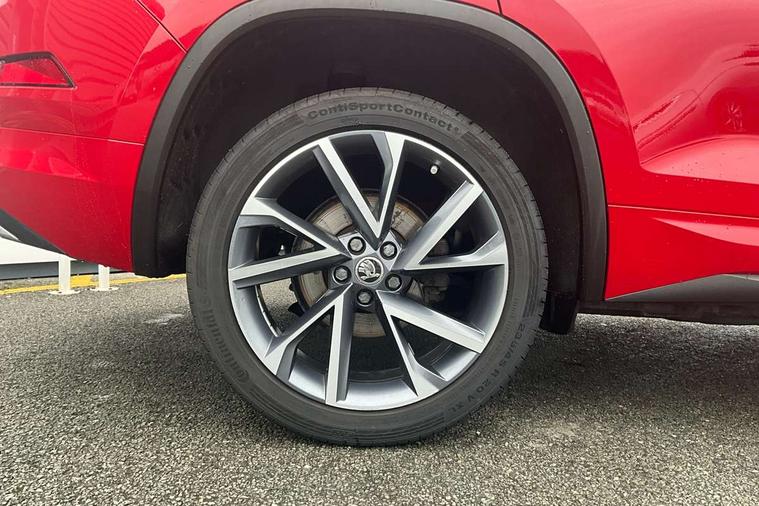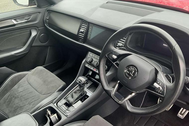 Black air vent surround, Carbon finish dashboard and door inserts, Grey stitching in dashboard, LED Interior light pack - Kodiaq, 20" Vega Anthracite alloy wheels, Temporary spare wheel (space saver), Alarm with interior monitoring and tilt sensor with safe function, Anti-theft wheel bolts, Immobiliser, Keyless entry and start system (KESSY), Remote central locking with 2 keys, 8 speakers, DAB Digital radio, Auto door release and activation of warning lights, Child locks on rear doors, Driver and front passenger airbag with knee airbag and front passenger airbag deactivation, Electronic parking brake with hill start assist, Emergency rear braking signal, ESC (incl. ABS+MSR+ASR+EDS+HBA+DSR+RBS+MKB), Front assist with autonomous emergency braking, Front side airbags with curtain airbags, Fuel cut off safety device, Height adjustable front 3 point seatbelts + pretensioners, Hill hold control, Rear disc brakes, Safety vest holder in door, Seat belt reminder for all seats, Tailgate unlocking from outside, Three point rear seat belts, Two tone horn, Tyre pressure monitor, Aero front windscreen wipers with intermittent function, Aero rear window wiper, Auto dimming rear view mirror, Black roof rails, Black sports styling including front grille and window surrounds, Black wheel arch surrounds, Body colour bumpers, Body colour door handles, Electric adjustable/heated/folding door mirrors, driver side auto dimming with boarding sports and memory function, Electric front and rear windows, Extended rear spoiler with finlets in gloss black, Front fog lights, Full LED matrix headlights with AFS (adaptive front light system), cornering function and AWL (all weather lighting system), Gloss black door mirrors, Headlight washers, Heated rear window, Invisible tailpipe, LED daytime running lights, LED rear fog light, LED third brake light in rear spoiler, Light assistant (coming/leaving home/tunnel light), Off-road style lower front bumper element, Privacy glass, Rain and light sensors, Rear diffuser, Rear LED lights (high functionality) with welcome effect and dynamic indicators, Rear side wing doors, Safety reflectors on front and rear doors, Sportline badge on front fender, Sports front and rear bumpers including lower rear chrome strip, Tailgate lettering in Black, Window control switches with black trim, 12V socket in boot, 2 rails with 2 hooks, 2 seat bench in 3rd row, 3 seat bench in 2nd row, 4 foldable roof handles with rear coat hooks, 60:40 foldable rear seat with sliding adjustment and backrest angle adjustment, Aluminium pedals, Black roof headlining, Bottle holders in door panel in the 1.5 litre front and 1 litre rear, Cargo storage compartments, Chrome headlight control button, Chrome interior door handles, Coat hooks on B pillar, Covered storage compartment on driver side, Front centre armrest with storage compartment, cup holder and 12V socket, Front courtesy lights, Gear shift lever with chrome frame and black gloss insert, Grey stitching in front and rear armrests and door armrests + door inserts, Height adjustable front headrests, Illuminated and cooled glovebox, Illuminated luggage compartment, Isofix child seat fittings in outer rear seats with top tether, Manually adjustable steering column, Microsuede door panels, Net programme in boot (1x horizontal Net, 2x vertical Nets), Overhead glasses storage compartment, Pollen filter, Rear centre armrest with cupholders, Single front passenger seat, Sliding trunk cover, Small Bags on the inner sides of the front backrests, Sports seats, Sunvisors with illuminated vanity mirrors, Three rear height adjustable headrests, Ticket holder on A Pillar, Umbrella in door panel, Variable boot floor, Bluetooth system, Columbus satellite navigation with 9.2" touchscreen, integrated Wi-Fi, web radio, Digital voice enhancement, E-call, ECO Stop/start function, Exterior temperature indicator, Progressive steering, Rear view camera, Smartlink wireless for apple carplay and wired for android auto, Speed limiter, USB C Port x 2 in front centre console, Wireless charging,