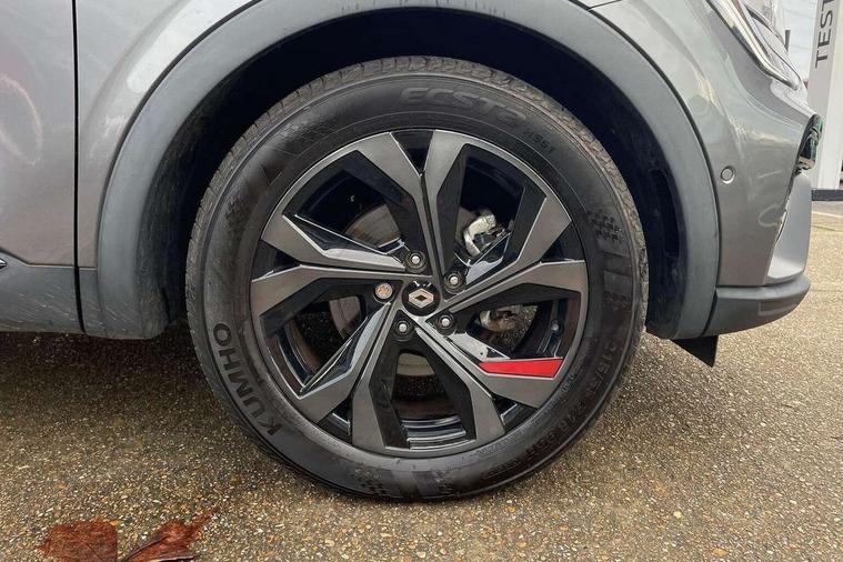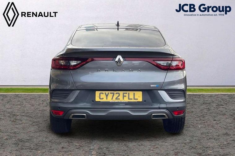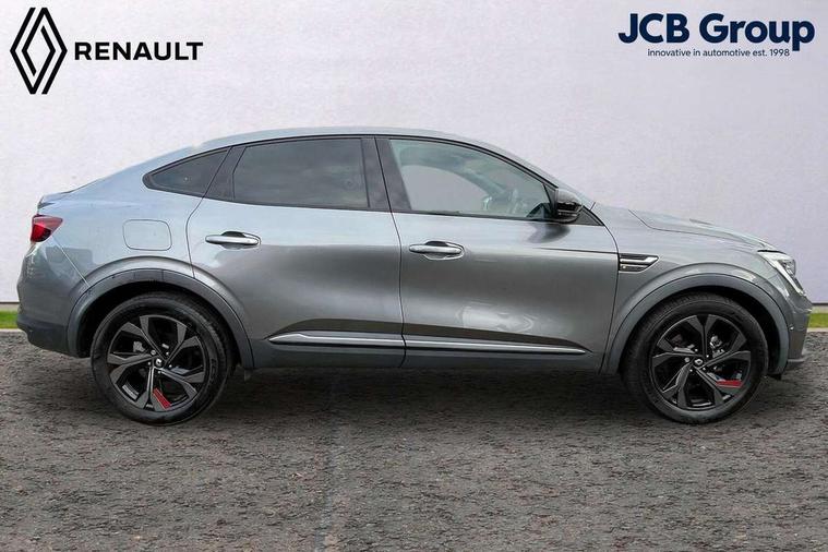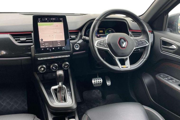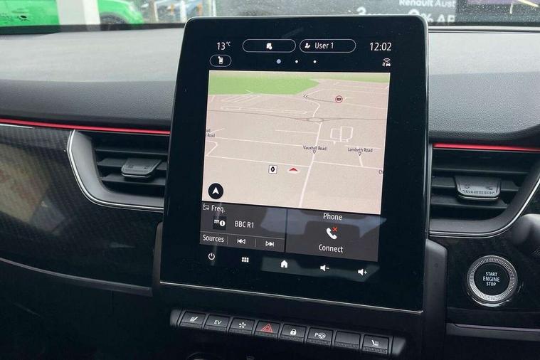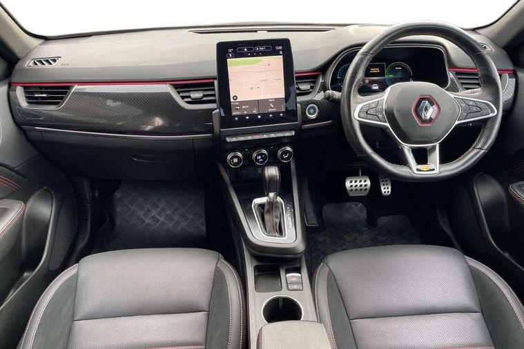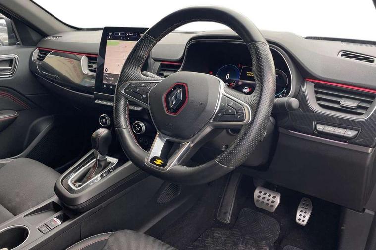 7" TFT Driver information display, Blind spot warning, Bluetooth system, EASY LINK 9.3" portrait touchscreen with navigation, Google search and traffic information, eCall emergency call system, Eco mode, EV button to activate pure mode, Front and rear parking sensors, Gear change indicator, Lane departure warning, Lane keep assist, Multi-sense - 3 driving modes and 8 ambient lighting, Rear cross traffic alert, Rear view camera, Renault automatic emergency assist, Smartphone integration compatible with Apple CarPlay and Android Auto, Traffic sign recognition with over speed prevention, Trip computer, Variable assistance electric power steering, Wireless phone charger, DAB radio, USB port, 3rd brake light, Auto dimming rear view mirror, Automatic headlights, Automatic high / low beam, Automatic windscreen wipers with rain sensor, Black side door protection with gun metal insert, Body coloured bumpers, C-shaped LED front signature lighting, Chrome decopart on wing (fender molding) with R.S. Line badge, Double chromed exhaust tailpipes elements, Extra tinted rear windows and tailgate, Frameless rear view mirror, Front and rear electric windows, Front bumper with F1 blade and honeycomb front grille, Front driver window with one touch facility and anti-pinch function, Front grille with chrome on upper part, Full LED headlights, Glossy black door mirror and lower window lining, Gun Metal front and rear skid plates, Heated rear window, R.S. Line badges on front wing and hatch door, Rain sensor, Rear windscreen wiper, Shiny black shark fin antenna, Side mirrors adjustable electrically, electrically foldable, with defrosting and temperature sensor, automatically foldable at vehicle closure, 3 seat bench in 2nd row, 60:40 split and fixed base rear seats, Aluminium pedals, Automatic climate control with combined filter, humidity sensor and AQS, Black interior roof lining, Carbon style dashboard, Central console with storage, Driver's seat height adjustment, Electrically adjustable front seats, Front and rear head restraints, Height and reach adjustable steering wheel, ISOFIX child seat fixing points on rear outermost seats, LED front and rear roof lights, Passenger seat height adjuster, R.S. line black suede-leather upholstery with red/grey stiching, R.S. Line perforated leather steering wheel with red/black harmony and R.S. Line badge, Rear air vents, Red inserts on air vents, Single front passenger seat, Parking Pack - Hands-free parking & flank protection - Arkana, Winter pack - Arkana, 3x3 point rear seat belts, ABS+EBA, Active emergency braking system, B Brake Mode - One pedal driving with increased regenerative braking, Distance warning alert, Driver airbag, Driver and passenger front and side airbag deactivation, Driver and passenger side airbags, Driver height adjustable seat belt, Electronic parking brake with auto hold, ESC (Electronic Stability Control), Front and rear no seatbelt warning sound, Front curtain airbags, Front head airbags, Hill start assist, Passenger airbag, Tyre pressure warning light, Anti drill door locks and locking fuel cap, Central door locking, Deadlocking system, Hands free keycard with Keyless access and start, RAID (Renault Anti-Intruder Device) automatic door locking, Rear side wing door and window child locking function (front driver door control panel), Superlocking, Thatcham alarm, 18" Silverstone diamond alloy wheels with red inserts,