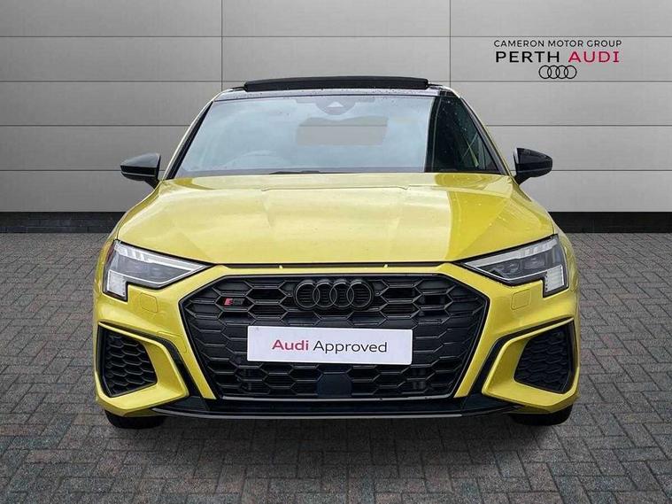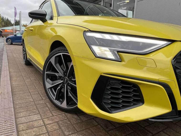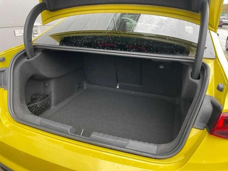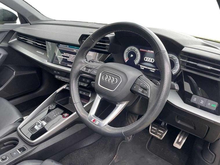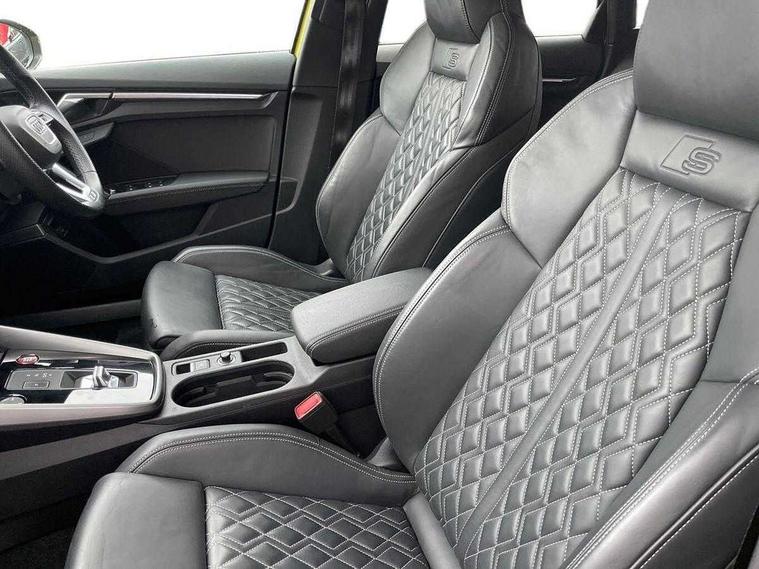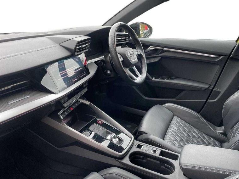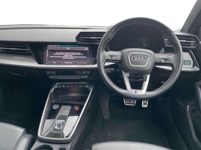 Audi connect emergency call and service, Audi drive select (Auto, Comfort, Dynamic, Efficiency and Individual), Audi smartphone interface, Audi virtual cockpit plus - 12.3" dynamic digital instrument cluster, Automatic start/stop system with recuperation, Bluetooth interface, Collision avoidance assistant, Head up Display, Lane departure warning system, MMI Navigation Plus with high resolution 10.1" colour touch screen display, Progressive steering, Reversing camera, Service indicator, Voice control system with natural language interaction, Quattro permanent all wheel drive, S sports suspension with damper control and lowering by 15mm, 2x USB Type C ports (for charging and data transfer), Bang and Olufsen premium sound system with 3D sound, CD player, DAB Digital radio, 3rd brake light, Acoustic glass windscreen, Audi Beam uses LEDs to project Vorsprung onto the ground as you exit your S3, Audi matrix LED headlights, LED rear lights, dynamic front and rear indicators and headlight cleaning system, Auto dimming frameless rear view mirror, Electric panoramic sunroof, Electrically adj heated/folding + automatically dimming exterior mirrors with memory + automatic kerb side function for passenger side exterior mirror, Front electric windows, Illuminated door sills with aluminium inserts at the front with S logo, Integrated LED indicators in door mirrors, LED daytime running lights, Light and rain sensors, Model and engine designation badges at rear, Privacy glass - dark tinted rear window, rear door and side windows, Rear boot, Rear electric windows, Rear side wing doors, 12V socket and storage compartment in front centre console, 3 seat bench in 2nd row, 3 spoke leather multifunction steering wheel with gear shift paddles, 4 way electrically adjustable lumbar support for driver and front passenger, 40/20/40 split folding rear seat bench with cupholder, Black cloth headlining, Dual zone electronic climate control, Electrically adjustable front seats with memory function for driver's side and exterior mirrors, Front and rear centre armrest in leather, Front and rear headrests, Front/rear floor mats, Heated front seats, Height and reach adjustable steering wheel, Illuminated vanity mirror, Interior lighting - glove compartment light and right hand side, Luggage compartment floor covering, Single front passenger seat, Stainless steel pedals and front footrest in black, Body styling design pack - S3, Driver Assistance pack - A3 Saloon, Extended ambient lighting pack - A3/S3 Saloon, LED interior lighting pack - A3 Saloon Edition 1/Vorsprung, Storage pack - A3/S3 Saloon, 3x3 point rear seat belts, Driver and front passenger airbag with passenger airbag deactivation, Electronic Stabilisation Control (ESC) including ABS, ASR and EDL, First aid kit with warning triangle and 2 safety vests, Front side airbags with head airbags and interaction airbag, Hill hold assist, Pre-sense front with pedestrian and cyclist detection, Seatbelt monitoring, Tyre pressure loss indicator, Advanced key and power operated tailgate - Luggage compartment lid opens electrically, Anti theft alarm, Anti-theft wheel bolts, Immobiliser, Manual child locks, Remote control central locking, Aluminium air vent surrounds, Aluminium trim elements, Carbon inlays, accent surfaces in the dashboard and centre console in platinum grey silk effect paint finish,