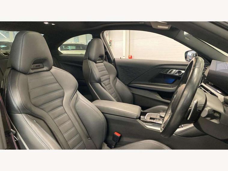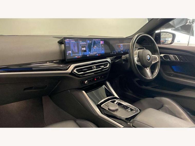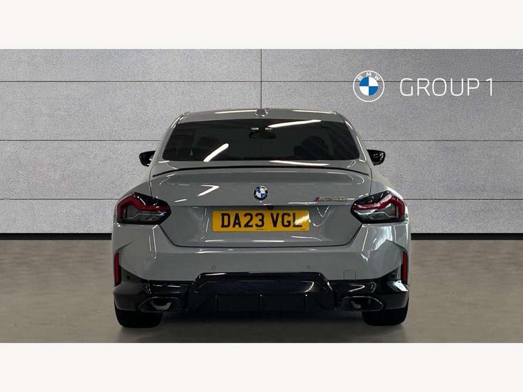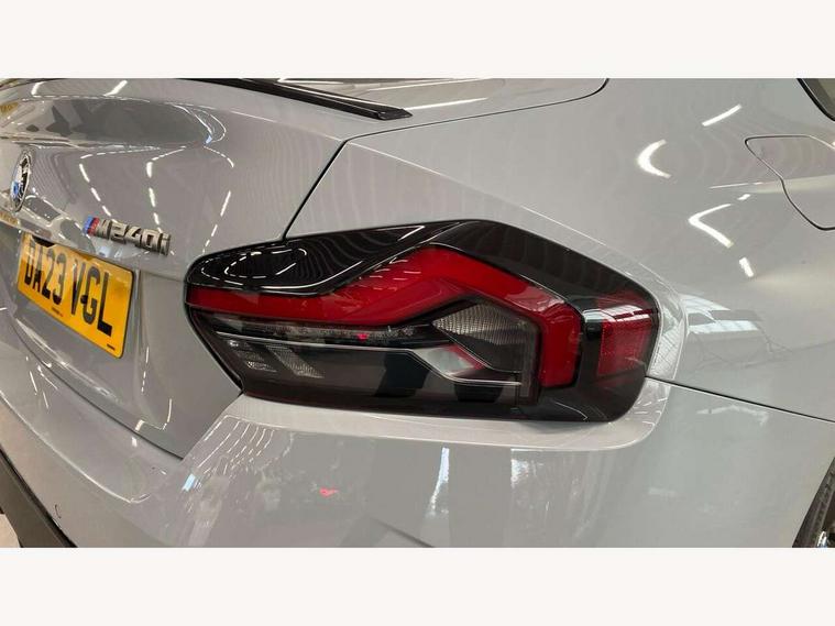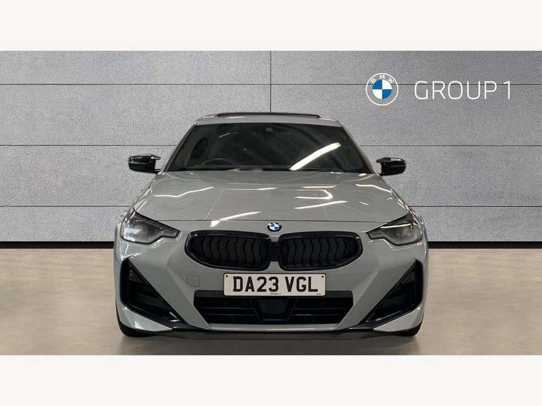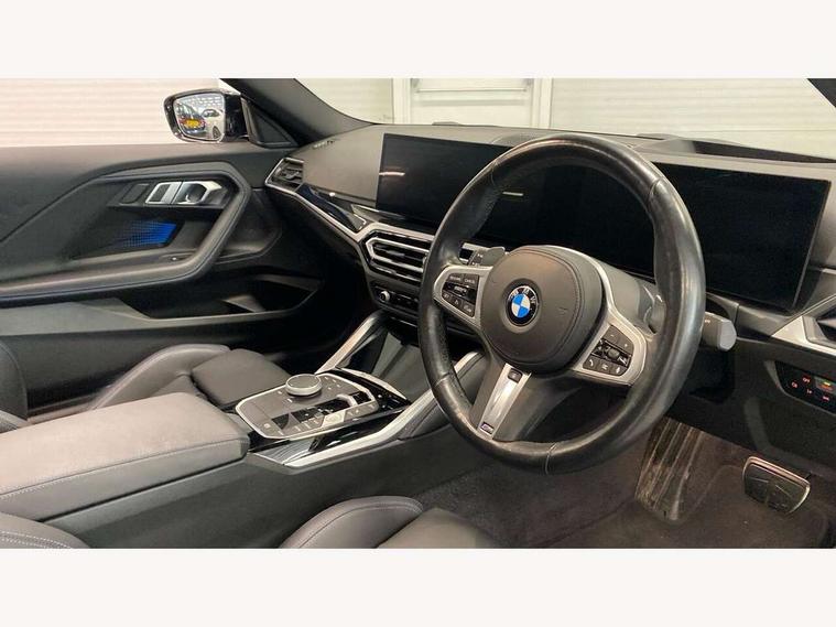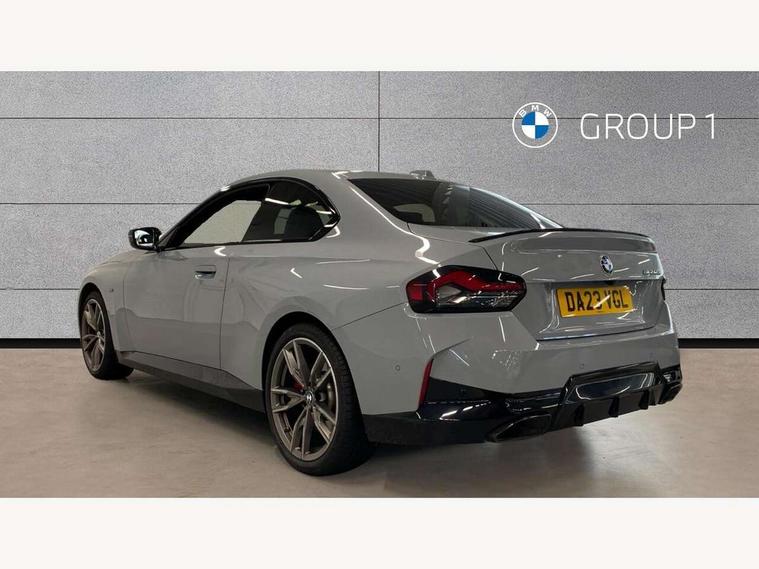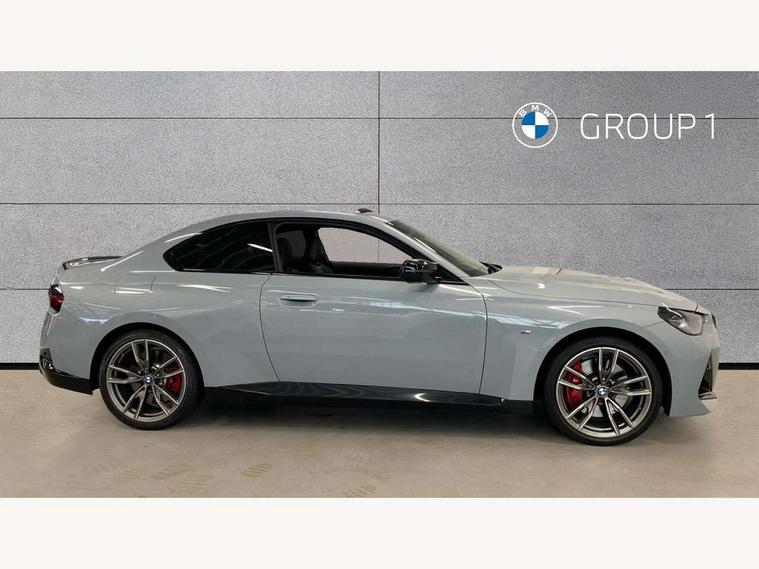 2 USB connections for charging and transferring data, 4G LTE connectivity with hard wired 4G network sim card, Attentiveness assist, Bluetooth with USB, BMW ConnectedDrive online services, BMW Intelligent Personal Assistant, BMW operating system 8 with variable, configurable widgets display information in real time, BMW Teleservices, Check Control warning system for monitoring of lights and door/luggage compartment open warning, Direct selection buttons, Drive off assistant, Driving experience switch with sport+ mode, Eco pro mode, Electric power steering, Front and rear parking sensors, Front/rear Parking distance control, iDrive controller with turn and press function, Integrated owners handbook, Intelligent functions, Live cockpit plus with nav function 12.3" instrument cluster and 14.9" centre display, Oil sensor for level and grade, Optimum shift indicator, Personal Profile, Touch operation on control display, Variable sport steering, Widescreen multi-media display, WiFi interface for wireless connection of mobile terminal devices, Aluminium lightweight construction, Balancer shaft, BMW TwinPower Turbo inline 6-cylinder petrol engine, Double VANOS, Drive performance control with ECO PRO comfort + sport mode, High precision injection, M Sport differential, Petrol Particulate Filter, Sport automatic steptronic transmission with gearshift paddles, manual gearshift time display, launch control, coasting idle ECO PRO/COMFORT modes, Twin scroll turbocharger with Valvetronic, xDrive with rear orientated application, DAB tuner, Acoustic windscreen wipers for reduced driving noise, Adaptive LED Headlights, Automatic windscreen wipers and automatic headlight, Automatically dimming rear view mirror, BMW individual lights shadow line, Body colour door handles flush with door surface, Body colour front and rear bumpers, Daytime running lights, Electric windows - front and rear, with open/close fingertip control and trap release, Exhaust tailpipes x 2 - free form finisher in black chrome in left and right, Exterior air inlets in front bumper with embellishers in high gloss black, Fading support, Flap controlled M Sport exhaust system, Front and rear bumper system with replaceable deformation elements, Front door sill finishers in black plastic with BMW designation, Front ornamental grille frame in high gloss black, Front windscreen wipers with integrated washer jets, Green tinted heat protection glazing, High beam assistant, High gloss black exterior M mirror caps, High gloss black sill, bumper trim sides and diffuser insert, High gloss shadowline exterior trim in mirror triangle cover, mirror cover panel, mirror bezel and window border, High level third brake light, Indicators integrated int mirror housing, LED registration plate light, LED technology rear tail lights, brake lights and turn indicators, Lightweight engineering, M Sport spoiler - Gurney in body colour, Model designation and M badges in cerium grey, Model designation on right side of tailgate, Rear boot, Rear fog lights, Reversing light in rear light cluster, Shark fin antenna, Side frame decorative moulding black high gloss, Single part LED rear lights with smoked glass components, Sun protection glass, Trailer stabilisation logic, Visible VIN plate, xDrive designation on left tailgate, 12V power socket in front centre console with blanking plug, 2 cupholders in front centre console, 2 zone automatic air conditioning, Ambient lighting, Compartment in front of cupholder, Conditioned based service, Driver seat backrest width adjustment, Electric front seat adjustment with driver memory, Front and rear side armrests integrated into door trim, Front armrest, Front door pockets, Front head restraints, Front M Sport seats, Front passenger seat lumbar support, Heated front seats, Illuminated glove compartment with separate small compartment, Lumbar support for driver, M headliner Anthracite, M sport leather steering wheel, M240i badge in instrument cluster, Manually adjustment steering wheel column, Rear seat backrest with manual 40:20:40 split folding, Rear seat centre foldable armrest with integrated cup holder, Single front passenger seat, Storage compartment between rear seats, Storage tray and compartment with cover in centre console, Sun visors with vanity mirrors and insert tab, Through loading system with 40/20/40 split folding 2 rear seat in 2nd row, Two folding rear seat headrests, Velour floor mats, Vernasca leather upholstery, Additional storage compartment pack without USB - 2 Series Coupe, Connected pack professional - 2 Series Coupe, Interior and exterior mirror pack - 2 Series Coupe, M Sport exterior styling aerodynamics pack - 2 Series Coupe M240i, 2 tone horn, Anti lock braking system (ABS) with cornering brake control, Automatic Stability Control (ASC), BMW emergency call, Brake drying, Child seat ISOFIX attachment for the two outer rear seats, Crash sensor activating of airbags, Unlocking doors, hazard warning lights, interior light, safety battery terminal, Deactivation of fuel pump in the event of a crash, Driver and front passenger airbags, Driver and front passenger side airbags, integrated in the door side seat backrest bolsters for all seat variants, Dynamic brake control, Dynamic stability control + (DSC+), Dynamic Traction Control - DTC, Electrically operated hand brake including automatic hold function and automatic release when driving off, Front and rear disc brakes, Head airbags for all 4 outer seats, M seat belts, M Sport brake with red calipers, Manual deactivation of front passenger airbag, Seat belt security check for driver and front passenger, Seatbelt warning, Side impact protection, Three point seat belts on 4 seats including front belt stopper, pyrotechnic belt tensioners and belt force limiters, Tyre pressure sensor, Warning triangle and first aid kit, Alarm system (Thatcham 1) with remote control and electronic engine immobiliser, Central locking switch for all doors, fuel filler cap and luggage