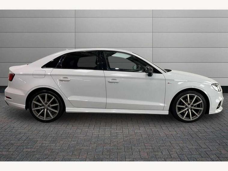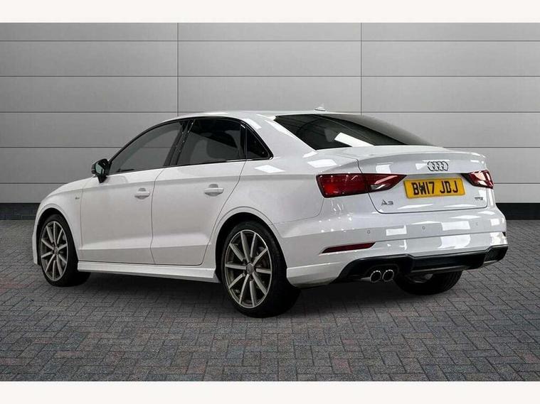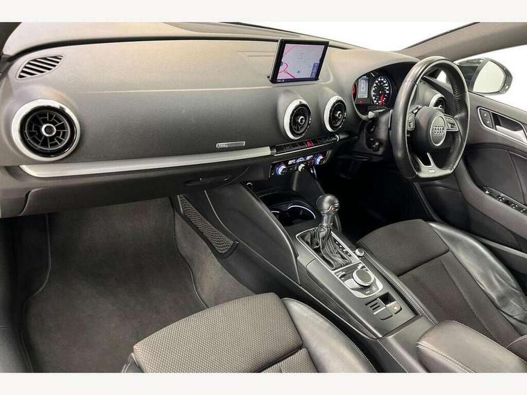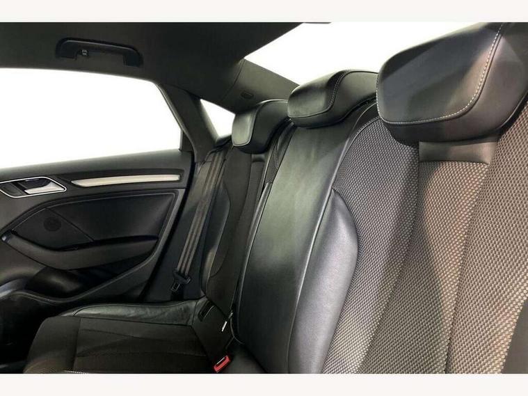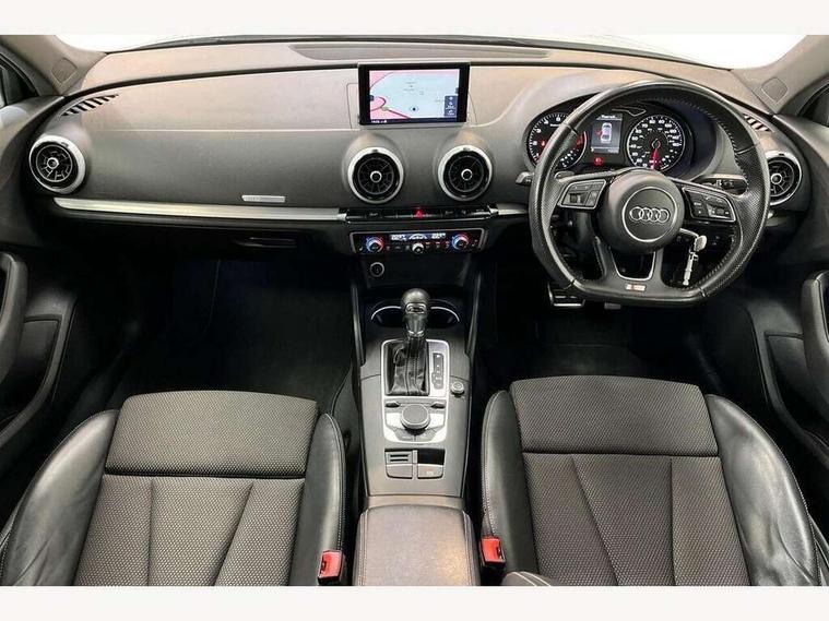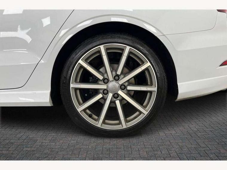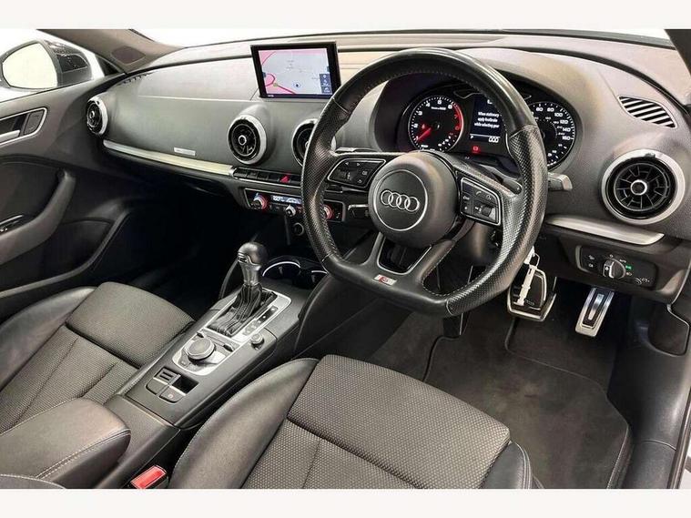 Audi connect, Audi drive select, Audi smartphone interface, Bluetooth interface, Colour driver's information system display, Service interval indicator, Voice control system, 2 USB ports, Audi music interface, Aux-in socket, DAB Digital radio, Aluminium side window trim, Automatic lights and wipers, Black door mirrors, Body colour bumpers, Body colour roof spoiler, Chrome exhaust tailpipes, Electric operated/heated door mirrors, Front and rear electric windows, Heated rear window, Heated windscreen washer jets, High gloss dark chrome radiator grille, LED daytime running lights, Privacy glass, S Line body styling, 3 adjustable rear headrests, 3 spoke flat bottom multi-function leather steering wheel including paddle shift, 4 lashing points to secure luggage, Adjustable front armrest, Black cloth headlining, Driver/passenger sunvisors, Dual zone electronic climate control, Front and rear interior lights with delay, Front/rear floor mats, Height/depth adjustable steering column, Illuminated door sills, Illuminated glovebox, ISOFIX child seat preparation+airbag deactivation, Jack and tool kit, Stainless steel pedals, Storage compartment in centre console, Storage compartments in doors, Storage under driver's seat, Black styling pack - A3/S3, LED interior light pack - A3/RS3, Light and rain sensor pack - A3 Saloon, Storage and luggage pack - A3/RS3, 3 point seatbelts on all seats, ABS/EBD, ASR, Curtain airbags, Driver and passenger side airbags, Driver/Front Passenger airbags, Drivers knee airbag, EDL, Electromechanical parking brake, ESC - Electronic Stability Control + traction control, Front passenger airbag deactivation, Seatbelt warning, Tyre pressure monitor, Warning triangle and first aid kit, Anti theft alarm, Anti-theft wheel bolts, Remote control central locking, Aluminium air vent surrounds, Aluminium trim elements, Space saver spare wheel,