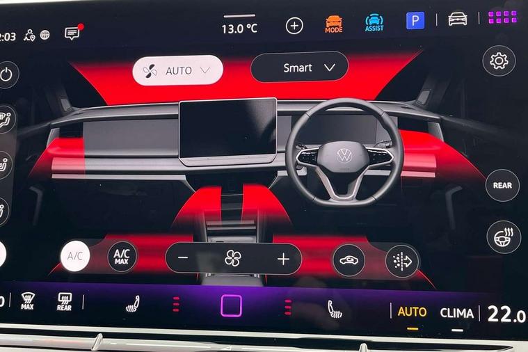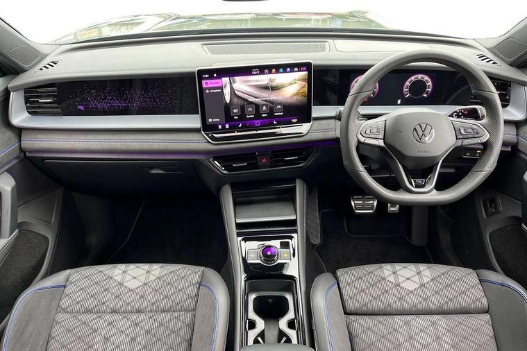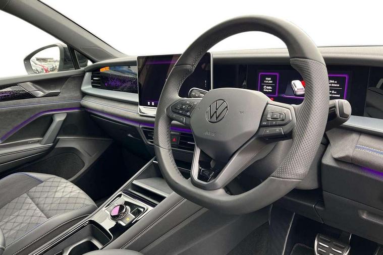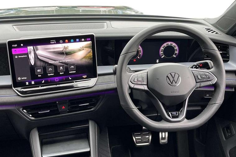 Adaptive cruise control (ACC), Digital Cockpit Pro - 10.25" high resolution dash display screen with customisable menus and information, Driver alert system, Driver attention monitoring system, Dynamic road sign display, E-Sim card for online connectivity, eCall emergency call system, Lane change system, Side assist, Rear traffic alert and Exit warning system, Multifunction front facing camera, Oncoming vehicle braking when turning including swerve support, Start/stop system with regenerative braking, Voice activation spoken voice commands for telephone and navigation system, Warning signal and warning light for front and rear seatbelts not fastened, Wireless App-Connect, Front wheel drive, Digital radio reception (DAB), Diversity antenna for FM reception, Air intake with Chrome trim, Auto dimming interior rear view mirror, Automatic headlight control system, Body colour door handles, Chrome moldings on the side windows, Coming/leaving home lighting function, Dynamic headlight range control with dynamic cornering light, Exterior mirrors convex on the left and aspherical on the right, Heat insulating glass in side and rear windows, Illuminated Volkswagen logo rear with animation, Laminated safety glass winshield, heat insulating, LED 3rd brake light, LED separate signature day time running light, Puddle lights, Rain sensor windscreen wipers, Rear fog light on one side, reversing light on both sides, Rear side wing doors, Rear wiper, Reverse activated passenger's door mirror, Surround lighting with welcome light, Volkswagen logo in front, illuminated lighting animation with wake up/goodbye scenario and illuminated door handles, 10 colour interior ambient lighting, 12V outlet in center console rear and in luggage compartment, 3 rear headrests, 3 rear seat bench in 2nd row, backrest split folding with centre armrest and 2 seats in 3rd row of seats, Black roof lining, Brushed stainless steel pedals, Carpet mats, front and rear, Centre console with illuminated storage compartment with sliding cover and two drinks holders, Chrome elements on the mirror switch and power window switches and door pulls, Door and side trim panel insert in Art velour, Flat luggage compartment floor, Front centre armrest, Front scuff plates in alumium, ISOFIX anchors for child seats on outer rear seats and front passenger seat compatible with i-Size, Mechanical rear seat release, Power adjustable lumbar support in front, Single front passenger seat, Sports comfort seats in front, Sun visors with illuminated vanity mirrors, 3 Point seat belts in front with pretensioners, 3 point seatbelts in outer rear with ECE label, Autonomous emergency braking front assist with pedestrian and cyclist monitoring, Driver and front passenger airbag with front passenger airbag deactivation, Electronic parking brake with auto hold, First aid kit with warning triangle and safety vest, Front and rear curtain airbags, Front and rear side airbags, Front centre airbag, Front disc brakes, Hill start assist, Rear disc brakes, Two tone horn, Decorative material set R-Line, Interior door handle in matte chrome,