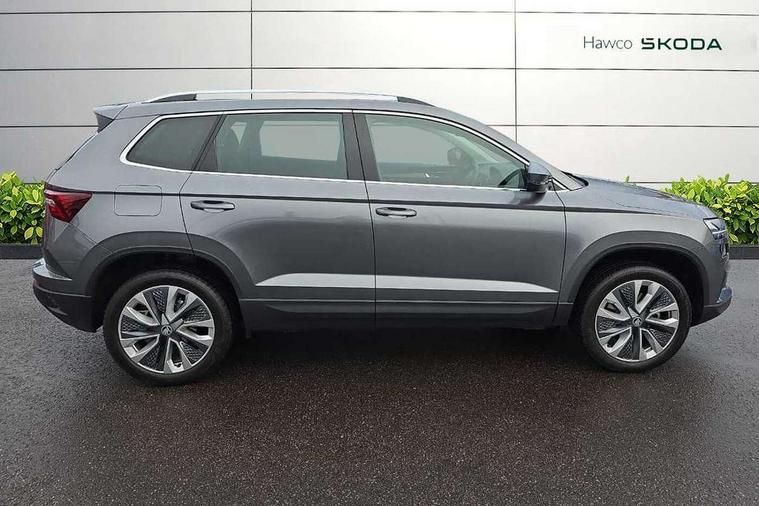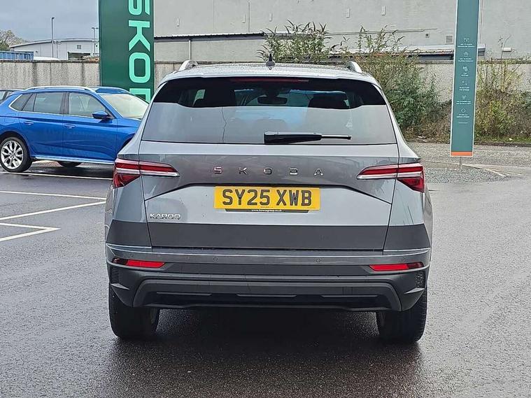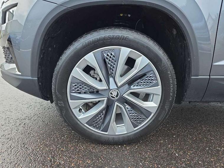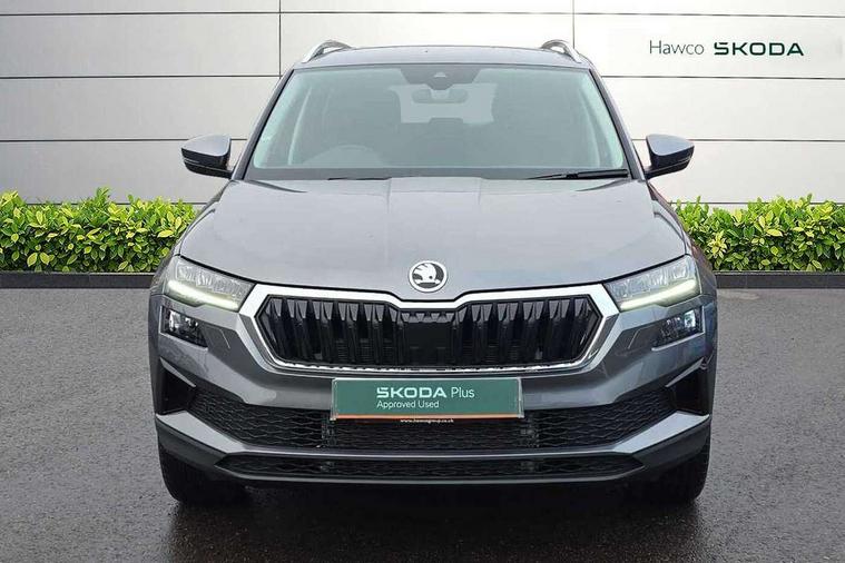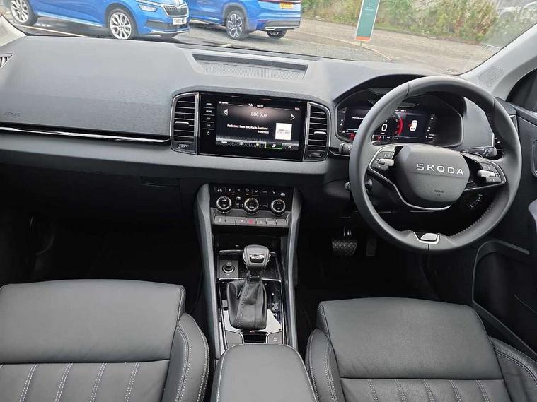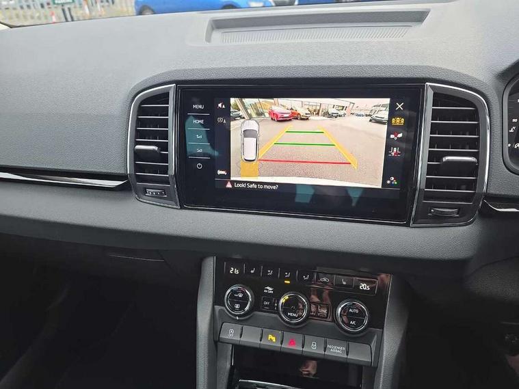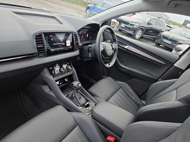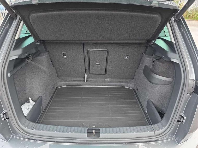Advanced driver attention and drowsiness monitor, Drive Mode Selection including ECO function, Electro-mechanical PAS, Emergency services call system, Outside temperature gauge, Sensor for driver assistance systems, Service interval indicator, SmartLink wireless for Apple and wired for Android, Start/stop system with regenerative braking, Traffic sign recognition, USB C Port x 2 in front centre console, Virtual Cockpit - 10.25" digital display, Virtual pedal with electrically operated boot door, Wireless smartphone charging, DAB radio with Bluetooth, USB connection, Acoustic glass, Aero front windscreen wipers with intermittent function, Auto dimming rear view mirror with light and rain sensors, Black electric window control buttons, Body colour door mirrors and handles, Electric front and rear windows with child proof lock, Extended rear roof spoiler, Heated rear windscreen, LED daytime running lights, LED rear lights with high functionality welcome effect and dynamic indicators, Light assistant (coming/leaving home/tunnel light), Plastic scuff plates in door apertures, Privacy glass, Rear side wing doors, Rear window wiper with washer system and intermittent control, Safety reflectors on front doors, Third brake light, Unique dark chrome design logo on alloy wheels, 1.5 litre bottle holders in driver and front passenger door panels, 12V socket in boot, 12v socket in front centre armrest with storage compartment and rear air vents, 2 spoke leather heated multifunction steering wheel with DSG paddles, 2 x Tablet holder, 3 rear height adjustable headrests, 3 seat bench in 2nd row, 4 foldable roof handles with rear coat hooks, Black floor carpet, Cargo elements in boot, Chrome inner door handles, Decorative door sills with KAROQ badging, Foldable hooks in the boot, Front head restraints, Height adjustable front three point seats belts with tensioners, Height/reach adjust steering wheel, Ice scraper, Illuminated glovebox, Illuminated luggage compartment, Interior noise suppression, Isofix child seat preparation for front passenger seat, Isofix child seat preparation outer rear, Manual lumbar support for front seats, Pearl grey interior ceiling, Pen holder, Pollen filter, Rear boot cover, Rear package tray, Rear reading lights, Rubbish bin door, Safety vest holder, Single front passenger seat, Skoda lettering on steering wheel, Storage box in upper central dashboard closed, Sunvisors with illuminated vanity mirrors, Textile floor mats, Ticket holder, Columbus pack - Karoq, Design Pack - Karoq, Non Smokers pack, Parking pack - Karoq, Automatic door unlocking in case of crash, Automatic fuel cut off in case of crash, Driver airbag, Electronic parking brake with auto hold function, Emergency rear braking signal, ESC (incl. ABS+MSR+ASR+EDS+HBA+DSR+RBS+MKB), Front side airbags, Head airbags, Hill hold control, Knee airbags, Passenger airbag with switch-off function, Pedestrian monitor, Power operated child safety locks, Seatbelt reminder signalisation and pretensioner for all seats, Three point seatbelts rear, Two tone horn, Tyre pressure monitor, Alarm with interior monitoring, back up horn and tilt sensor with safe function, Electronic engine immobiliser, Keyless entry and start/stop, Remote central locking with 2 remote folding keys, Black centre console, Chrome framed air vents, Satin black dashboard, Anti-theft wheel bolts protection, Breakdown and tool kit,