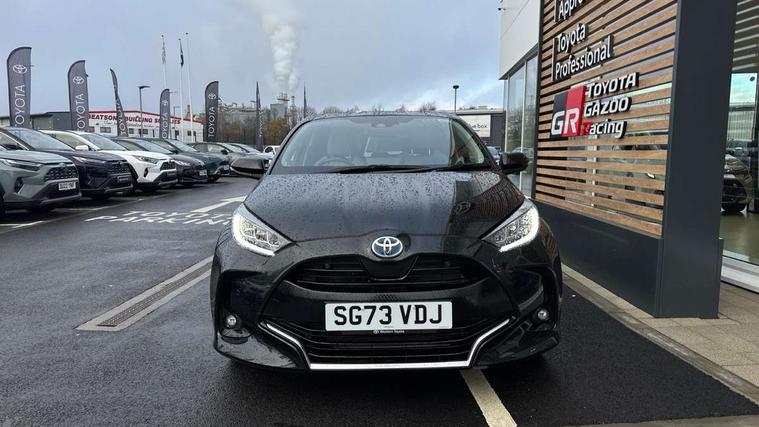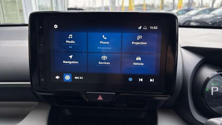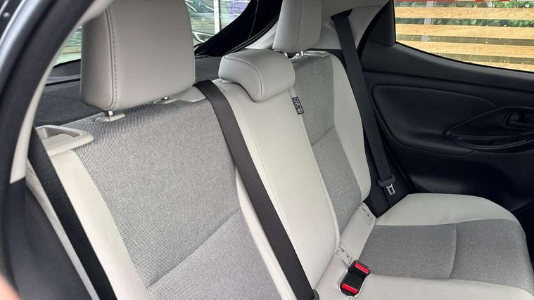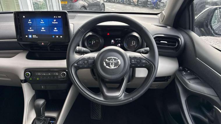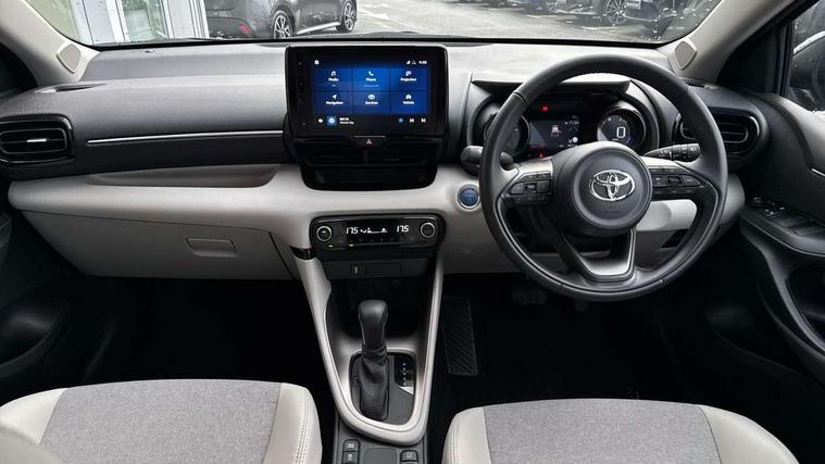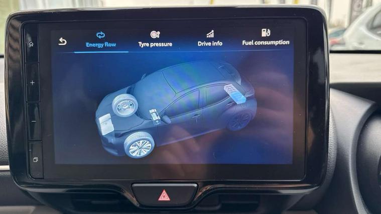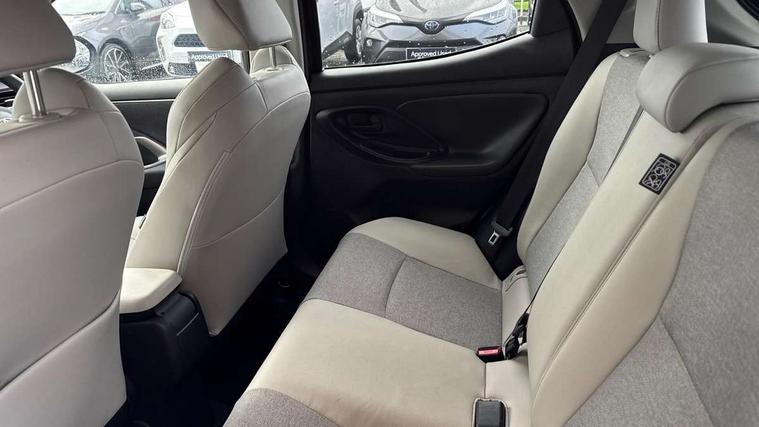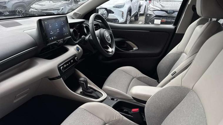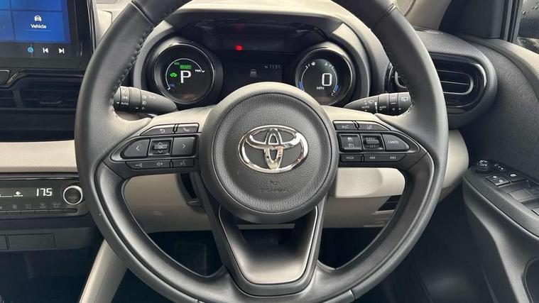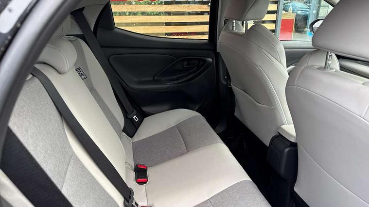 Adaptive cruise control, Adjustable speed limit with speed warning, Blind spot monitoring, Bluetooth connectivity, Colour binocular inspired displays with digital speedometer, E-call, Electric power steering, Hybrid energy display, Multi information display switches on steering wheel, Reversing camera, Smartphone integration with Apple CarPlay and Android auto, Tailgate, Touch 2 navigation system, Voice recognition, Vehicle Stability Control (VSC), 6 speakers, 9" HD multimedia display touch screen with Toyota smart connect, USB connection, Acoustic windscreen glass, Auto windscreen wipers, Automatic headlights, Automatically retractable door mirrors, Body coloured door mirrors, Electric adjustable heated door mirrors, Follow me home headlights, Front auto power windows with anti jam protection, Full LED rear lights, LED daytime running lights, LED front fog lights, LED front light guide, LED Headlights, LED High mounted stop lamp, LED Indicators, LED rear light guide, Manual headlight levelling, Painted chequered front grille, Rain sensor, Rear auto power windows with anti jam protection, Rear privacy glass, Rear side wing doors, Rear spoiler, Rear wiper, Satin lower front grille, Shark fin antenna, Turning signal integrated indicators in door mirrors, Variable front intermittent wipers, 3 adjustable rear headrests, 3 seat bench in 2nd row, 3 spoke leather steering wheel, 60/40 split folding rear seat, Active headrests, Adjustable boot height, Coat hooks in rear grab handles, Cup holders (2 front & door), Data Communication Module (DCM) connected services, Dual zone automatic air conditioning, Fabric seat with partial synthetic leather upholstery, Front armrest, Front sport seats, Glovebox, Grey roof lining, Height adjustable driver's seat, Height adjustable passenger seat, Isofix seat fixing, Leather gearshift, Map pockets on the backs of the front seats, Pollen filter, Shopping bag hooks, Single front passenger seat, Tilt/telescopic steering column, Parking pack - Yaris, 3 point seatbelts on all rear seats, ABS+EBD+Brake assist, Electronic parking brake, Emergency brake light system (EBS), Front passenger airbag on/off switch, Front seatbelt reminder, Hill start assist control (HAC), Rear child proof door locks, Rear seat belt reminder, Supplemental Restraint System (SRS) 8 airbags: Driver & passenger's airbags, dual side curtain airbags, side impact airbags, front centre airbag, Toyota Safety Sense 2, Precollison + Night time Pedestrian & Cyclist Detection, Lane Trace Assist, Auto High Beam, Intelligent ACC & Road Sign Assist, Tyre pressure warning system, 2x Master key, Alarm/immobiliser, Keyless smart entry with push button start, Remote AC via MyT, Remote locking via MyT, Remote powered central double locking doors, Satin chrome interior styling, Soft touch instrument panel, Space saver spare wheel,