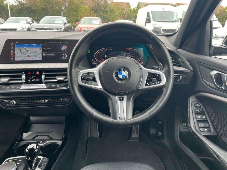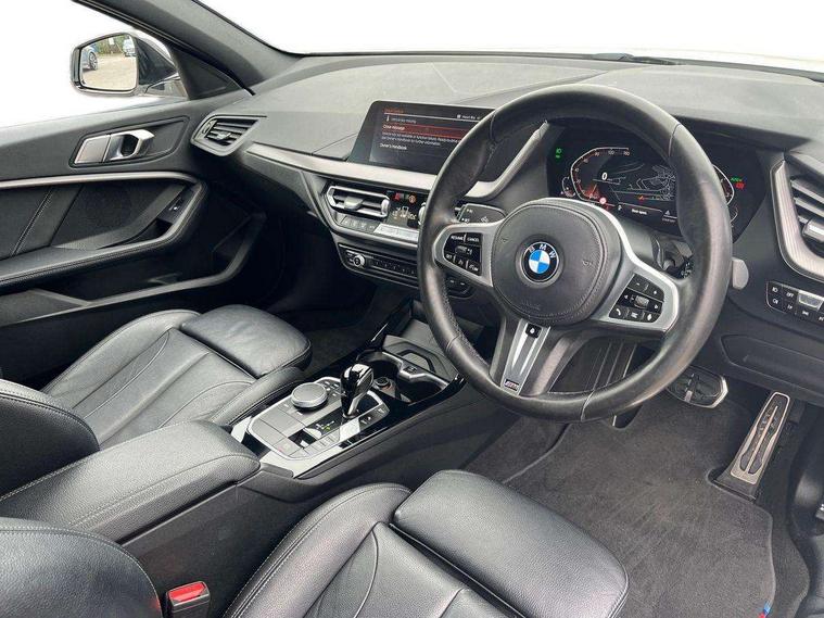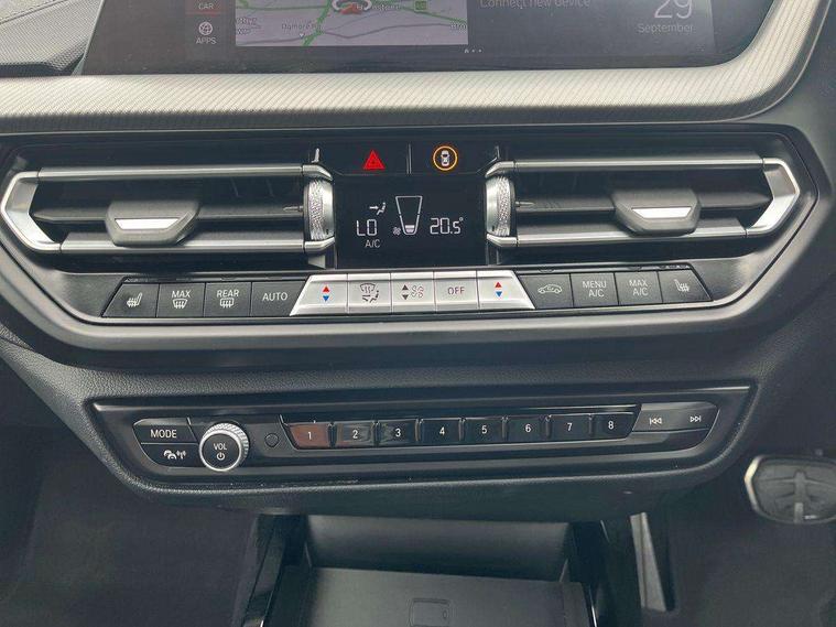 Active guard plus, Attentiveness assist, BMW Online services, BMW Teleservices, Check Control warning system for monitoring of lights and door/luggage compartment open warning, Connected eDrive Services, Eco pro mode, Integrated owners handbook, Oil sensor for level and grade, On board computer, Optimum shift indicator, Personal Profile, Pull away assistant, Speed limiter, Aluminium lightweight construction, Anti roll bar front and rear, Balancer shaft, Double VANOS, Drive Performance Control, Electronic differential lock, High precision injection, M sport suspension, Petrol Particulate Filter, VALVETRONIC engine management, Bluetooth audio streaming, DAB Digital radio, Auto dimming rear view mirror, Automatic headlight beam throw control, Automatic windscreen wipers and automatic headlight, Body colour door handles, Body colour mirror caps, Chrome 'M' logo side designation, Chrome exhaust tailpipe in single, round (Exhaust tailpipe, stainless steel - single, round), Chrome kidney grille frame with Satin Aluminium struts, Direction indicator side lights in exterior mirrors, Electric folding and anti dazzle exterior mirrors, Fading support, Follow me home headlights, Front and rear bumper system with replaceable deformation elements, Front and rear electric windows with open and close fingertip control, anti trap facility and comfort closing, Front door sill finishers in black plastic with M designation in metallic look, Green tinted heat protection glazing, Heated, electrically adjustable exterior mirror aspheric on driver side, convex on passenger side, High gloss shadowline window frame, Recess cover mirror frames and B/C pillar embelisher trim, High level third brake light, LED daytime running lights, LED eyebrow turn indicators, LED front fog lights, Lightweight engineering, Matt black air guide grilles, Model designation on right side of tailgate, Nearside reverse light in rear light cluster, Preparation for high beam assistant, Rain sensor including auto headlights activation, Rear fog lights, Rear window wiper, Shark fin antenna, Visible VIN plate, Welcome lighting, 12V power socket in centre console, 3 rear seat head restraints, 3 spoke M sports design leather steering wheel finished in nappa leather with specific M badge, Anthracite headlining, Anthracite Velour floor mats, Child seat ISOFIX attachment for two outer rear seats and front passenger seat with anchorage points, Conditioned based service, Dakota leather upholstery with perforation and contrast stitching, Driver and front passenger seat heating, Folding rear clothes hook, Four grab handles integrated in roof lining, Front and rear door pockets, Front and rear door pockets with bottle holders, Front and rear side armrest integrated into door trim, Front armrest foldable with integrated storage compartment, Front sports seats with electric side bolster adjustment, Glove compartment, Height adjustable front head restraints, Manual adjust steering wheel, Multi-function controls for steering wheel, Storage compartment in centre console, Sun visors with vanity mirrors and insert tab, Two zone automatic air conditioning, Additional interior lighting pack - 1 Series, Connected pack professional - 1 Series, Extended storage pack - 1 Series, Interior lights pack - 1 Series, Luggage compartment pack - 1 Series, M Sport exterior styling aerodynamics pack - 1 Series, 2 tone horn, 3 point seatbelts on all seats, front pyrotechnic belt tensioners, stopper and belt force limiters, rear coded belt buckles, Airbags - front driver/passenger, front & rear curtain, front side, Anti lock braking system (ABS) with brake assist, BMW emergency call, Brake drying, Braking readiness, Crash sensor activating central locking release, hazard warning lights, fuel cut off, interior lighting + activation of safety battery terminal clamp, Driver and front passenger seat belt security check, Dynamic stability control + (DSC+), Dynamic Traction Control - DTC, Electrically operated hand brake, Front and rear disc brakes, Front passenger manual airbag deactivation, Seatbelt warning, Side impact protection, Tyre pressure monitoring system, Warning triangle and first aid kit, Automatic drive away locking facility, Central locking switch for all doors, fuel filler cap and luggage compartment, Deadlocking function system to all doors, Locking wheel bolts, Remote control with integrated key with High-gloss Black inlay and M designation and 1 button for open/ close lock, window, open luggage compartment, Start/stop button with comfort go keyless engine start and auto start stop deactivation button, Thatcham Cat.1 alarm and immobiliser, Contrast stitching on instrument panel, Reduced rolling resistance tyres,