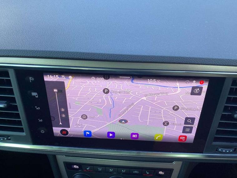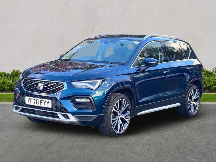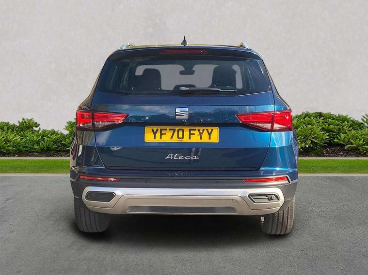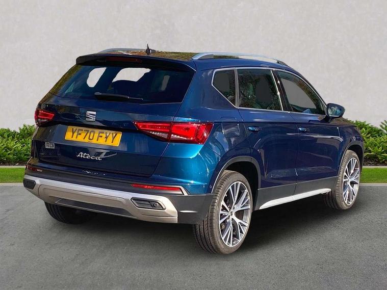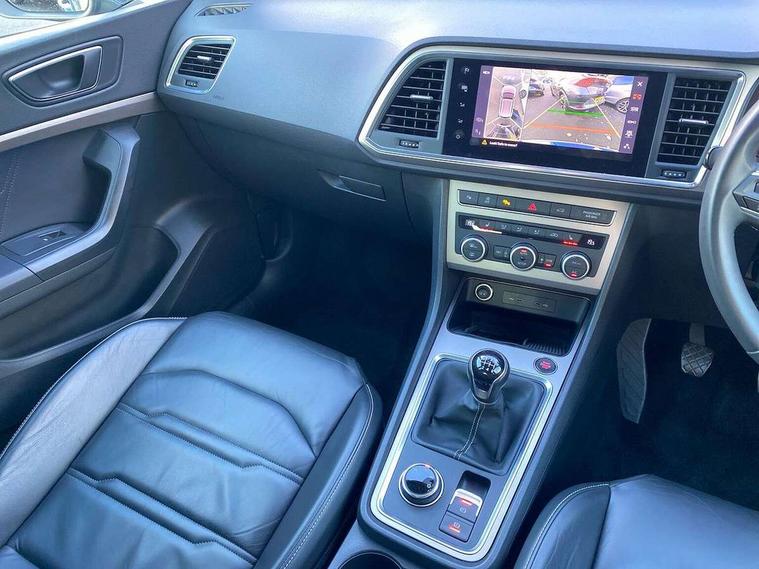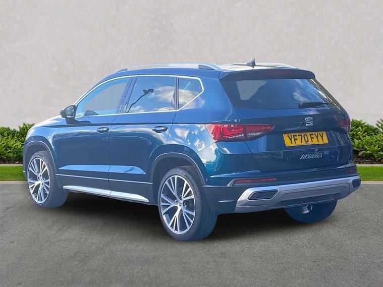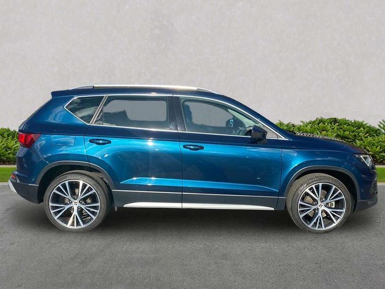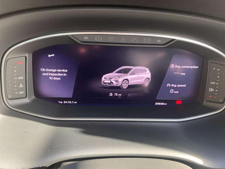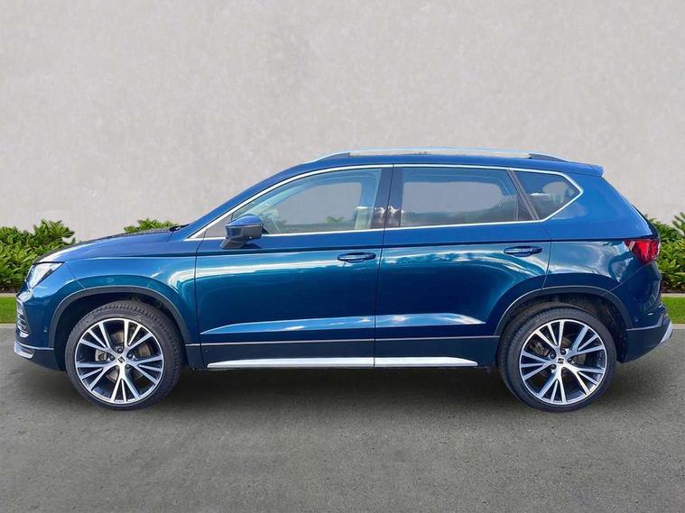 Digital cockpit, Electric tailgate with virtual pedal, Outside temperature gauge, Progressive power assisted steering, Rear view camera, SEAT drive profile with driving experience button - Normal, Sport, Eco and Individual mode, steering and throttle response, Self parking functionality (includes front and rear parking sensors), Side and exit assist, Top view camera, Trip computer, Wireless full link smartphone integration, Wireless phone charger, Steering wheel mounted audio/phone controls, Black simulated exhaust pipes, Body colour bumpers, Body coloured wheel arch surrounds, Chrome front grille frame, Chrome roof rails, Chrome side window trim, Dark tinted rear windows, Daytime running lights, Door mirrors with welcome light silhouette, Dynamic headlight range control with self adjusting whilst driving, Electric adjustable/heated/folding door mirrors, Front and rear electric windows, Front grille hot stamping, Full LED headlamps with lens and LED front fog lamps with cornering function, Illuminated aluminium front door sill, LED rear tail lights with dynamic indicators, Rear fog lights, Rear wash/wipe, Reflex silver side mouldings, 12V socket in front, 60/40 split folding rear seat, Dual zone climate control, Front and rear head restraints, Front centre armrest, Front seat back storage pockets, Heated front seats, Height adjustable driver and passenger seat with lumbar adjustment, ISOFIX points in outer rear seats with top tether anchorage points, Leather steering wheel and gear knob, Leather upholstery with front sports seats, Multicoloured ambient lighting with LED interior illumination, Rear armrest and easy back seat release mechanism from boot, Storage compartment in roof console for sunglass, Storage compartment under driver's seat, Convenience pack - Ateca, Interior lighting pack - Ateca, Navigation system pack with DAB - Ateca, Safe and driving pack - Ateca, 3x3 point rear seatbelts, ABS, Traction control system (TCS), Electronic stability control (ESC) and Electronic differential lock system (XDS), Airbags - Driver and front passenger airbag with deactivation, front side, two curtain and driver's knee airbags, Electric parking brake with auto hold function, Front and rear seatbelt reminder, Hill hold control, Tiredness recognition system, Traction control, Tyre pressure monitoring system, Alarm, Keyless entry, Locking wheel bolts, Chrome interior detailing, 19" Exclusive machined alloy wheels 36/4 in nuclear grey,