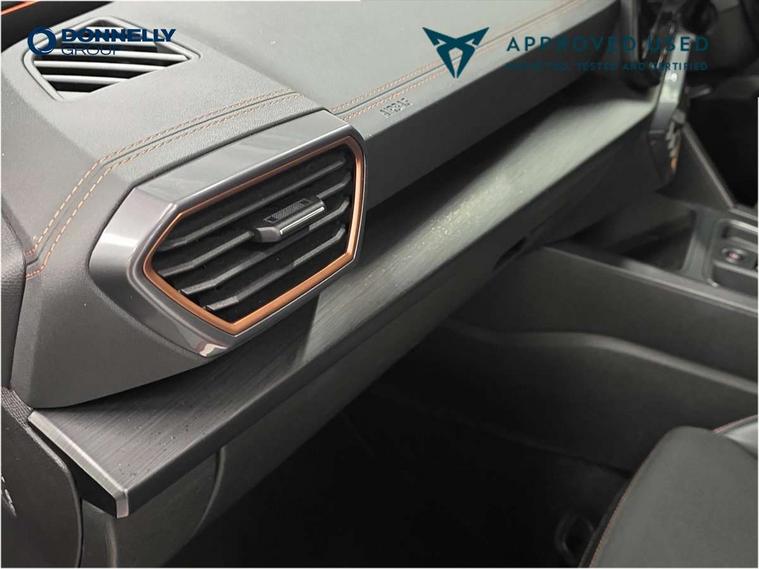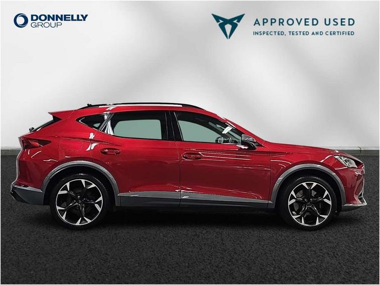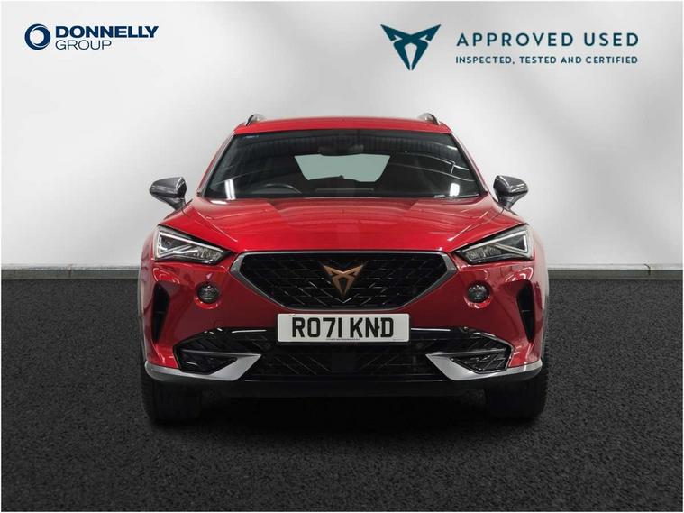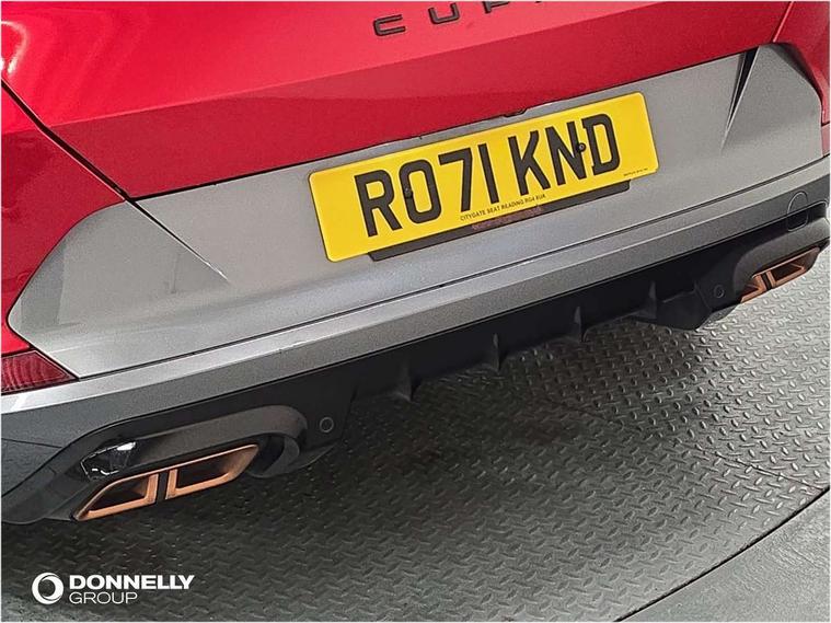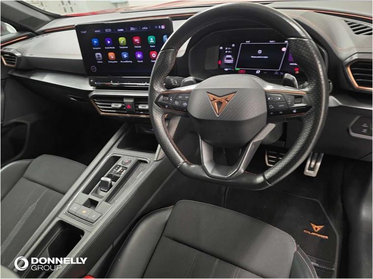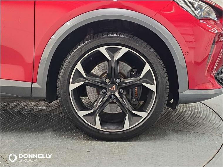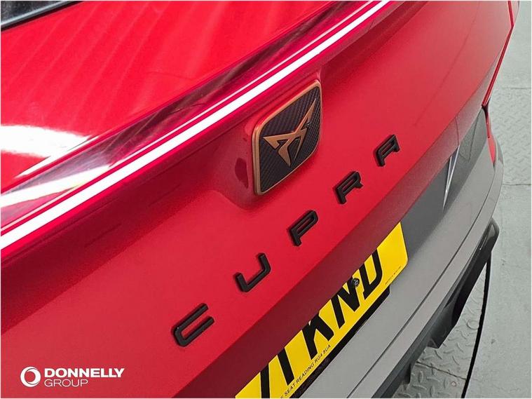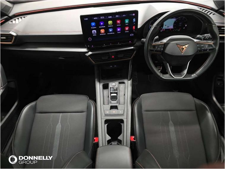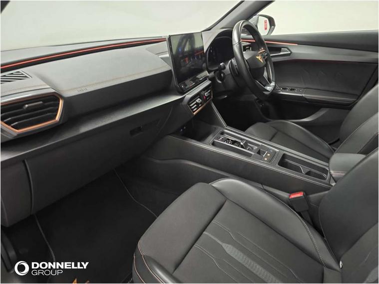 Digital cockpit and configurable dashboard, Driver alert system, Dynamic chassis control with driving profile selection (Comfort, Sport, CUPRA, Individual), Forward collision warning with automatic braking, Lane assist, Park assist (inc front/rear parking sensors), Predictive adaptive cruise control with speed limiter, Rear view camera, RPM, trip computer, outside temp gauge, instrument light brightness, low fuel warning light, lights on reminder, gearshift indicator, Service interval indicator, Speed sensitive power steering, Start/stop system with regenerative braking, Virtual pedal and electric tailgate, Wireless apple carplay, Wireless phone charger, 10 amp mode 2 charging cable, 16 amp mode 3 charging cable, 3.6 kw On-board charger, Electronic locking differential and dynamic traction support, Sports suspension with front shock absoption, 2 front and 2 rear USB type C sockets, 6 speakers, Auxiliary input socket, DAB radio, Auto dimming rear view mirror, Body colour door handles, Body coloured bumpers, Dark grey wing mirror, Daytime running light with automatic headlight control and coming home feature, Dynamic headlight range control, Electric front/rear windows, Electrically adjustable, heated and folding door mirrors, Front fog lamps with cornering function, Gloss black roof rails and window surrounds, LED Headlights, LED Taillights with dynamic indicator, Rain sensing wipers, Rear diffuser with single exhaust pipe on each side with simulated exhaust pipes, Rear wash/wipe, Sports bumpers, Tinted rear windows, Welcome lights, 12v power supply in centre console, 12V socket, 12v socket in loadspace, 2 front and 2 rear reading lights, 230V socket, 60/40 split rear bench seat with armrest and mechanical seat release, Black headlining, Cupra sports pedals, Dust/pollen filter, Front and rear head restraints, Front centre armrest, Height/reach adjust steering wheel, Illuminated interior front door sills, Illuminated sunvisor with mirror, Isofix, Leather multi function heated steering wheel with gear shift paddles, Luggage tie-down hooks, Manually adjustable height and lumbar support for front seats, PVC/Cloth upholstery with copper stitching + bucket seats, Three zone climate control with control panel in rear, Wraparound lighting, Navigation system pack - Formentor, 3 point seatbelts on all rear seats, ABS, Brake control system - ESC and brake booster, Child proof door locks, Driver and front passenger airbags with front passenger airbag de-activation, Electronic parking brake, Front and rear disc brakes, Front side curtain airbags, Hill hold control, Seat belt reminder for front and rear seats, Tyre pressure monitoring system, Anti theft alarm system, Keyless entry and start system (KESSY), Locking wheel bolts, Copper and aluminium interior detailing, 19" 'Exclusive' machined sport matte black and silver alloy wheels, Tyre repair kit,
