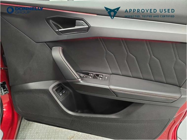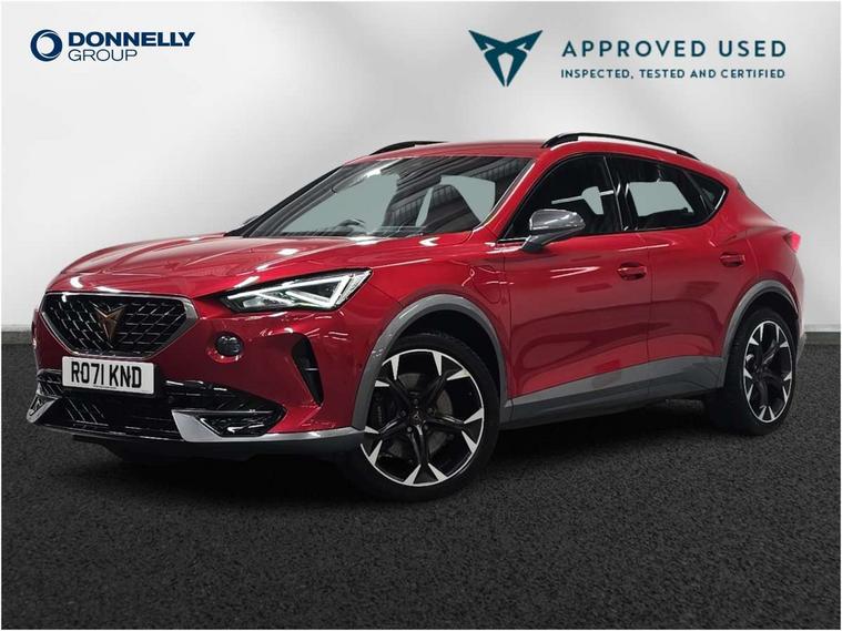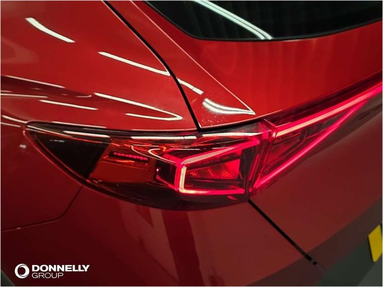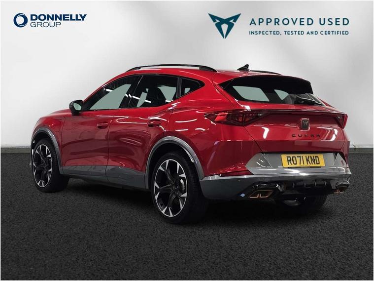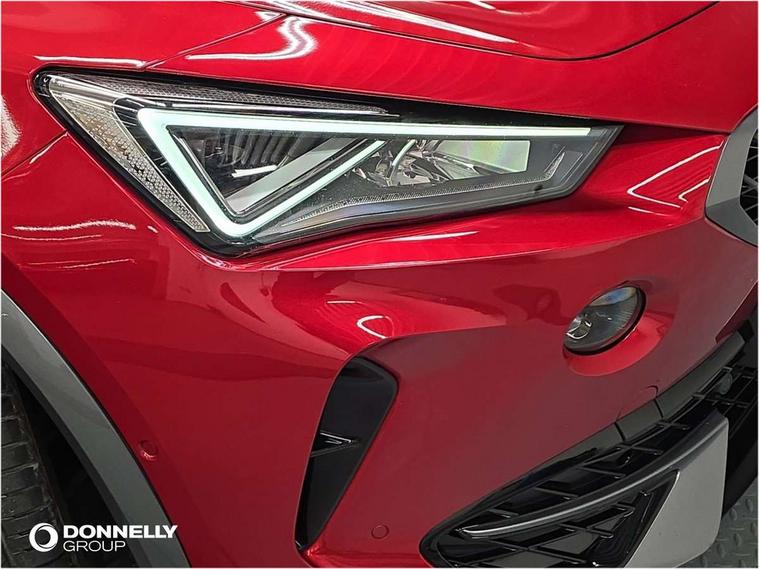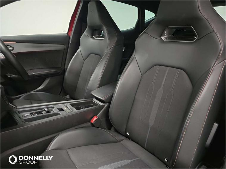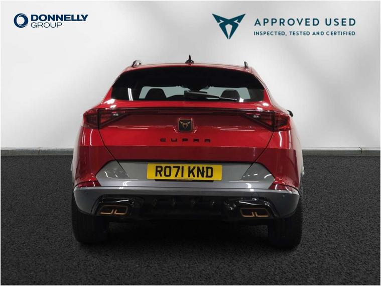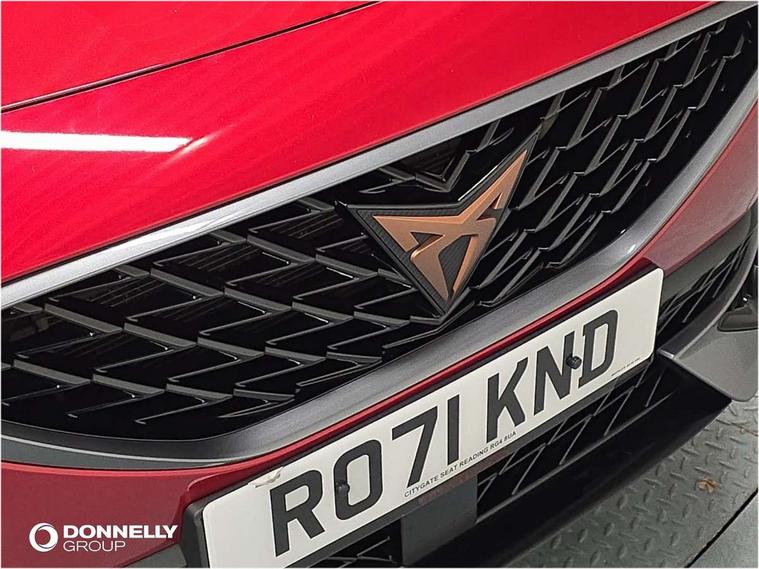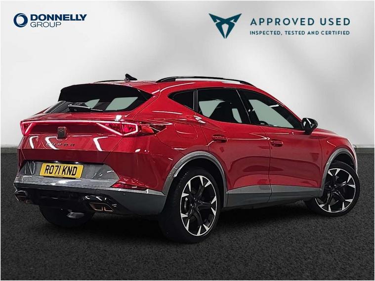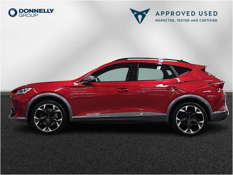 Digital cockpit and configurable dashboard, Driver alert system, Dynamic chassis control with driving profile selection (Comfort, Sport, CUPRA, Individual), Forward collision warning with automatic braking, Lane assist, Park assist (inc front/rear parking sensors), Predictive adaptive cruise control with speed limiter, Rear view camera, RPM, trip computer, outside temp gauge, instrument light brightness, low fuel warning light, lights on reminder, gearshift indicator, Service interval indicator, Speed sensitive power steering, Start/stop system with regenerative braking, Virtual pedal and electric tailgate, Wireless apple carplay, Wireless phone charger, 10 amp mode 2 charging cable, 16 amp mode 3 charging cable, 3.6 kw On-board charger, Electronic locking differential and dynamic traction support, Sports suspension with front shock absoption, 2 front and 2 rear USB type C sockets, 6 speakers, Auxiliary input socket, DAB radio, Auto dimming rear view mirror, Body colour door handles, Body coloured bumpers, Dark grey wing mirror, Daytime running light with automatic headlight control and coming home feature, Dynamic headlight range control, Electric front/rear windows, Electrically adjustable, heated and folding door mirrors, Front fog lamps with cornering function, Gloss black roof rails and window surrounds, LED Headlights, LED Taillights with dynamic indicator, Rain sensing wipers, Rear diffuser with single exhaust pipe on each side with simulated exhaust pipes, Rear wash/wipe, Sports bumpers, Tinted rear windows, Welcome lights, 12v power supply in centre console, 12V socket, 12v socket in loadspace, 2 front and 2 rear reading lights, 230V socket, 60/40 split rear bench seat with armrest and mechanical seat release, Black headlining, Cupra sports pedals, Dust/pollen filter, Front and rear head restraints, Front centre armrest, Height/reach adjust steering wheel, Illuminated interior front door sills, Illuminated sunvisor with mirror, Isofix, Leather multi function heated steering wheel with gear shift paddles, Luggage tie-down hooks, Manually adjustable height and lumbar support for front seats, PVC/Cloth upholstery with copper stitching + bucket seats, Three zone climate control with control panel in rear, Wraparound lighting, Navigation system pack - Formentor, 3 point seatbelts on all rear seats, ABS, Brake control system - ESC and brake booster, Child proof door locks, Driver and front passenger airbags with front passenger airbag de-activation, Electronic parking brake, Front and rear disc brakes, Front side curtain airbags, Hill hold control, Seat belt reminder for front and rear seats, Tyre pressure monitoring system, Anti theft alarm system, Keyless entry and start system (KESSY), Locking wheel bolts, Copper and aluminium interior detailing, 19" 'Exclusive' machined sport matte black and silver alloy wheels, Tyre repair kit,