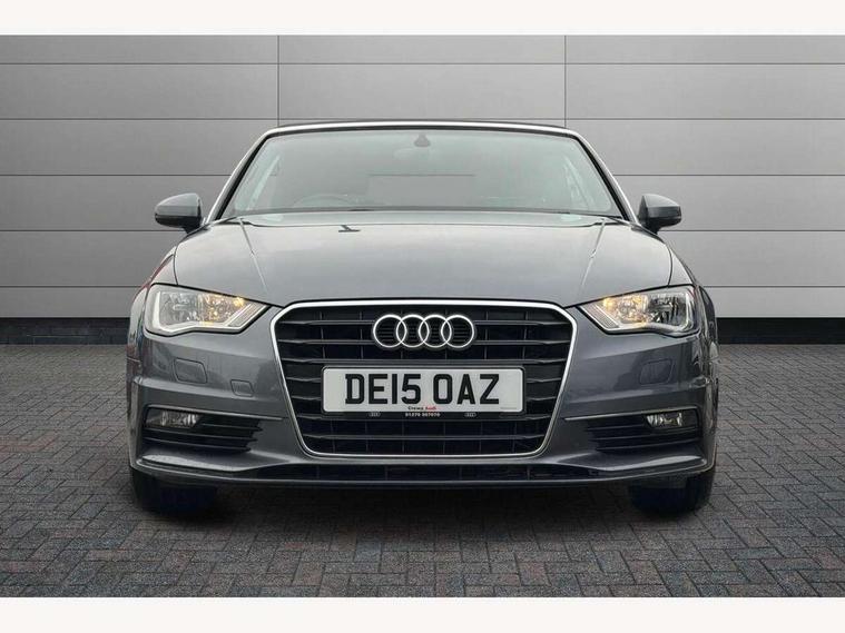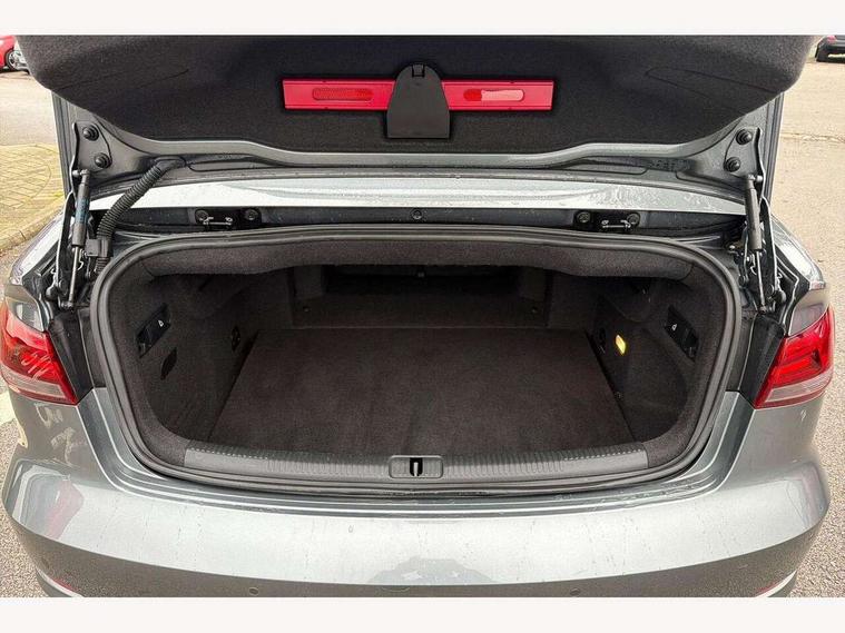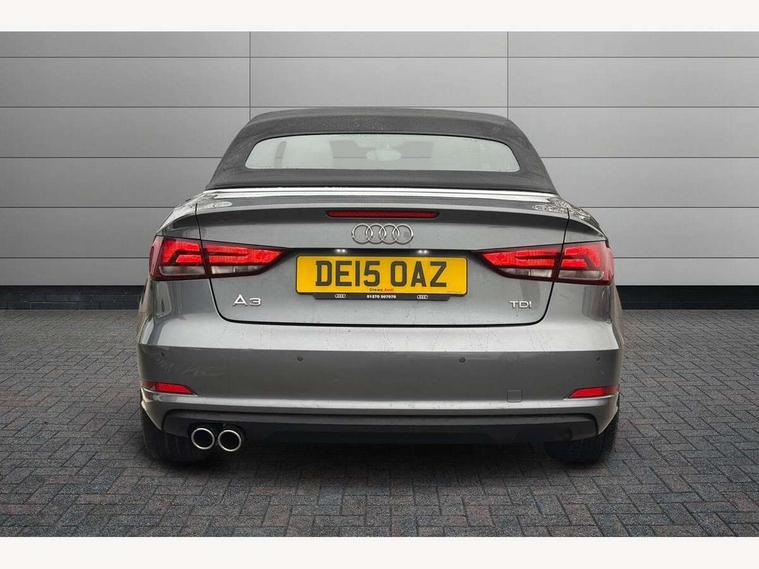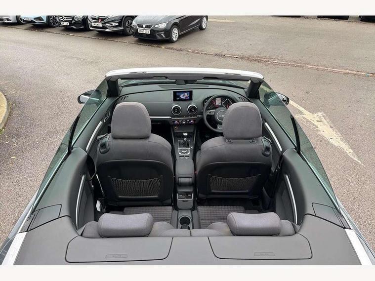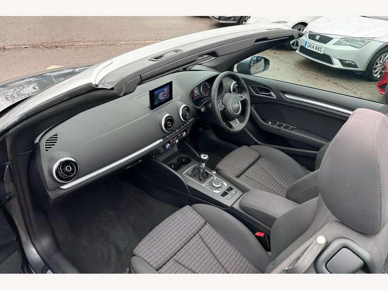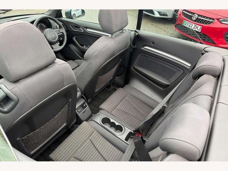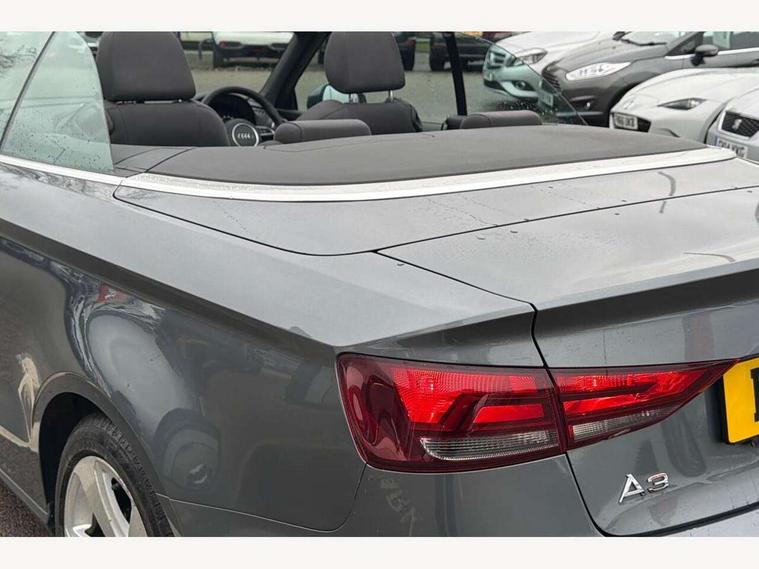 Colour driver's information system display, Fatigue detection system, Low washer fluid indicator, Service interval indicator, Voice control system, Diesel particulate filter, Audi music interface, DAB Digital radio, Speed dependent audio volume control, Adaptive brake lights, Aluminium side window trim, Body colour bumpers, Body colour door mirrors with integral indicators, Chrome exhaust tailpipes, Chrome fog light surround, Daytime running lights, Electric front+rear windows, Front fog lights, Fully automatic acoustic hood, Heated rear window, Heated windscreen washer jets, Twin exhaust tailpipe, 2 height adjustable rear headrests, 3 spoke leather multifunction sports steering wheel, 4 lashing points to secure luggage, 50/50 split folding rear seat, Adjustable front armrest, Aluminium door sill trims, Driver/passenger sunvisors, Drivers underseat storage, Dual zone electronic climate control, Front and rear interior lights with delay, Front sports seats, Front/rear floor mats, Height adjustable front seats, Height/reach adjustable steering column, Illuminated glovebox, ISOFIX child seat preparation+airbag deactivation, Storage compartment in centre console, Storage compartments in doors, Light and rain sensor pack - A3 Cabriolet, 3 point seatbelts on all seats, ABS/EBD, Active bonnet, Active front headrests, ASR, Automatic roll over protection, Collision mitigation braking system, Driver and passenger side airbags, Driver/Front Passenger airbags, Drivers knee airbag, EDL, Electromechanical parking brake, ESC - Electronic Stability Control + traction control, Front passenger airbag deactivation, Seatbelt warning, Tyre pressure monitor, Warning triangle and first aid kit, Anti-theft wheel bolts, Folding key, Remote control central locking, Thatcham category 1 alarm + immobiliser, Aluminium air vent surrounds, Aluminium trim elements, Space saver spare wheel,