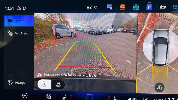 Activated carbon canister, Adaptive cruise control (ACC), Advanced driver attention and drowsiness monitor, Dynamic road sign display, Dynamic steering, E-Sim card for online connectivity, eCall emergency call system, Multi-color Digital cockpit pro, selection of different info profile possible, Multifunction front facing camera for distance control, Navigation system, Oncoming vehicle braking when turning including swerve support, Speed limiter, Speedo, rev counter, electronic odometer, trip, service interval display, exterior temperature and fuel gauge, Traffic jam assist, Voice enhancer and voice control, Warning signal and warning light for front and rear seatbelts not fastened, We connect plus preparation, We connect preparation, Wireless app connect, Hybrid propulsion system, Petrol Particulate Filter, Start-stop system with battery regeneration (recuperation - energy recovery during braking), XDS electronic differential lock for improved traction and handling, 2 USB C ports in front, 2 USB charging sockets on the centre console in the rear charging capacity upto 45W, Digital radio reception (DAB), Diversity antenna for FM reception, Gaming platform via car app, Infotainment system with 12.9" display, Mobile phone interface with inductive charging feature, 3rd brake light, Automatic headlamp activation with Coming home and Leaving home feature, Body colored bumpers in R-Line style, Body colour door handles, Exterior mirrors convex on the left and aspherical on the right, Front and rear electric windows, Heat insulating windshield made of laminated glass, LED separate daytime running light, Rear exhaust tailpipe, Rear fog light on one side and reversing lights on both sides, Rear side wing doors, Rear windscreen washer and wiper with interval delay, Remote electrically foldable door mirrors, puddle lights and reverse activated passenger's door mirror, Welcome light with surround lighting, 12V socket in front centre console, 12V socket in luggage compartment, 3 rear head restraints, 3 seat bench in 2nd row, Ambient lighting with 30 colour including LED light unit in front footwell with selectable light colour, Black roof lining, Brushed stainless steel pedals, Chrome plated radiator grille inserts, air vent surrounds and light switch surrounds, Door insert, side trim panel and arm support in leatherette, Front + rear black carpet mats, Front centre armrest, Front seat lumbar support adjuster, Integrated front head restraints, ISOFIX anchors for child seats on outer rear bench seats and on front passanger seat compatible for i-Size, Luggage compartment lighting, Manual height adjustable front passenger seat, Manually height adjustable driver seat, Plastic gear knob, Premium sports seats in front, Rear cupholder and loadthough, Sardegna cloth upholstery with front and outer rear seats Art Velour inner sides of bolsters, Single front passenger seat, Split folding backrest with centre armrest and unsplit rear seat bench, Sun visors with illuminated vanity mirrors, Titanium black instrument panel, 3 point height adj front seatbelts + pretensioners, 3 rear three point seatbelts, ABS, Autonomous emergency braking front assist with pedestrian and cyclist monitoring, Child locks on rear doors, Driver and front passenger airbag with front passenger airbag deactivation, Electronic parking brake with auto hold, ESC (Electronic Stability Control), Extended pedestrian protection measures, Hill start assist, Rear disc brakes, Two tone horn, Tyre pressure loss indicator, Volkswagen roadside assistance, Anti theft wheel bolts, Preparation for alcohol interlock, Decorative inserts carbon grey for dashboard and front door trim panels, Tool kit for tyre mobility set, Tyre mobility kit Includes 12V compressor and tyre sealant,