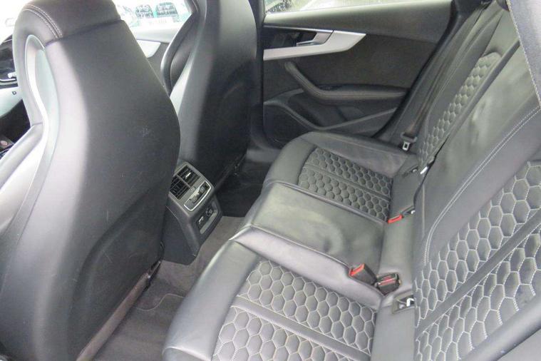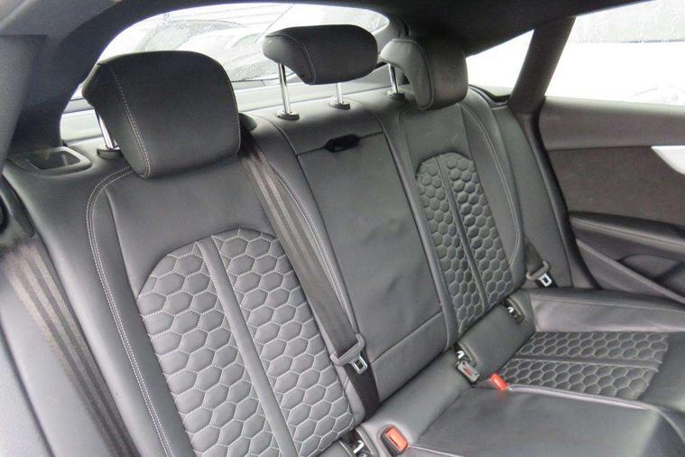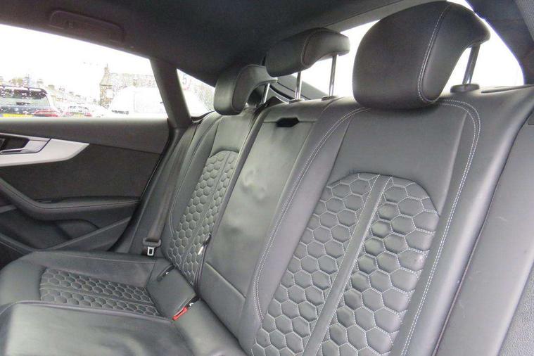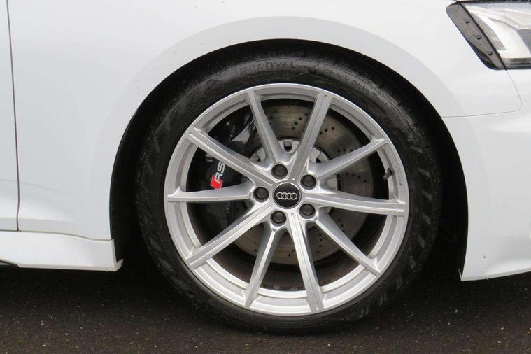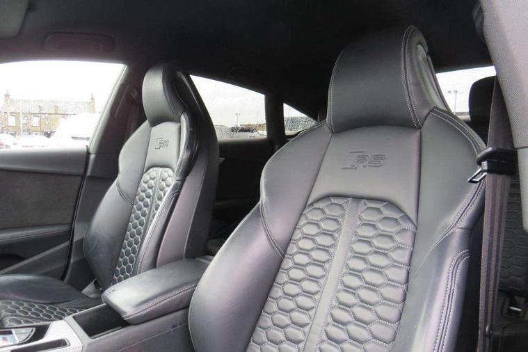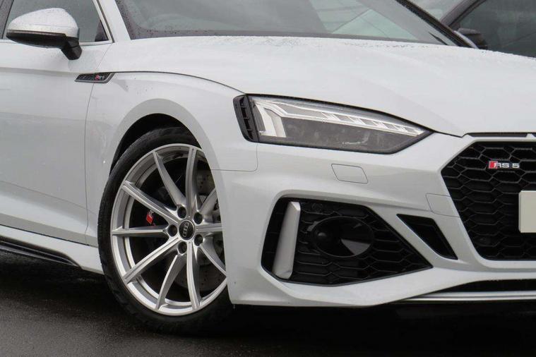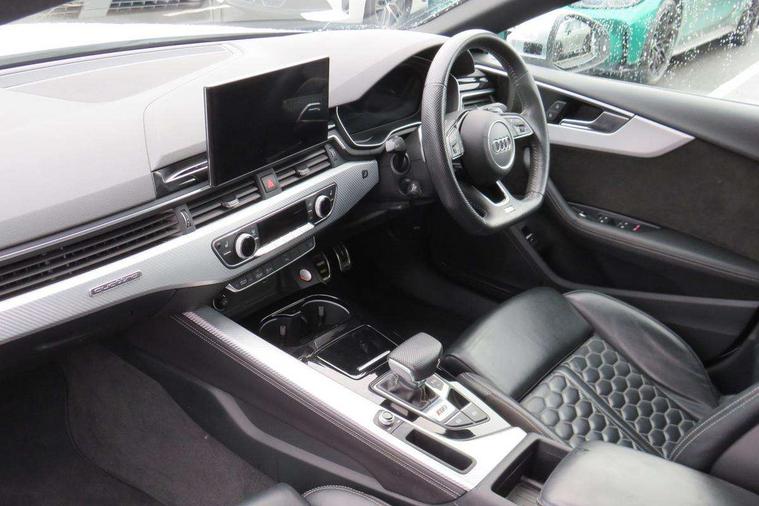 Audi connect safety and service (e-call), Audi connect with Amazon Alexa Integration, Audi parking system plus with front and rear sensors, Audi phone box with wireless charging, Audi side assist, Audi smartphone interface, Audi Virtual Cockpit with RS specific design and 12.3" display, Automatic start-stop system with coasting functionality and efficiency programme, Bluetooth interface, Electromechanical power steering, Email, calendar and text messages displayed via MMI, MMI Navigation plus with MMI touch includes 10.1" high resolution colour MMI display, 3D map, Rear view camera, RS Audi drive select, RS drive modes on steering wheel, Service interval indicator, Voice control system, Quattro sports differential, 2 x USB charging port with aux input socket, Audi sound system, DAB digital radio reception, Audi Beam uses LEDs to project the RS logo, Audi matrix LED headlights with LED rear lights + dynamic front and rear indicators, Auto dimming rear view mirror, Body colour door handles, Electric front windows, Electric rear windows, Electrically folding, adjustable and heated door mirrors with integrated LED side indicators and kerb view function for passenger side, High beam assistant, Larger singleframe grill, LED daytime running lights, Matt aluminium effect door mirror housings, Privacy glass with rear acoustic glazing, Rain and light sensors, RS bumper with quattro lettering, RS5 badges on grille, the front wing panels and rear, RS5 dual branch chrome tailpipes with left and right oval pipes, Windscreen with acoustic glazing, 3 spoke leather heated multi-function plus steering wheel with RS badging, 40/20/40 split folding 3 seater rear bench seat, Aluminium shift paddles, Black cloth headlining, Deluxe 3 zone electronic climate control, Electrically adjustable front seats, Fine Nappa leather upholstery, Front centre armrest, Front head restraints, Front/rear floor mats, Heated front seats, Illuminated door sill trims with RS5 logo, ISOFIX child seat mounting and top tether, Leather door armrests and knee pad, Pneumatic massage function, Rear head restraints, RS Specific perforated leather gear lever knob with contrast stitching, RS Super Sports seats with contrast honeycomb stitching, Stainless steel pedals, LED Interior light pack - RS5, RS bodystyling pack - RS5, 3x3 point rear seatbelts, 6 airbags - Driver, front passenger, curtain and side airbags, Child locks on rear doors, Electromechanical parking brake, Electronic Stabilisation Control (ESC) including ABS, ASR and EDL, Front passenger airbag deactivation, Height adjustable front seatbelts, Hill hold assist, Multi collision brake assist, Pop-up bonnet for pedestrian protection, Pre sense city, RS Model enhanced braking system, Seatbelt monitoring, Tyre pressure warning, Warning triangle and first aid kit, Anti theft alarm system, Anti theft wheel bolts, Immobiliser, Keyless Go, Remote control key with RS emblem, Aluminium race inlays, Tool kit, Tyre repair kit,