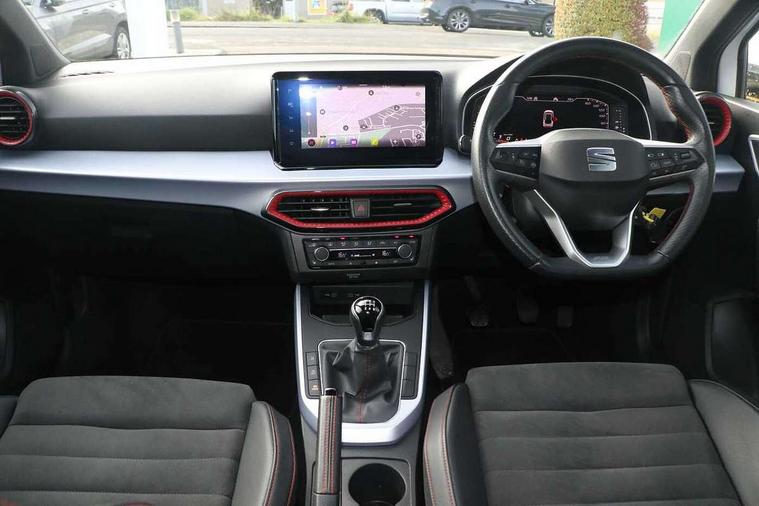 Digital cockpit, Electric speed sensitive power steering, Full Link Smartphone Integration with Mirror Link, Apple Car Play, Google Android Auto with USB Type C cable for Apple and Android compatibility, Lane keeping system, Rear parking sensor, Seat connect with safety, service, remote and online, SEAT Drive profile - Four different models normal-sport-eco-individual, steering response, throttle response, Bluetooth interface for hands free and audio streaming, DAB digital radio and AM/FM radio, Steering wheel mounted audio controls, Anti theft roof antenna, Auto dimming interior rear view mirror, Automatic activation of hazard warning lights, Body coloured bumpers, Body coloured door handle inserts, Chrome roof rails and window surrounds, Chrome window trim, Dark tinted rear windows, Electric front/rear windows, Electrically adjustable, heated and folding door mirrors, FULL LED automatic headlights with dynamic headlight range control, coming and leaving home, LED daytime running lights, LED rear tail lights and licence plate lights, Protective side mouldings, Rain sensing wipers, Rear spoiler, Rear window wash/wipe, Roof colour door mirrors, Twin exhaust pipe styling hidden exhaust pipe, Visible VIN plate, Windshield wiper with intermittent control and potentiometer, 2 cupholders, 60/40 split folding rear seat, Aircare filter, Black interior roof, Daring red Illuminated coloured air vent, Double boot floor, Driver sunvisor with covered mirror + card holder, Dual zone climate control, Front courtesy light with 2x front and 2x rear reading lights, Front seat back storage pockets, Front sport seats, Heated front seats, Height adjustable front seats, Height/reach adjustable steering column, Illuminated boot, Interior ambient lighting, Interior light in footwell, central console and door panel, ISOFIX points in outer rear seats with top tether anchorage points, Microsuede cloth upholstery, Passenger sunvisor with vanity mirror, Perforated flat bottomed leather steering wheel/gear knob/handbrake with red stitching and FR logo, Two front and three rear height adjustable headrests, Connectivity pack plus - Arona, Interior chrome pack - Arona, 3 point seatbelts on all rear seats, ABS, Active front headrests, Child locks on rear doors, Driver and front passenger airbags with front passenger airbag de activation, front side and curtain airbags, Electronic stability control, Emergency Brake Assist (EBA) and front assist, Front and rear seatbelt reminder, Hill hold control, Multi-Collision braking, Tiredness recognition system, Traction control, Tyre pressure monitoring system, Alarm with back-up horn, Electronic engine immobiliser, Locking wheel bolts, Remote central locking + deadlocks, Tow away protection, Titan black dashboard, 18" Performance Cosmo grey matt alloy wheels,