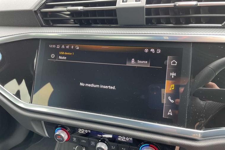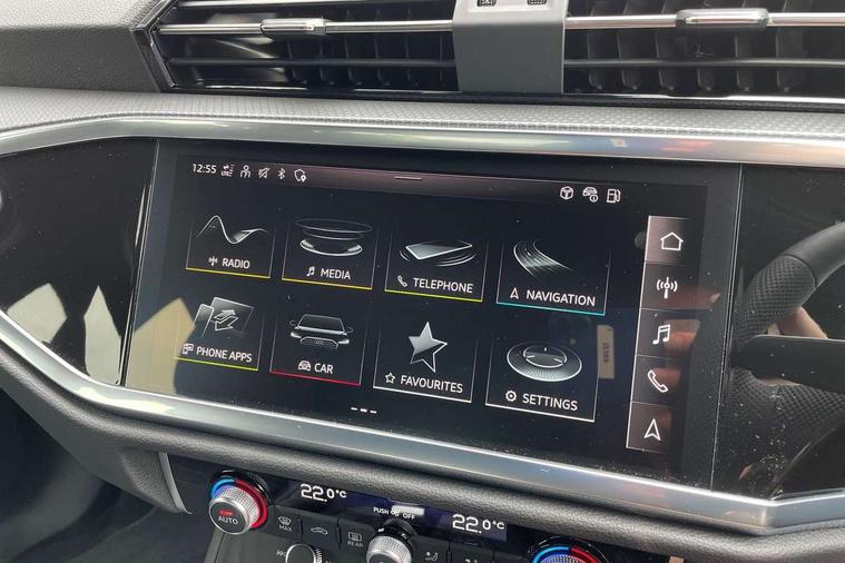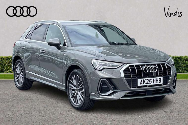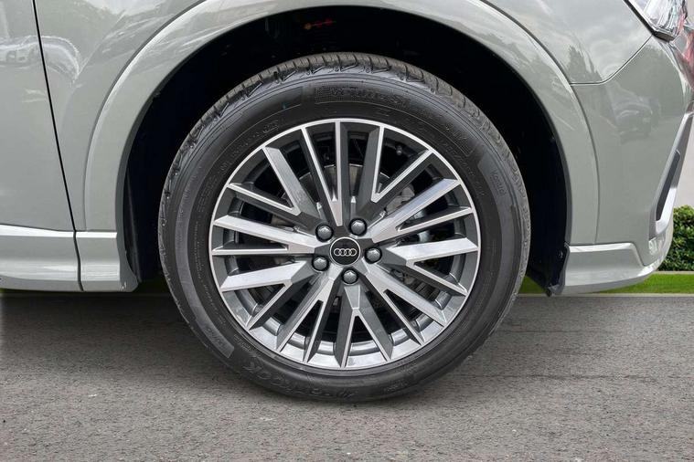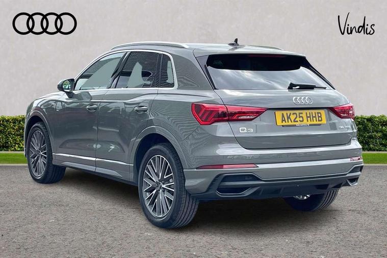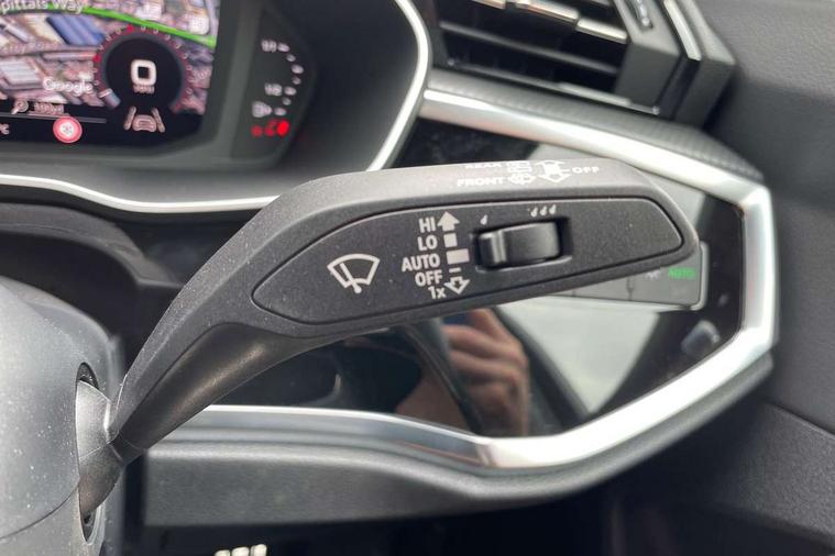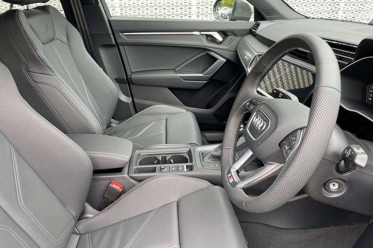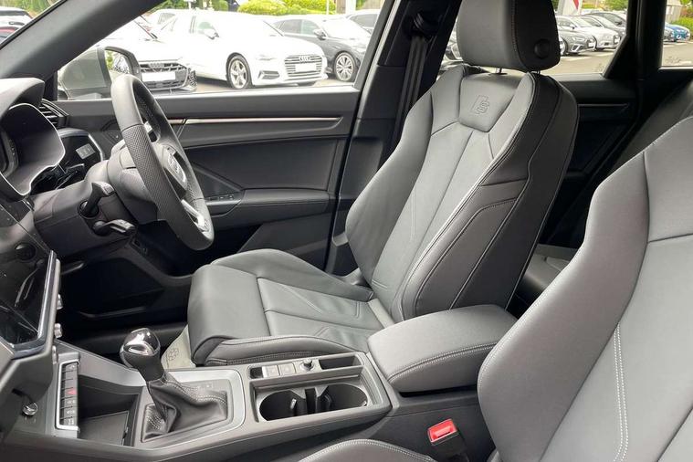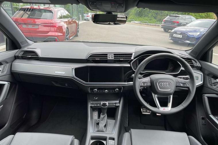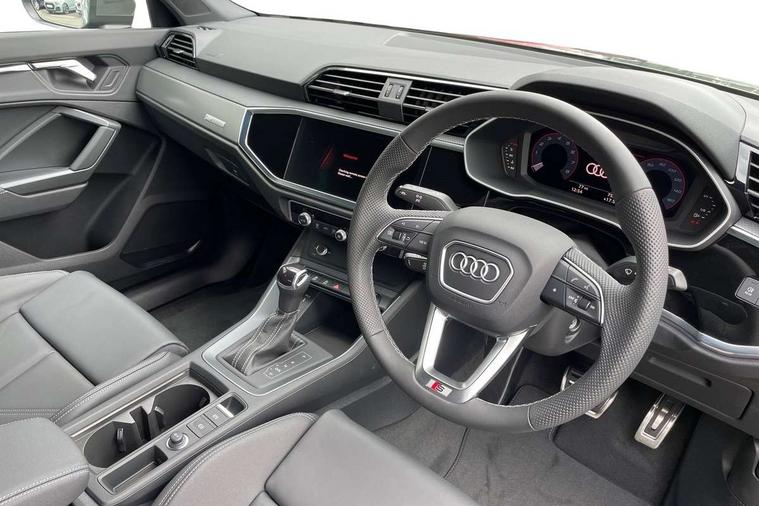 Amazon alexa Integration, Audi connect safety and service, Audi drive select, Audi lane departure warning, Audi Virtual Cockpit - 10.25" display, Bluetooth interface, Camera based traffic sign recognition, Distraction and Fatigue warning, Legal emergency call, MMI Navigation Plus with high resolution 10.1 inch touchscreen colour display, Power operated tailgate, Progressive steering, Service interval indicator, Smartphone interface includes wireless Apple carplay/Android Auto, Start stop system with recuperation, Voice control system with natural language interaction, Sports suspension, 2 USB-C ports with charge and data functions, 6 passive loudspeakers, DAB digital radio module, Acoustic windscreen, Aluminium roof rails, Aluminium window trim, Anthracite black radiator grille, Auto dimming door mirrors, Auto dimming frameless rear view mirror, Body colour front spoiler blade, Electrically folding, adjustable and heated door mirrors with integrated LED side indicators and kerb view function for passenger side, Front and rear electric windows, Front fog lights, Front side air inlets in matt platinum grey, Grille vertical bars in aluminium silver/Matt, High gloss black finish B and C pillars, LED Dynamic rear indicators, LED headlights with LED daytime running lights, LED rear lights, LED third brake light, Privacy glass dark tinted rear and rear-side windows (from B-pillar backwards), Rain and light sensors, Rear diffuser grille in grained matt black, Rear diffuser strip in matt anthracite black, Rear side wing doors, Rear wiper, S line badges on front wings, S line front and rear bumpers and side skirts in contrasting Manhattan grey paint finish, Side skirt insert in matt Platinium grey, Variable front intermittent wipers, 12V socket in rear centre console, 3 seat bench in 2nd row, 3 spoke leather multifunction steering wheel features S badging and grips in perforated leather with contrast stitching, 40:20:40 folding with manual adjustment for 60:40 forwards/backwards position and backrest angle, Adjustable rear seat bench/backrest with centre armrest and cupholder, Black cloth headlining, Dual zone electronic climate control, Electric lumbar support, Front and rear black floor mats with contrast stitching in rock grey, Front and rear headrests, Front centre armrest, Height and reach adjustable steering wheel, Illuminated door sill trims with S logo, ISOFIX child seat mounting for front passenger with airbag deactivation and outer rear seat including top tether attachment point for outer rear seats, Manual front seats with height adjustment, Perforated leather gearknob, Single front passenger seat, Stainless steel luggage compartment sill finisher, Stainless steel pedals, Twin leather upholstery with front sport seats + S embossing, Non smoking pack - Q3, 3x3 point rear seatbelts, 6 airbags - Driver, front passenger, curtain and side windows, Audi pre-sense front with pedestrain and cyclist recognition, Electrically operated child locks on rear doors, Electromechanical parking brake, Electronic stabilisation control including ABS, ASR and EDL, Front seatbelt reminder, Hill descent control, Hill hold assist, Pre sense basic, Seatbelt monitoring, Tyre pressure warning, Warning triangle and first aid kit, Anti theft wheel bolts, Immobiliser, Remote central locking, Thatcham approved category 1 anti theft alarm, Aluminium look interior elements, Dark matt brushed aluminium inlay, Detail dashboard around MMI touch colour display in glass look, black with surround in aluminium look, Leatherette door armrest,