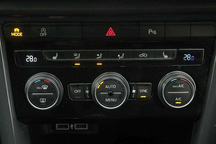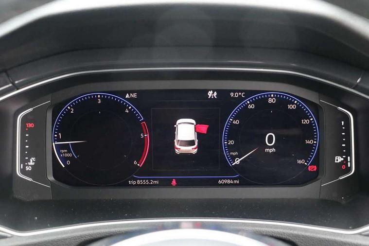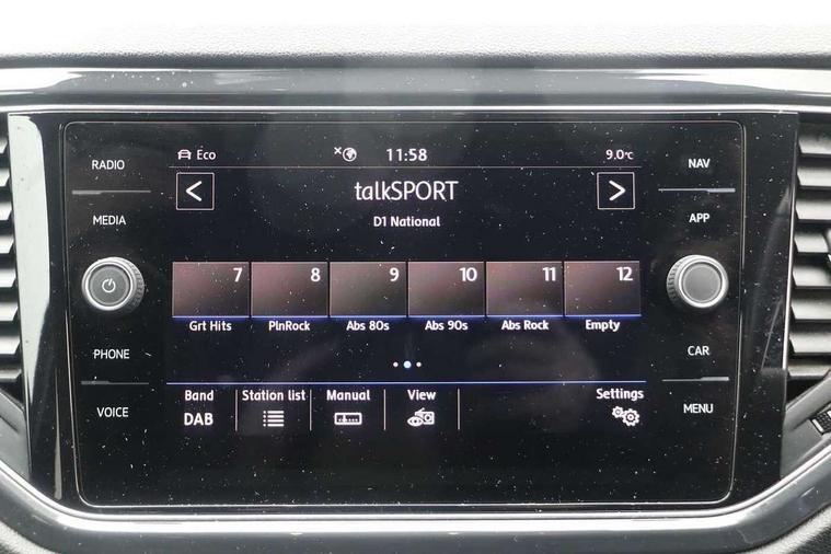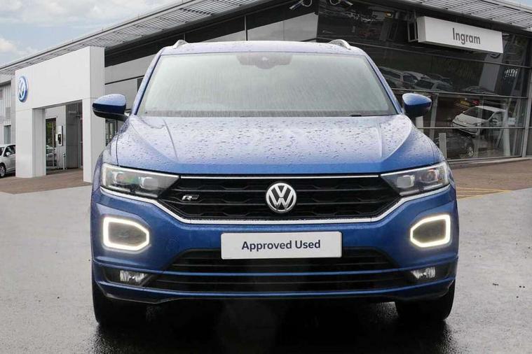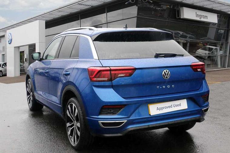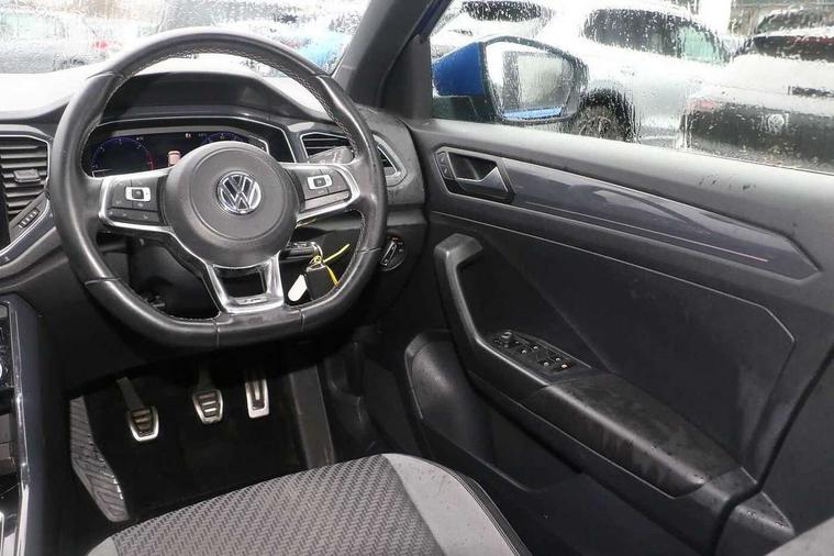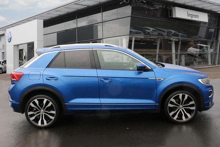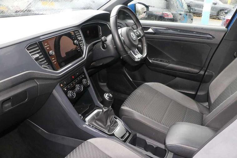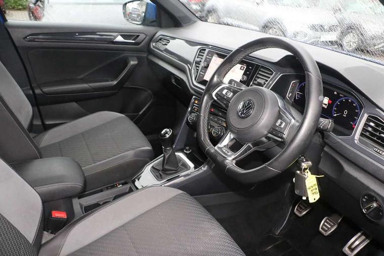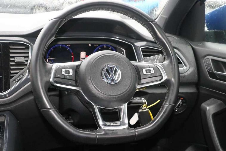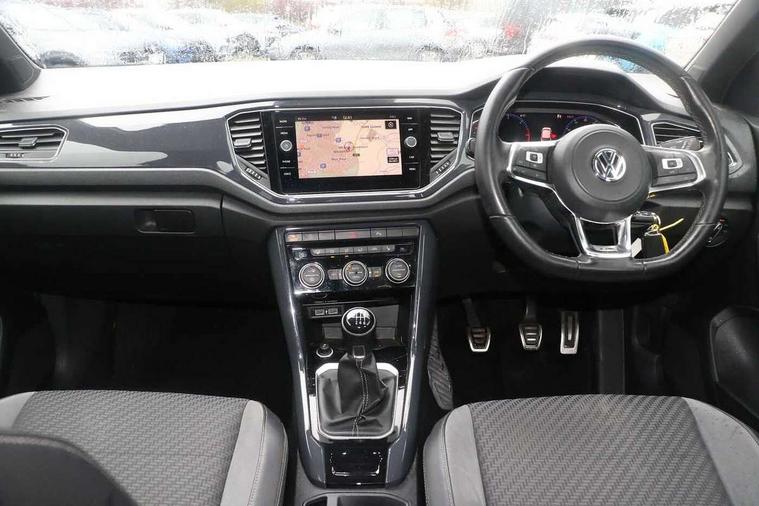 Caribou grey decorative inserts in dash and door panel, R line styling pack - T-Roc, Winter pack - T-Roc, 19" Suzuka alloy wheels with low rolling resistance tyres and anti wheel bolts, Steel space saver spare wheel, Alarm with remote central locking and interior protection, Electronic engine immobiliser, Remote central locking with 2 remote folding keys, Bluetooth - Simultaneous pairing of 2 compatible mobile devices, DAB Digital radio, Dynamic navigation based on TMC+, Multi device interface (MDI) with USB connection, Music playback - MP3, WMA and AAC files, Premium USB cable in choice of either Apple or Android smartphone compatibility, SD card slot, SMS functionality - read, compose and send SMS messages using touch-screen display, Three route options - Fast, Short, Eco, Title and cover art display, 3 rear three point seatbelts, ABS, Driver and front passenger safety-optimised head restraints, Electronic parking brake with auto hold, ESC with EDL, ASR, EDTC and trailer stabilisation function, Front and rear curtain airbags, driver and front passenger airbags with passenger deactivation switch and front side impact airbags, Rigid safety cell with front and rear crumple zones, Three point height adjust front seatbelts + pretensioners, Tyre pressure loss indicator, Ventilated front and rear disc brakes, Volkswagen roadside assistance, Auto dimming interior rear view mirror, Automatic hazard lights activation under emergency braking, Black grained lower door protectors, Black grained wheel arches, Body colour door handles, Body colour rear roof spoiler, Chrome effect left and right trapezoid exhaust tailpipe fascia surround, Chrome trim on upper and lower radiator grille, Door mirror integrated indicators, Electrically foldable, adjustable and heated door mirrors with puddle lights and reverse activated kerb-view adjustment on passenger's door mirror, Front and rear electric windows, Front fog lights with static cornering function, Front windscreen wiper with intermittent wipe and 4 position delay, Fully galvanised body, Heated rear window, High level 3rd brake light, LED darkened rear light clusters, LED dipped and main beam headlights with automatic range adjustment including signature LED daytime running lights, LED rear number plate lights, Manual coming/automatic leaving home lighting function, Matt chrome finish roof rails, Rain sensor, Rear tinted glass from B-pillar backwards approx 65% tinted, Rear windscreen washer and wiper with interval delay, 12V socket in centre console storage area, 2 LED front and rear reading lights, 3 rear head restraints, 4 load lashing points in luggage compartment, Aluminium pedals, Ambient lighting in front footwell and light strips below trim in front doors, Black roof lining and sun visors, Carbon flag cloth upholstery, Climate control - 2 zone electronic air conditioning with automatic air recirculation and allergy filter, Drawer under drivers seat, Front + rear carpet mats, Front centre armrest with storage compartment, longitudinal and height adjustable and two rear air vents, Front cupholders x 2, Front footwell illumination, Front seat back storage pockets, Front sport seats, Glovebox, Height adjustable front seats, Height/reach adjust steering wheel, Illuminated vanity mirrors, Instrument lighting, white adjustable panel illumination, Interior light delay, Isofix easy fit child seat preparation for 2 outer rear seats, Load through provision with single cup holder when folded down, Luggage compartment cover, removable, Luggage compartment lighting, R Line badge, Split folding rear seat backrests with centre armrest, Storage compartment in left and right luggage area, Storage compartment in rear doors, Storage compartments in driver and front passenger doors, Three spoke multi-function leather trimmed steering wheel and gearknob, Unique R Line door sill protectors, App-Connect, 2 USB connection charging sockets, Active Info Display, 10.3" high resolution TFT dash display screen with customised information, Adaptive cruise control, Automatic start/stop system, Bluetooth telephone and audio connection for compatible devices, Car information display, Car-Net Security and Service, Discover navigation, 8" touch screen navigation/infotainment system with Car-Net, European map, CD/radio, 2D/3D map and speed limiter, Driver alert system with audible and visual fatigue detection system, Driver profile selection, Dusk sensor, Front assist, radar sensor controlled distance monitor, city emergency braking + predictive pedestrian protection, Lane assist, Multifunction computer with visual gear change recommendation for fuel consumption, Progressive power assisted steering, Service interval indicator, Think blue trainer driver tips and journey analysis, Voice activation, Warning sound and light for doors and tailgate open, Warning sound and light for front seatbelts unfastened, Battery regeneration during braking, Misfuel prevention device for diesel engine,