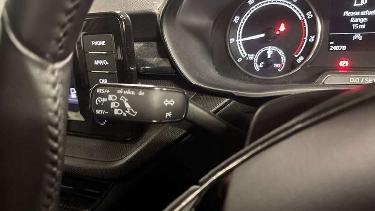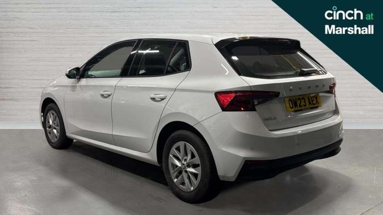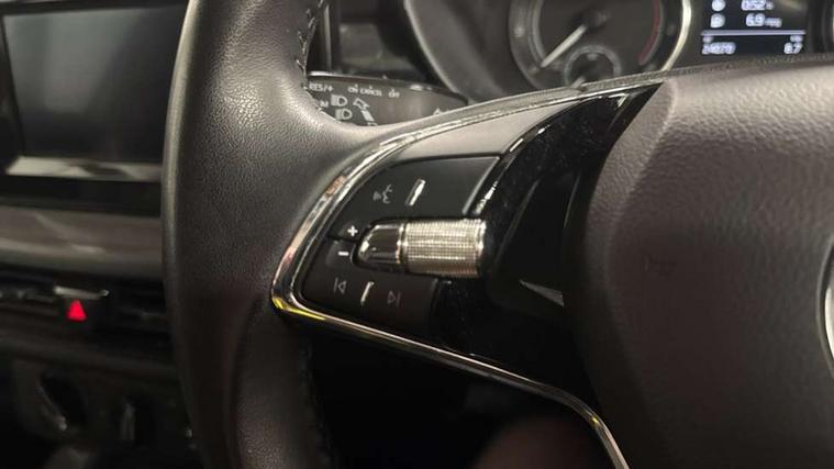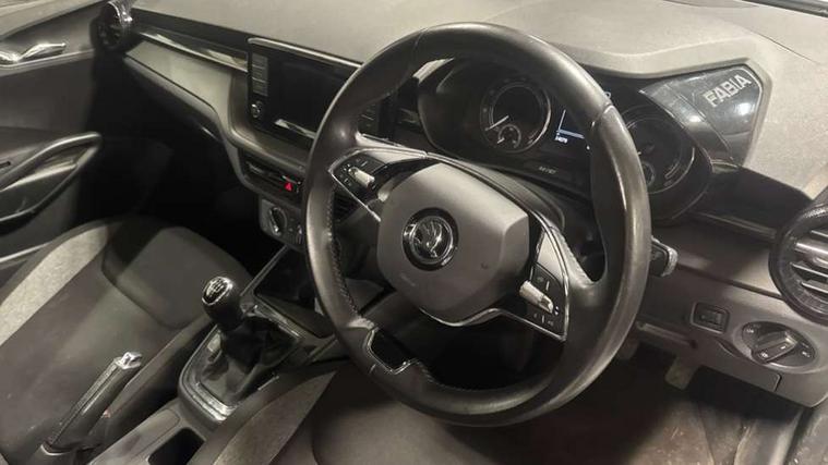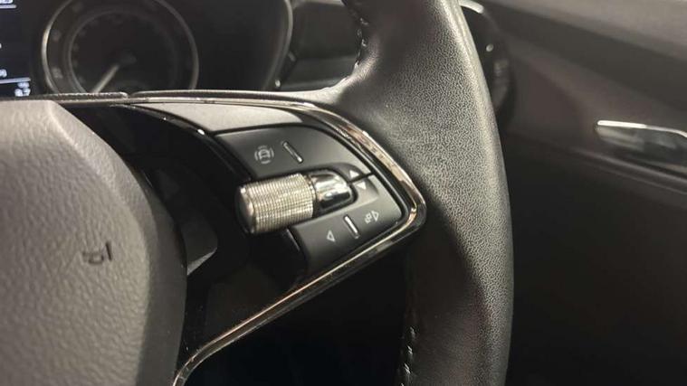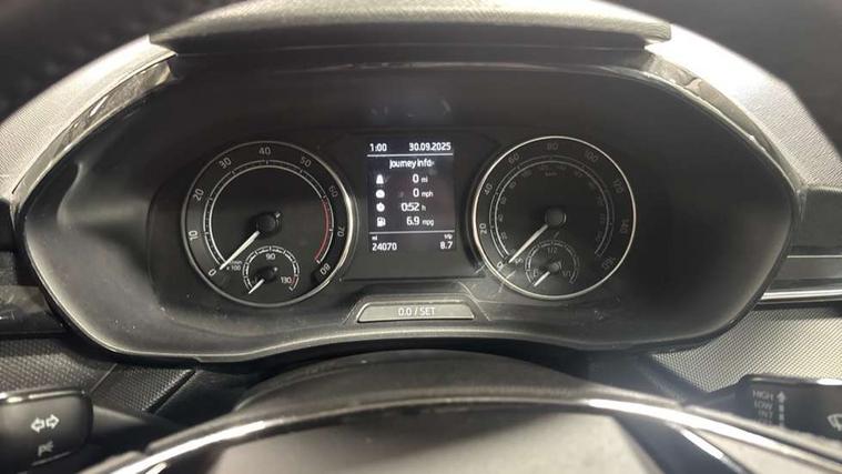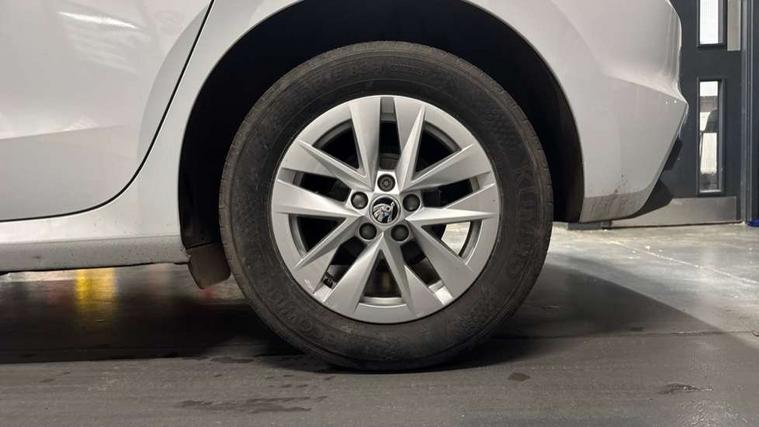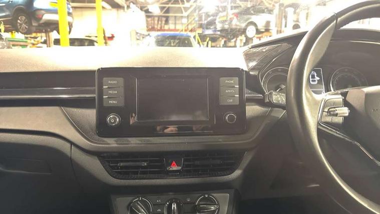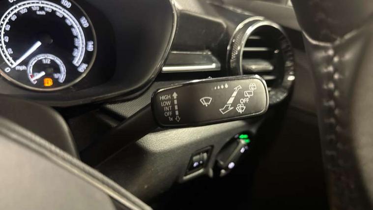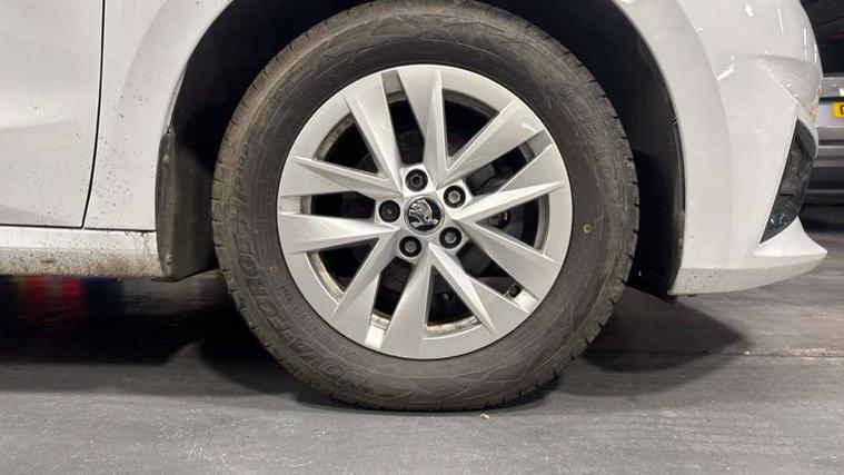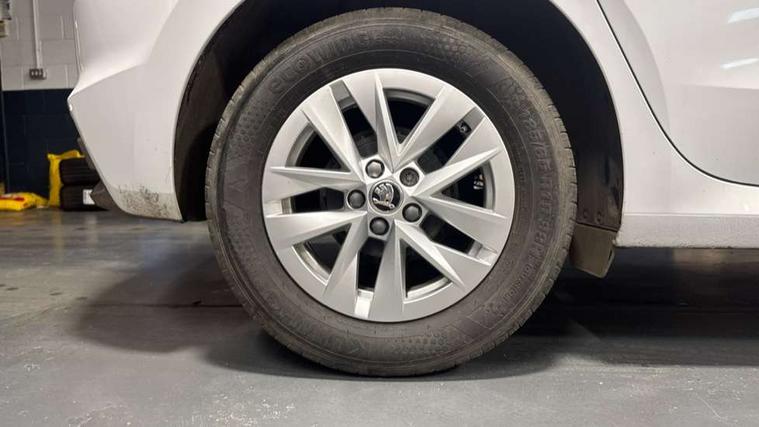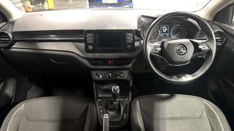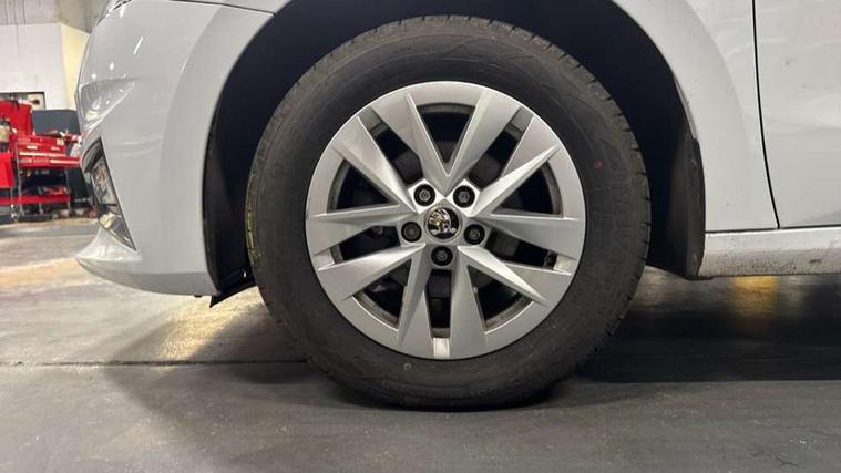 Bluetooth connection, Driver alert system - DAS, Electromechanical power steering, Exterior temperature gauge, Lane assist including road edge detection, Multifunction trip computer in black and white, Service interval indicator, Speed limiter, 2x USB-C in the front (for data transmission and charging), 4 speakers in front, Auxiliary socket for external MP3 player, DAB digital radio reception, Radio Swing with 6.5" colour display, Basic LED Headlights, Basic rear lights, Body colour door mirrors, Body coloured bumpers, Dimming rear view mirror with black frame, Door mirror integrated indicators, Electrically adjustable and heated door mirrors, Electrically adjustable front windows with function auto up/down, Front fog lights, Front window wiper intermittent control, Headlight range control - Automatic, Ice scraper in fuel cap, LED daytime running lights with coming and leaving home feature, Mechanical adjustable rear windows, Rain sensor, Rear LED fog light, Rear side wing doors, Rear window wiper with washing nozzles, Roof mounted spoiler, SKODA tailgate lettering in chrome, Third brake light, 2 reading lights in front and 2 reading lights in rear, 2 spoke leather multifunction steering wheel, 3 rear headrests, Backrest split and folding, Central console with fixed cup holder and storage box, Chrome handbrake release button, Fabric upholstery, Gearshift knob/handle in leather, Grain satin black interior door handles, Hand brake lever handle in leather, Height adjustable front headrests, Height adjustable front seats, Height adjustable steering wheel, ISOFIX and TopTether anchorage points to the outer rear seats, ISOFIX and TopTether on the front passenger seat, Luggage compartment lighting, Manual air conditioning, Manually adjustable lumbar support in front seats, Pollen filter, Rear seat bench unsplit, Single front passenger seat, Storm grey headlining, Sun visors with mirror and airbag label on passenger side, Ticket holder, 3-point height adjustable front seats belts with pretensioner and force limiter, Automatic warning lights in case of crash, Driver and passengers airbag with switch off function, e-Call+, ESC including ABS, MSR, ASR, EDS, HBA and XDS, Front and rear seat belt warning, FRONT ASSIST (AEB City and AEB Inter Urban), Front side airbags, Head airbags, One tone horn, Pedestrian protection, Three rear 3-points safety seat belts with pretensioner and force limiter including stop function for outer rear seat belts, Tyre pressure monitoring system, Anti-theft alarm system including immobiliser, interior monitoring, backup horn, and towing protection, Central locking with radio remote control, interior controls, SAFE function and 2 foldable keys, Black painted air vents, Glossy black decorative trim, Grain satin black central console cover, Grain satin black lower decorative trim, Satin black door and side trim panel in front, Anti-theft wheel bolts protection, Super-low rolling resistance tyres,