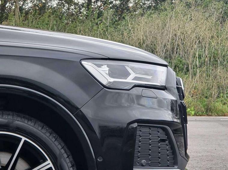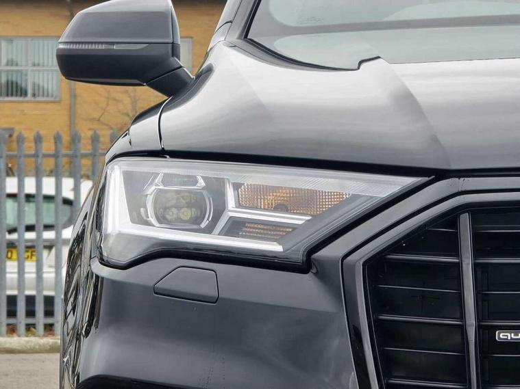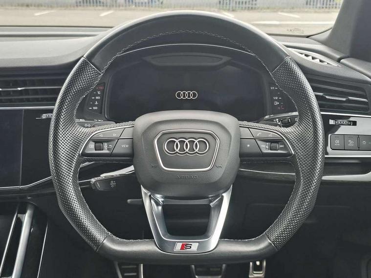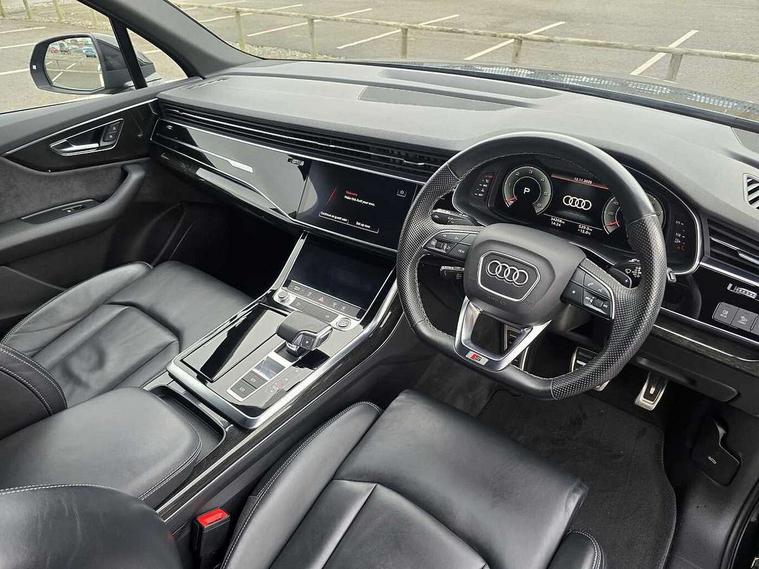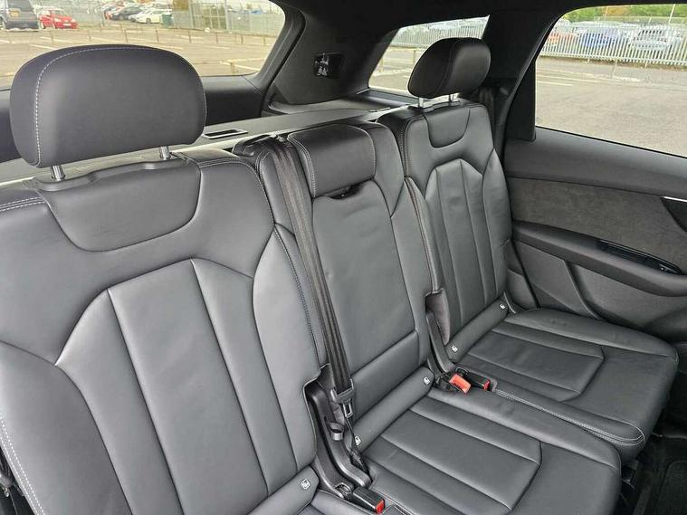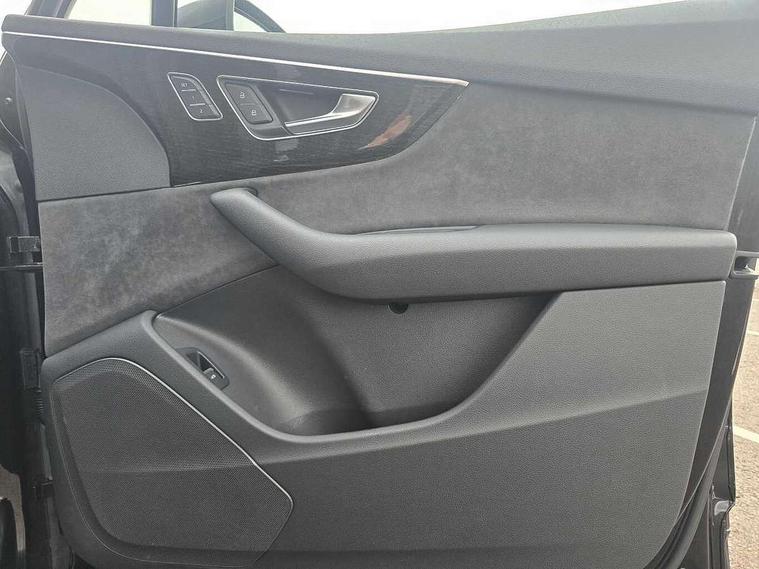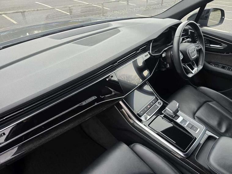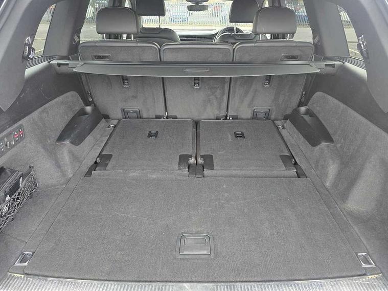 Audi connect safety and service (e-call), Audi connect with Amazon Alexa Integration, Audi drive select (Auto, Comfort, Dynamic, Efficiency, Individual, Off-road and All road), Bluetooth interface, Camera based traffic sign recognition, Electromechanical steering, MMI navigation plus with MMI touch screens includes 10.1" and 8.6" screens with haptic feedback, Natural voice recognition, Parking system plus with 360 degree display (front, rear and side sensors) - acoustic and visual park assist system, Power operated tailgate, Rear view camera, Smartphone interface includes wireless Apple carplay/Android Auto, Start/stop system, 48V Mild hybrid technology, Adaptive air sports suspension, Quattro all wheel drive with self locking centre differential, Audi music interface - front 2 USB-C ports with charger and data functions, Audi sound system with 6 channel amplifier, 180 watt amplifying capacity and 10 loudspeakers including subwoofer, DAB digital radio module, 3rd brake light, Audi matrix LED headlights with dynamic front and rear indicators, Auto dimming frameless rear view mirror, Black roof rails, Bumpers in contrast paint scandium grey finish includes door trim and wheel arch trim strips, inlays in door strip contain quattro embossing, Electrically adj heated/folding + automatically dimming exterior mirrors with memory + automatic kerb side function for passenger side exterior mirror, Heat insulating glass in windshield, Integrated LED indications in door mirrors, LED daytime running lights, LED rear tail lights, Privacy glass - dark tinted rear and rear side windows from B-pillar backwards, Rear side wing doors, Rear wiper, 2 seat bench in 3rd row, 3 seat bench in 2nd row, 4 zone deluxe automatic climate control, 7 seat layout with ISOFIX points for the front passenger seat and rear passenger seat, Black cloth headlining, Comfort front centre armrest, Electric adjustable front seat with 4 way lumbar support, driver memory functionality, Folding rear seats, Front head restraints, Front/rear floor mats, Heated front seats, Illuminated door sill trims with S logo, LED interior ambient lighting, Luggage compartment cover, Luggage compartment sill protection in stainless steel, Rear head restraints, Single front passenger seat, Stainless steel pedals, Sunvisors with illuminated vanity mirrors, Titanium black styling pack - Q7/SQ7, 3 point seatbelts on all rear seats, Audi pre sense front, Child locks on rear doors, Driver and front passenger, front side and curtain airbags, Electromechanical parking brake, Electronic Stabilisation Control (ESC) including ABS, ASR and EDL, Extended pedestrian protection measures, Hill hold assist, Seatbelt monitoring, Tyre pressure loss indicator, Warning triangle and first aid kit, Anti theft alarm, Anti-theft wheel bolts and wheel loosening detection, Keyless Go, Remote central locking, Polished oak trim with grey finish inlay, Tool kit, Tyre repair kit,