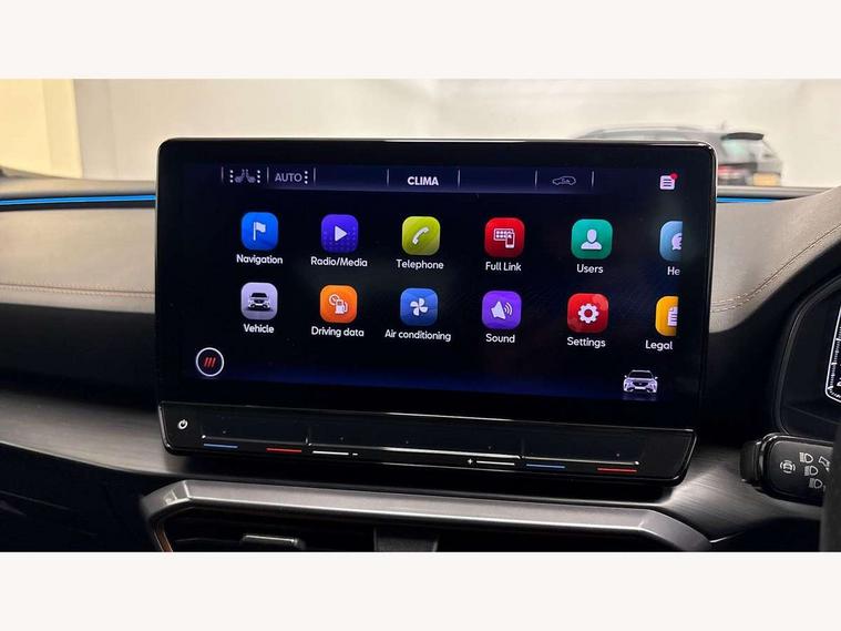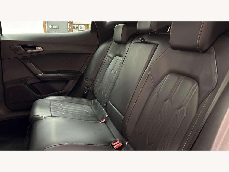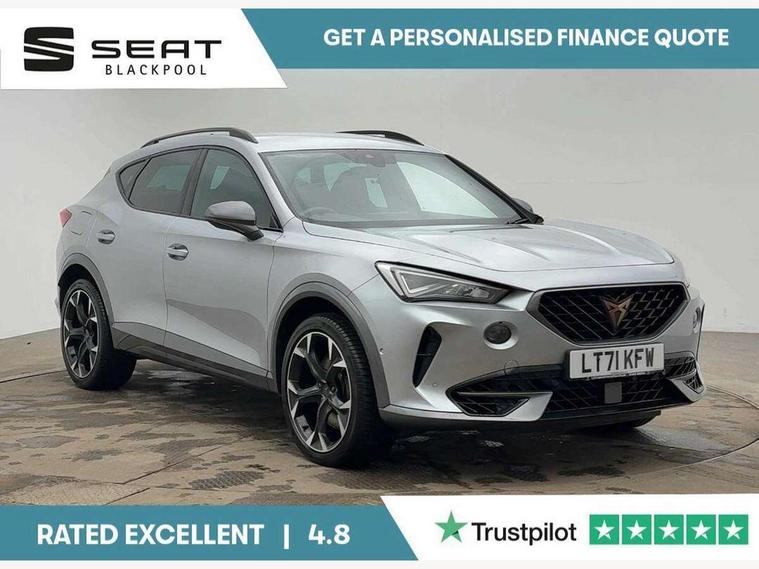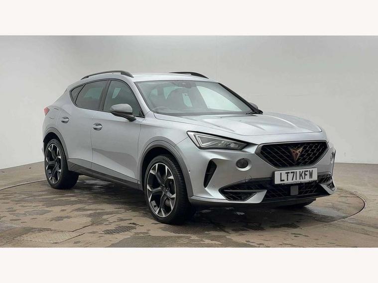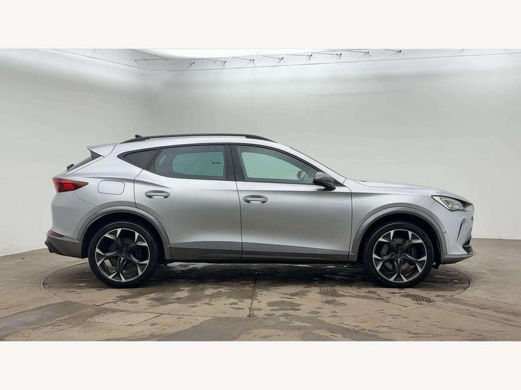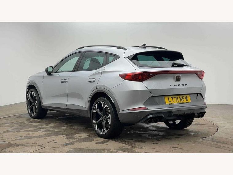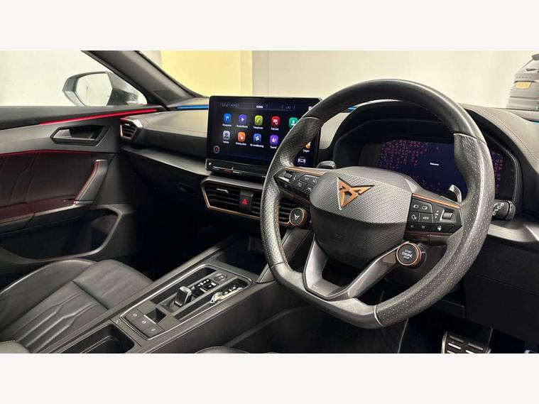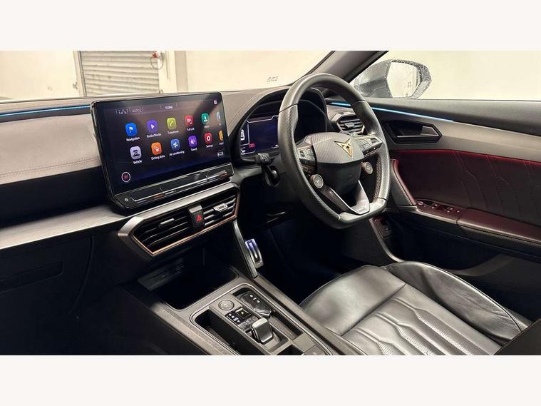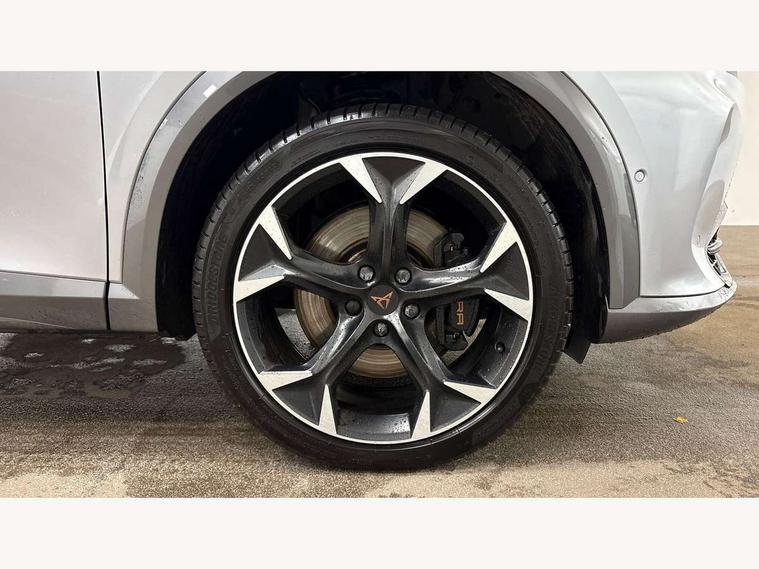 Digital cockpit and configurable dashboard, Driver alert system, Dynamic chassis control with driving profile selection (Comfort, Sport, CUPRA, Individual), Forward collision warning with automatic braking, Lane assist, Park assist (inc front/rear parking sensors), Predictive adaptive cruise control with speed limiter, RPM, trip computer, outside temp gauge, instrument light brightness, low fuel warning light, lights on reminder, gearshift indicator, Service interval indicator, Speed sensitive power steering, Start/stop system with regenerative braking, Virtual pedal and electric tailgate, Wireless apple carplay, Wireless phone charger, Electronic locking differential and dynamic traction support, Sports suspension with front shock absoption, 2 front and 2 rear USB type C sockets, Auxiliary input socket, DAB radio, Auto dimming rear view mirror, Body colour door handles, Body coloured bumpers, Dark grey wing mirror, Daytime running light with automatic headlight control and coming home feature, Dynamic headlight range control, Electric front/rear windows, Electrically adjustable heated and folding door mirrors with memory function, Front fog lamps with cornering function, Gloss black roof rails and window surrounds, LED Headlights, LED Taillights with dynamic indicator, Rain sensing wipers, Rear diffuser with twin exhaust pipe on each side, Rear wash/wipe, Sports bumpers, Tinted rear windows, Welcome lights, 12v power supply in centre console, 12V socket, 12v socket in loadspace, 2 front and 2 rear reading lights, 230V socket, 60/40 split rear bench seat with armrest and mechanical seat release, Black headlining, Cupra sports pedals, Dust/pollen filter, Front and rear head restraints, Front centre armrest, Height/reach adjust steering wheel, Illuminated interior front door sills, Illuminated sunvisor with mirror, Isofix, Leather heated multi-function sports steering wheel with start stop, CUPRA mode button and gear shift paddles, Luggage tie-down hooks, Three zone climate control with control panel in rear, Variable luggage/load compartment floor, Wraparound lighting, Genuine Nappa leather Pack - Cupra, Navigation system pack - Formentor, Safety and driving pack (XL) - Formentor, 3 point seatbelts on all rear seats, ABS, Brake control system - ESC and brake booster, Child proof door locks, Driver and front passenger airbags with front passenger airbag de-activation, Electronic parking brake, Front and rear disc brakes, Front side curtain airbags, Hill hold control, Seat belt reminder for front and rear seats, Tyre pressure monitoring system, Anti theft alarm system, Keyless entry and start system (KESSY), Locking wheel bolts, Copper and aluminium interior detailing, 19" 'Exclusive' machined sport matte black and silver alloy wheels, Space saver spare wheel,