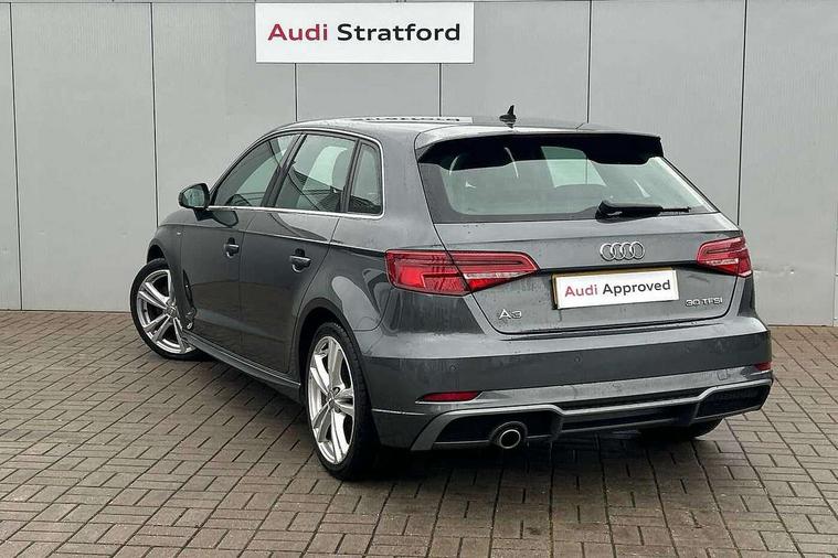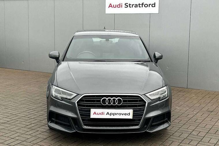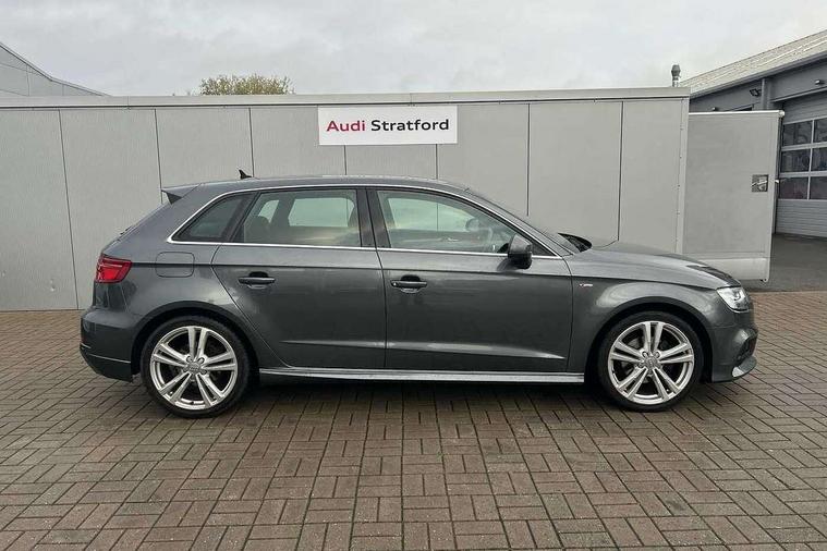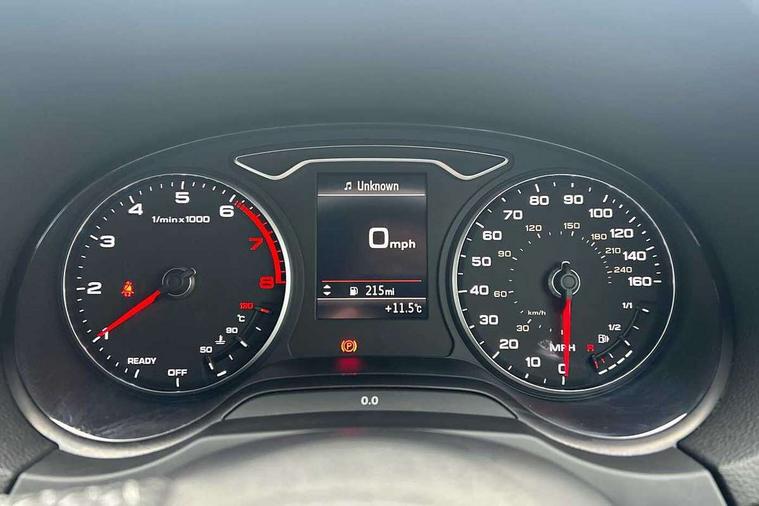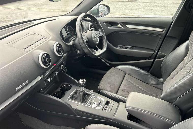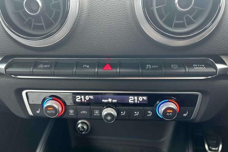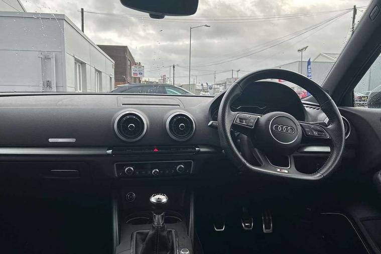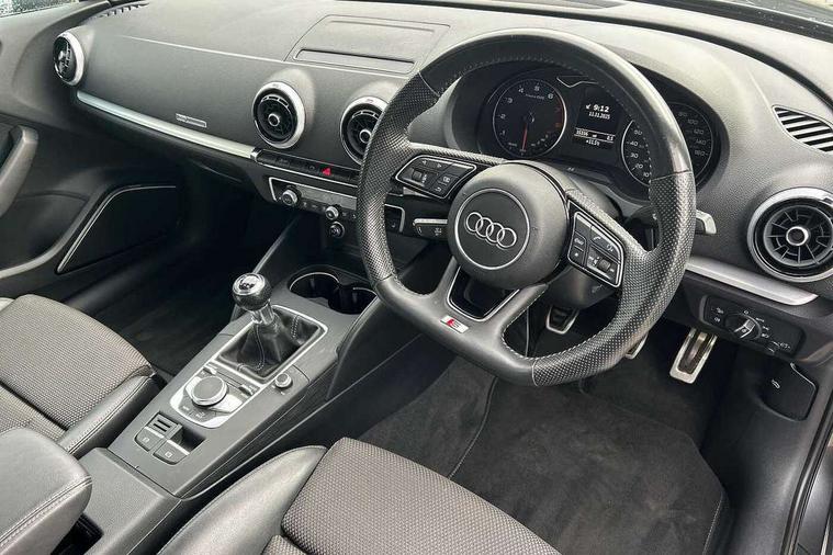 Audi connect, Audi drive select, Audi smartphone interface, Automatic start/stop system, Colour driver's information system display, Cruise control, Electro - mechanical power assisted steering, Mobile telephone preparation - bluetooth interface, SD card based MMI navigation, Service interval indicator, Speed limit display, Voice control system, Voice recognition for navigation system, Sports suspension, 2 USB interfaces and Aux-In jack, Audi music interface, CD player, DAB Digital radio, MMI radio plus with 7" colour MMI screen and MMI controller, Online entertainment, Aluminium window trim, Auto dimming rear view mirror with light and rain sensors, Body colour door mirrors, Chrome exhaust tailpipes, Electric front windows, Electric rear windows, Electrically adjustable and heated door mirrors with integrated LED side indicators, Heated windscreen washer jets, LED daytime running lights, Matt black radiator grille, Rear wiper, S line badges on front wings, S Line body styling with front & rear bumpers and side skirts, radiator grille and rear diffuser insert, roof spoiler, Sport specific side air inlet grille and diffuser insert, 3 adjustable rear headrests, 3 spoke flat bottomed multi-function leather sport steering wheel, 4 lashing points to secure luggage, 60/40 split folding rear seat, Adjustable front centre armrest, Black cloth headlining, Dual zone electronic climate control, Front and rear interior lights with delay, Front/rear floor mats, Glovebox light, Height and reach adjustable steering wheel, Illuminated door sill trims with S logo, Isofix child seat preparation for front passenger/outer rear seats inc passenger airbag deactivation, Manual height adjustable front seats, Stainless steel pedals, Storage compartments in doors side trims, centre console and under front drivers seat, LED interior light pack - A3/RS3, Non smoking pack - A3, Storage and luggage pack - A3/RS3, 3 point seatbelts on all seats, ABS/EBD, Active bonnet, Active front headrests, Airbags - front driver/passenger, front & rear side, curtain, drivers knee, ASR, EDL, Electromechanical parking brake, ESC - Electronic Stability Control + traction control, Front passenger airbag deactivation, Hill hold assist, Manual rear child locks, Multi-Collision braking, Seatbelt warning, Tyre pressure warning, Warning triangle and first aid kit, Anti theft alarm, Anti-theft wheel bolts, Remote control central locking, Thatcham category 1 alarm + immobiliser, Aluminium air vent surrounds, Aluminium trim elements, Matt brushed aluminium inlays, Tool kit, Tyre repair kit,