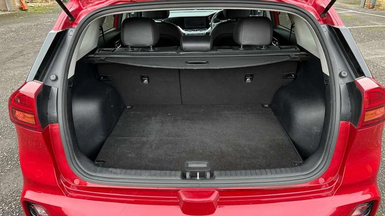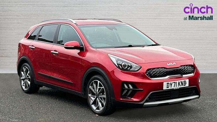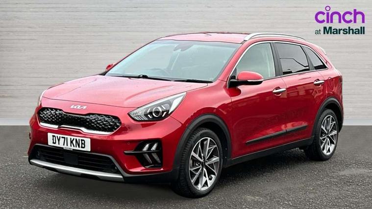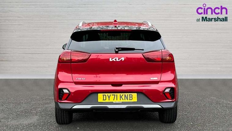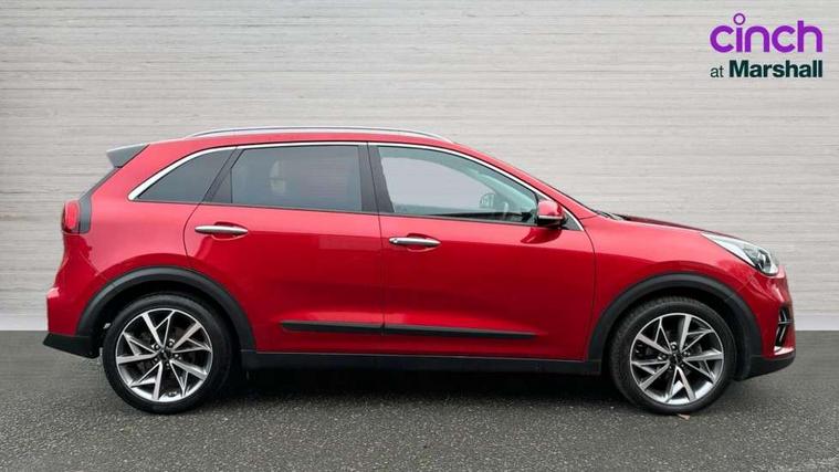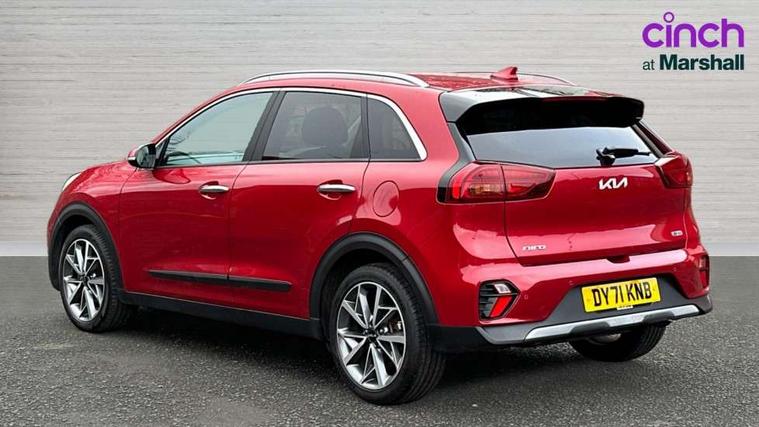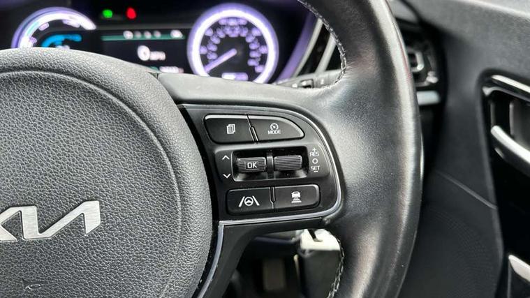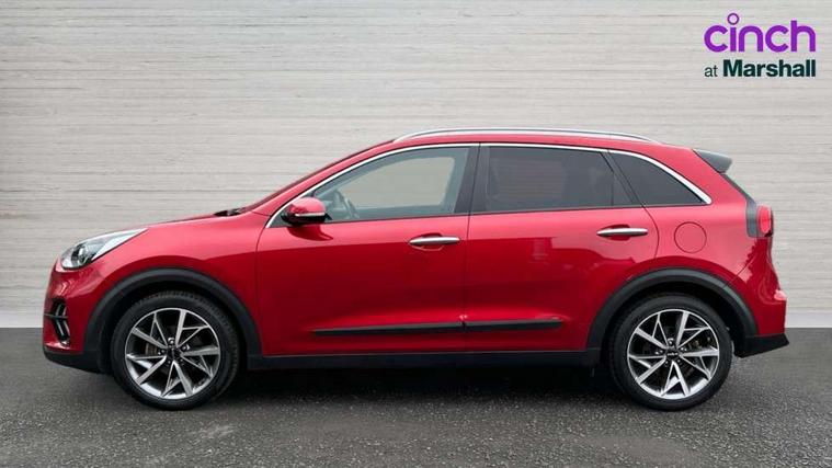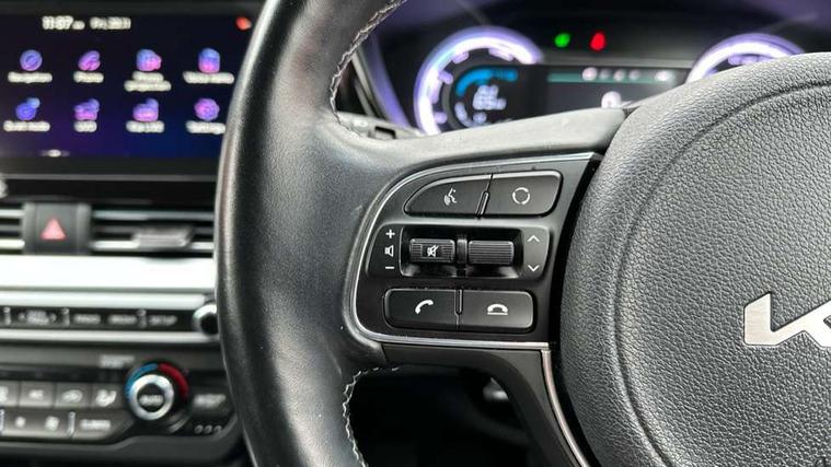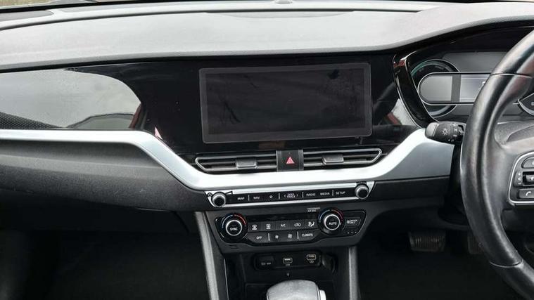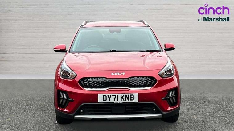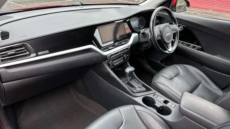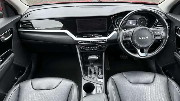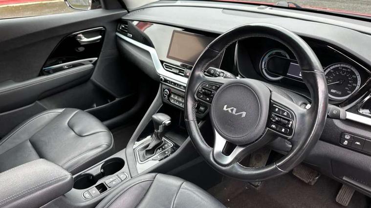 10.25" Touch screen satellite navigation with european mapping and traffic messaging channel, 7" full supervision cluster with TFT colour display, Adaptive smart cruise control function (SCC) with stop and go, Apple car play/Android Auto with voice control, Digital clock, Drive mode selector, Driver attention warning, Emergency stop signalling system, Forward collision avoidance assist, Front parking sensors, Kia connected services featuring TomTom live, Lane Following Assist (LFA), Lane keep assist, Motor driven power steering, Rear parking sensors, Reversing camera, Speed limiter, Trip computer with distance/fuel consumption/average speed, UVO connect, Wireless Smartphone charger, 'Shark fin' mobile antenna, 6 speakers, Bluetooth with music streaming, DAB Radio with MP3, Steering wheel mounted controls, USB connection located in centre console, USB port, All round electric windows with drivers and front passenger auto up/down function, Auto dimming rear view mirror, Automatic defog system, Automatic headlight control system, Black beltline mouldings, Black side sills, Black wheel arch mouldings, Body colour bumpers, Body coloured/high gloss door mirrors, Chrome door handles, Driver's side wide angle mirror, Electrically folding/adjustable/heated door mirrors with LED indicators, LED daytime running lights, LED fog lights, LED rear combination lights, Manual headlight levelling, Matt black radiator grille, Privacy glass - Rear windows and tailgate, Projector headlamps, Rain sensing front wipers, Rear spoiler, Rear wiper, Roof rails, Solar glass, Waistline black paint, Welcome and follow-me home light functionality, 3 x passenger assist grips, 60/40 split/folding 2nd row of seats, 8 way electric adjustable drivers seat, All-round height adjustable headrests, Aluminium door scuff plates, Bulb type overhead console lamp with sunglasses case, Centre console storage box, Centre room lamp, Cupholders in rear armrest, Driver/passenger sunvisors with illuminated vanity mirrors, Drivers seat power lumbar support, Dual zone automatic air conditioning, Front and rear door storage, Front/rear centre armrests, Headlining in Light grey, Heated front seats, Heated steering wheel, High gloss black lower console trim, High gloss black steering wheel trim, Illuminated ignition key hole, Interior door lock/unlock function, ISOFIX Child seat top tethers and anchor fixings, Leather trimmed door armrests, Leather trimmed gearshift, Leather trimmed steering wheel, Leather upholstery, Luggage area lamp, Luggage area load cover, Luggage net with hooks, Passenger seat height adjuster, Satin finish inner door handles, Seatback pocket - driver, Seatback pocket - front passenger, Steering wheel mounted paddle shift, Tilt/telescopic adjustable steering wheel, Under floor storage box, Ventiliation ducts to rear compartment, Towing pack - Niro, 3 point seatbelts on all seats, ABS, Automatic unlocking of doors in case of impact, Drivers knee airbag, Electric parking brake with auto hold function, Electronic stability control, Front passenger airbag cut-off switch, Height adjustable front seatbelts, Hill start assist control (HAC), Traction control, Twin curtain airbags with roll over sensor, Twin front and side airbags, Tyre pressure monitoring system, Alarm system and engine immobiliser, Deadlocks, Locking wheel nuts, Remote central door locking with fold away key, Speed sensitive auto door locking, Visible vehicle identification number, High gloss black centre fascia, High gloss black door inserts, 18" Alloy wheels, Tyre mobility kit,