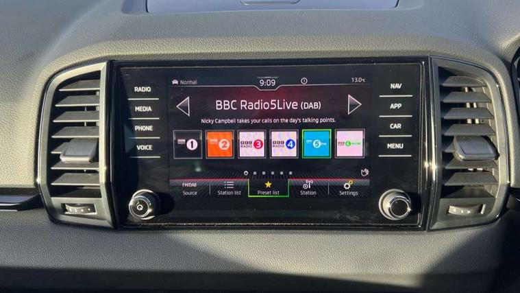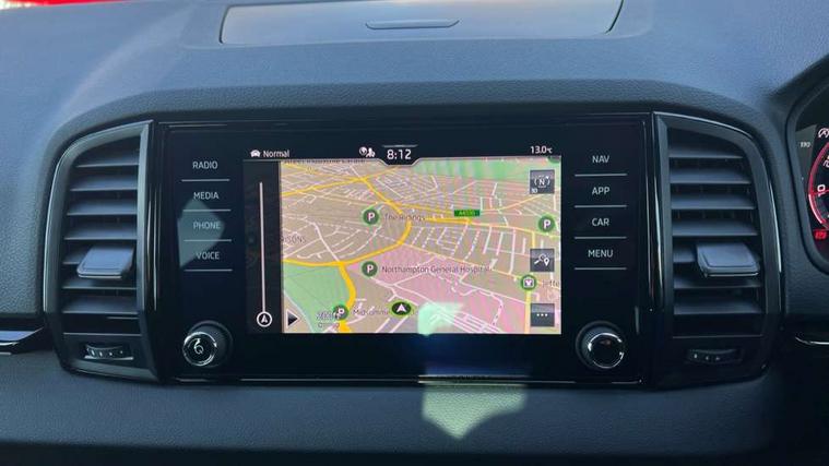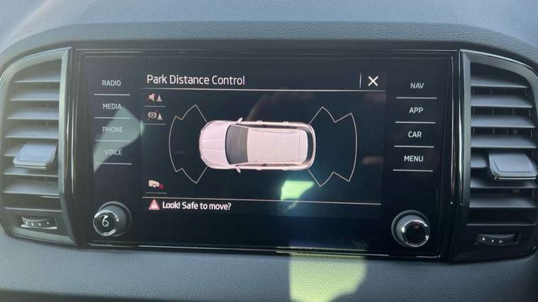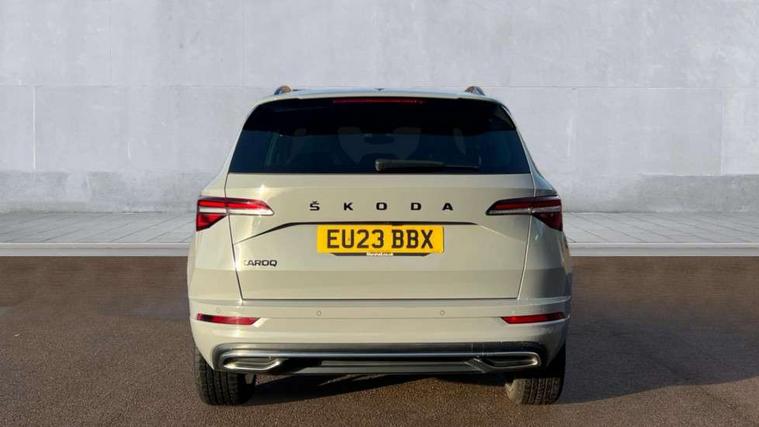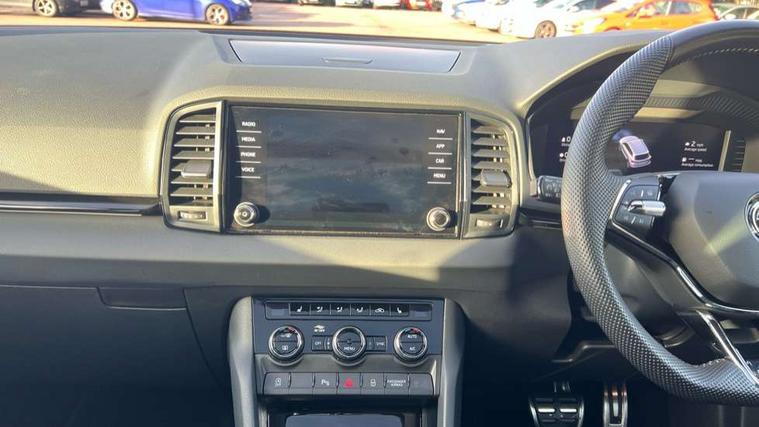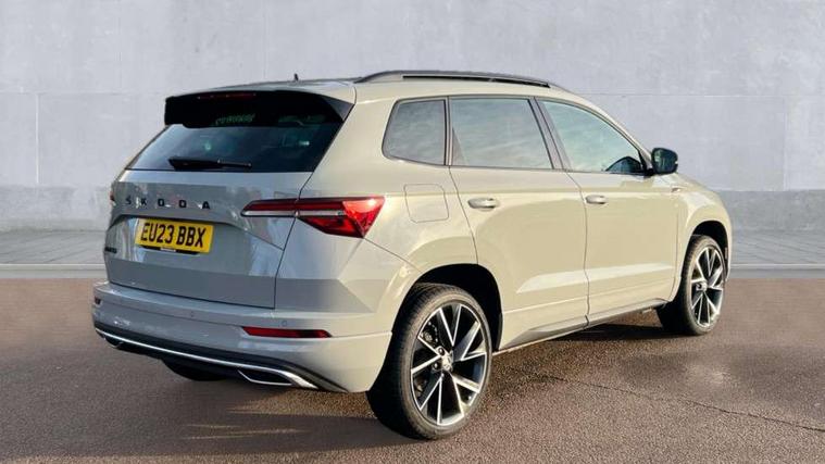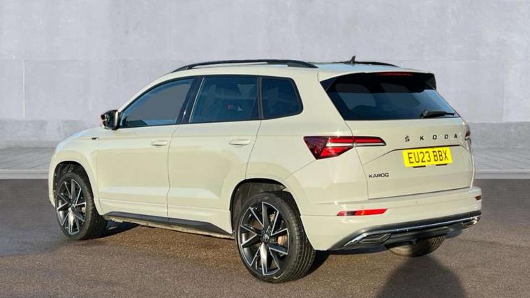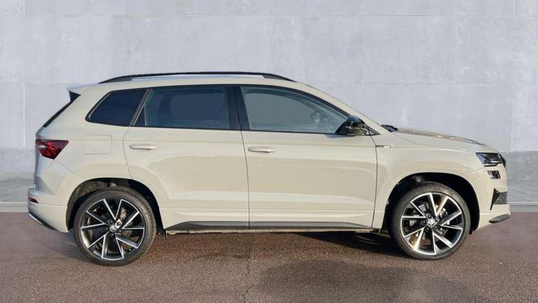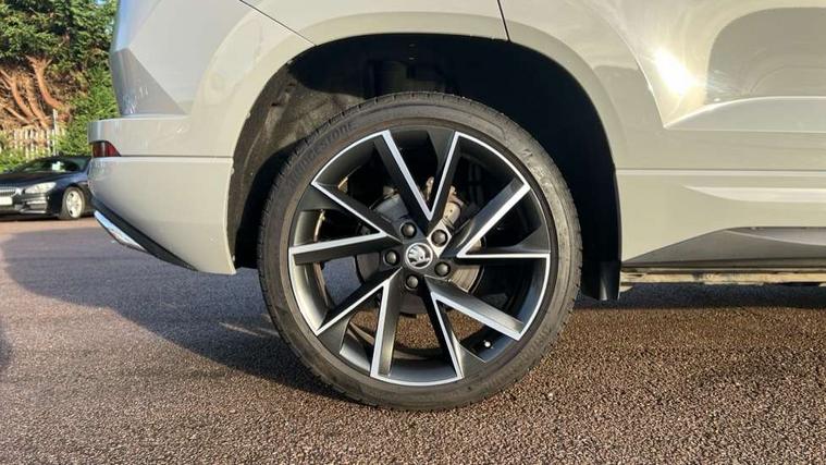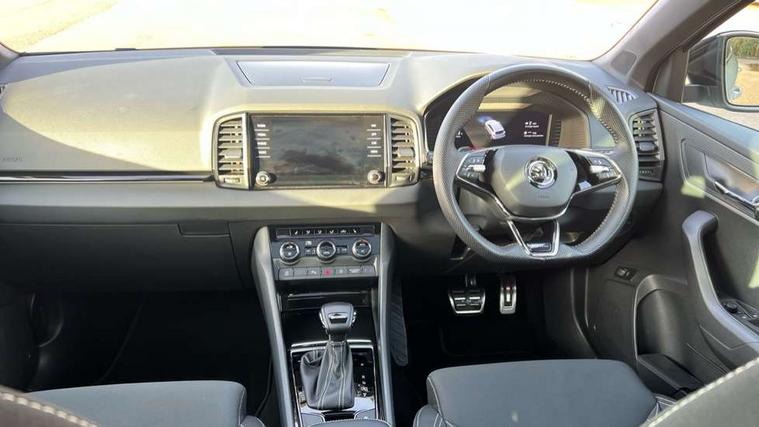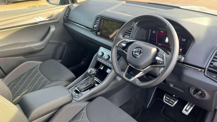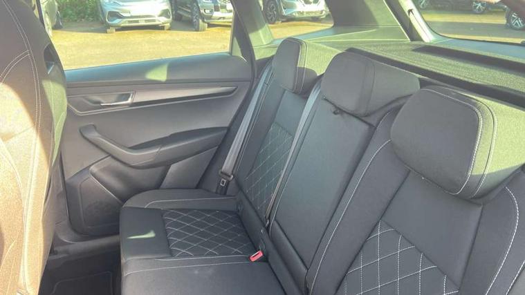 8" Digital display, Care connect, Driver fatigue sensor, Emergency services call system, Outside temperature gauge, Service interval indicator, SmartLink wireless for Apple and wired for Android, Start/stop system with regenerative braking, USB C Port x 2 in front centre console, Virtual cockpit, Virtual pedal with electrically operated boot door, 8 speakers, DAB radio with Bluetooth, USB connection, Wireless charging without wireless aerial connection, Acoustic glass, Aero front windscreen wipers with intermittent function, Auto dimming rear view mirror with light and rain sensors, Black door mirrors, Black electric window control buttons, Black radiator grille, Black roof rails, Body colour door handles, Dynamic headlight range control with cornering light function, Electric front and rear windows with child proof lock, Front door steps with SportLine logo, Heated rear windscreen, LED daytime running lights, LED rear lights with high functionality welcome effect and dynamic indicators, Light assistant (coming/leaving home/tunnel light), Panoramic sliding sunroof, Plastic scuff plates, Privacy glass, Protective door side sills in body colour, Rear diffuser, Rear side wing doors, Rear spoiler, Rear window wiper with washer system and intermittent control, Safety reflectors on front doors, Skoda lettering on tailgate in black, Sportline badge on front fender, Sportline decorative inserts with badging, Sports front and rear bumpers, 1.5 litre bottle holders in driver and front passenger door panels, 12V socket in boot, 12v socket in front centre armrest with storage compartment and rear air vents, 3 rear height adjustable headrests, 3 seat bench in 2nd row, 3 spoke leather sports multifunction steering wheel and silver stitching with gear shift paddles, 4 foldable roof handles with rear coat hooks, Black floor carpet, Black roof headlining, Chrome inner door handles, Double sided boot floor, Foldable hooks in the boot, Front head restraints, Height adjustable front three point seats belts with tensioners, Height/reach adjust steering wheel, Ice scraper, Illuminated glovebox, Illuminated luggage compartment, Isofix child seat preparation outer rear, Manual lumbar support for front seats, Pen holder, Pollen filter, Rear boot cover, Rear reading lights, Rear seats fixed folding and divided 60:40, Rubbish bin door, Safety vest holder, Single front passenger seat, Storage box in upper central dashboard closed, Sunvisors with illuminated vanity mirrors, Textile floor mats, Ticket holder, Titan black interior ceiling, Tool kit, Welcome animation with sportline logo, Boot pack - Karoq, Light Pack - Karoq, Parking pack - Karoq, Automatic door unlocking in case of crash, Automatic fuel cut off in case of crash, Child locks on rear doors, Driver airbag, Electronic parking brake with auto hold function, Emergency rear braking signal, ESC including ABS, MSR, ASR, EDS, HBA, DSR, RBS, MKB and traction control, Front side airbags, Hill hold control, Knee airbags, Passenger airbag with switch-off function, Pedestrian monitor, Seatbelt reminder signalisation and pretensioner for all seats, Three point seatbelts rear, Two tone horn, Tyre pressure display, Tyre pressure monitor, Alarm with interior monitoring, back up horn and tilt sensor with safe function, Electronic engine immobiliser, Keyless entry and start/stop, Remote central locking with 2 remote folding keys, Black air vent surround, Black centre console, Satin black dashboard, Satin black door trim, 19" Vega black polished alloy wheels, Anti-theft wheel bolts protection, Matt black aero hub caps, Storage on wheel cover,