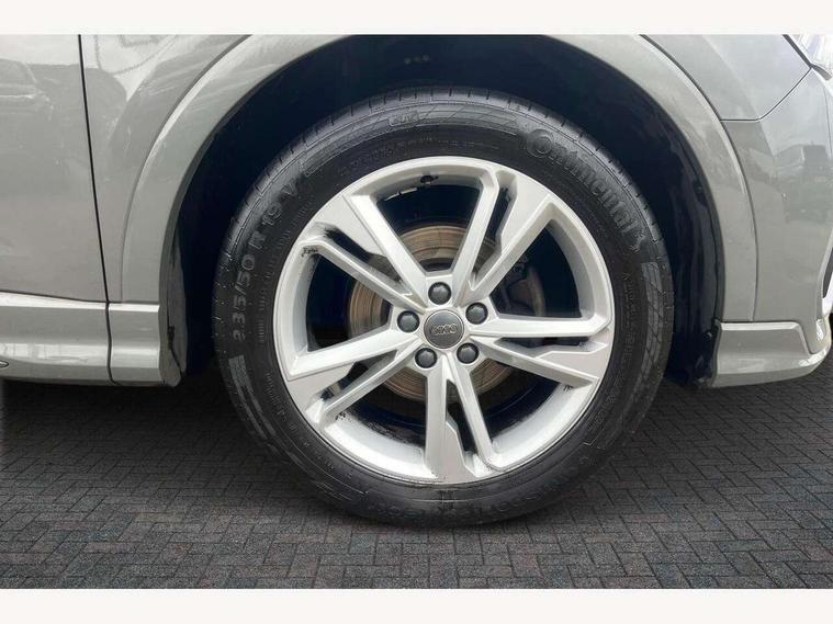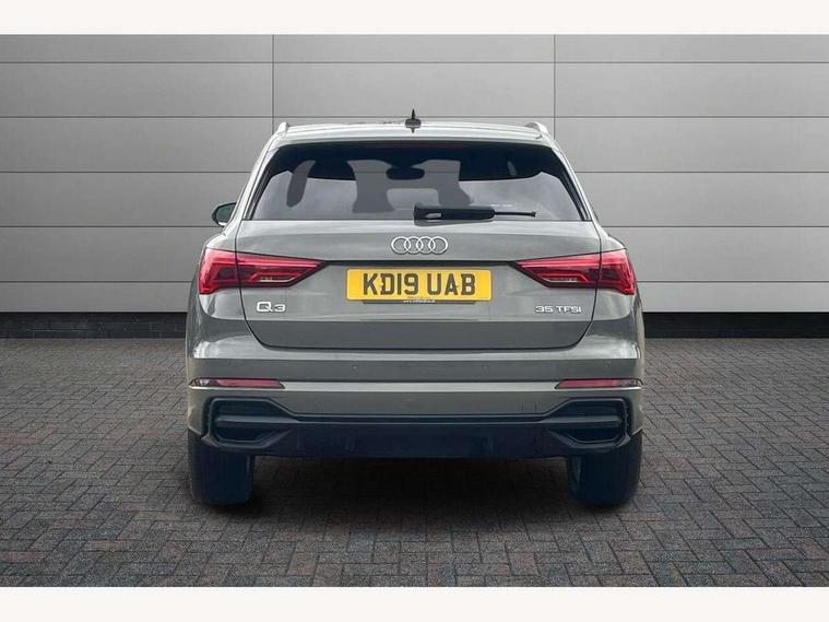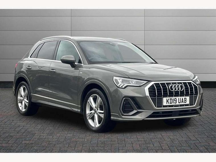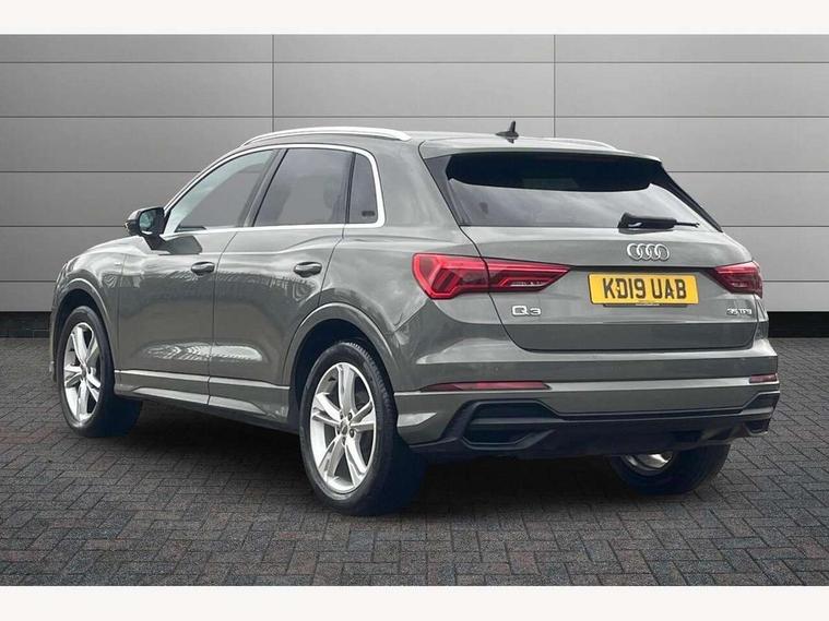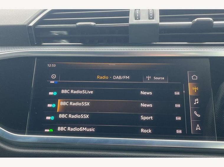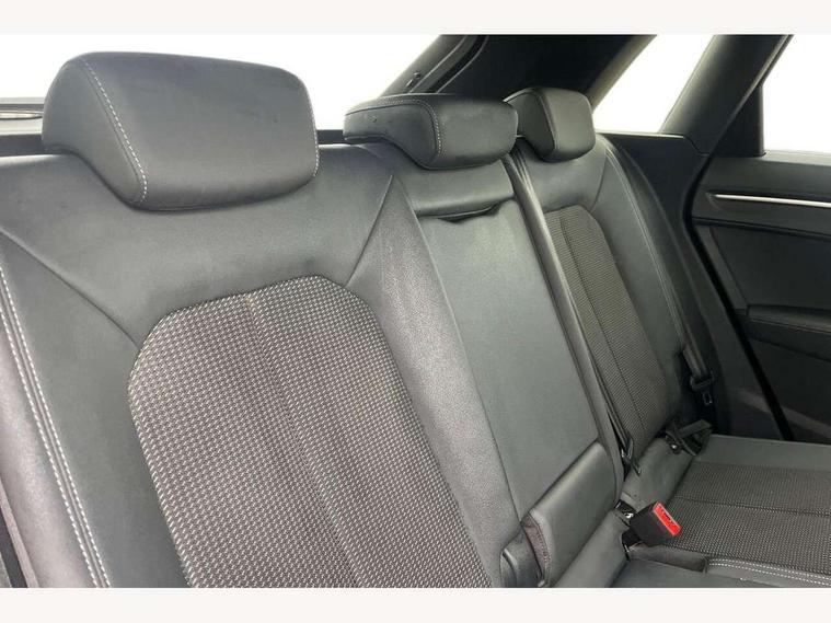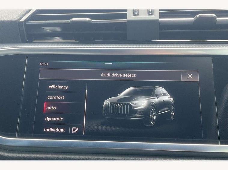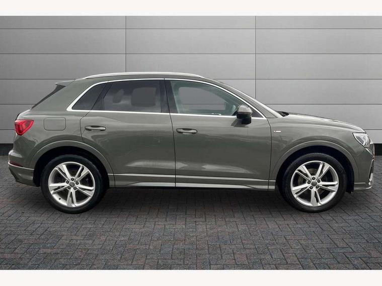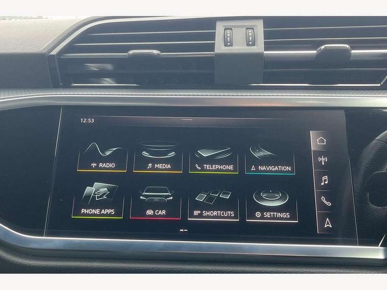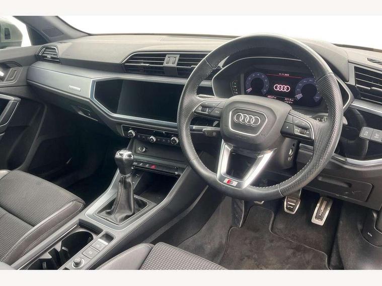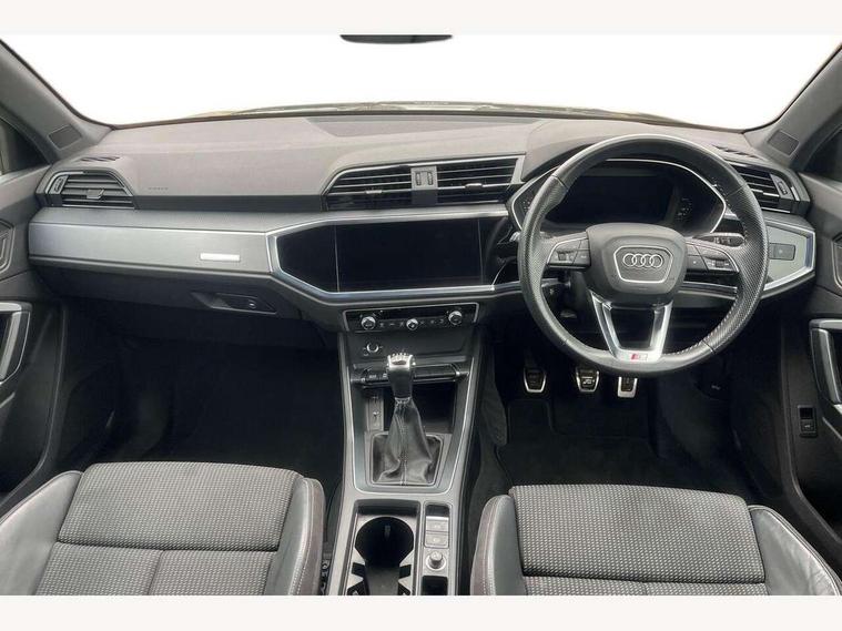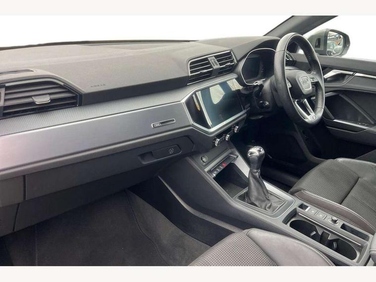 Audi connect safety and service (e-call), Audi drive select, Audi lane departure warning, Audi side assist, Audi smartphone interface, Bluetooth interface, Camera based traffic sign recognition, Cruise control + speed limiter, MMI navigation plus with MMI touch, Power opening/closing tailgate, Progressive steering, Rear parking sensors, Service interval indicator, Stop/start system, Voice control system, Sports suspension, 1 x USB type C and 1 USB type A charging points, 6 speakers, DAB digital radio module, Acoustic windscreen, Aluminium roof rails, Aluminium window trim, Auto dimming rear view mirror, Body coloured bumpers, Diffuser in matt Platinum grey, Electrically adjustable and heated door mirrors with integrated LED side indicators, Front and rear electric windows, Front fog lights, Front side air inlets in matt platinum grey, Front spoiler blade in matt platinum grey, Grille vertical bars in aluminium silver/Matt, High gloss black finish B and C pillars, LED headlights with LED daytime running lights and dynamic rear indicator, LED rear lights, Privacy glass, Rain and light sensors, Rear diffuser strip in matt titanium black, S Line badge on wings, S Line front and rear bumpers, Side skirt insert in matt Platinium grey, Titanium black radiator grille, 12V socket in rear centre console, 40:20:40 split folding rear bench seat, Adjustable rear seat bench/backrest with centre armrest and cupholder, Aluminium door sill trims, Black cloth headlining, Dual zone climate control, Front and rear black floor mats with contrast stitching in rock grey, Front and rear headrests, Front centre armrest with storage compartment and angle adjustment, Illuminated door sill trims with S logo, ISOFIX child seat mounting and Top Tether with front passenger airbag deactivation, Manual front seats with height adjustment, Perforated leather gearknob, Stainless steel luggage compartment sill finisher, Stainless steel pedals, Non smoking pack - Q3, 3x3 point rear seatbelts, 6 airbags - Driver, front passenger, curtain and side windows, Audi pre-sense front with pedestrain and cyclist recognition, Electrically operated child locks on rear doors, Electromechanical parking brake, Electronic stabilisation control including ABS, ASR and EDL, Hill hold assist, Pre sense basic, Seatbelt monitoring, Tyre pressure warning, Warning triangle and first aid kit, Anti theft alarm, Anti theft wheel bolts, Remote central locking, Dark matt brushed aluminium inlay, MMI touch colour display in gloss black with aluminium surround,