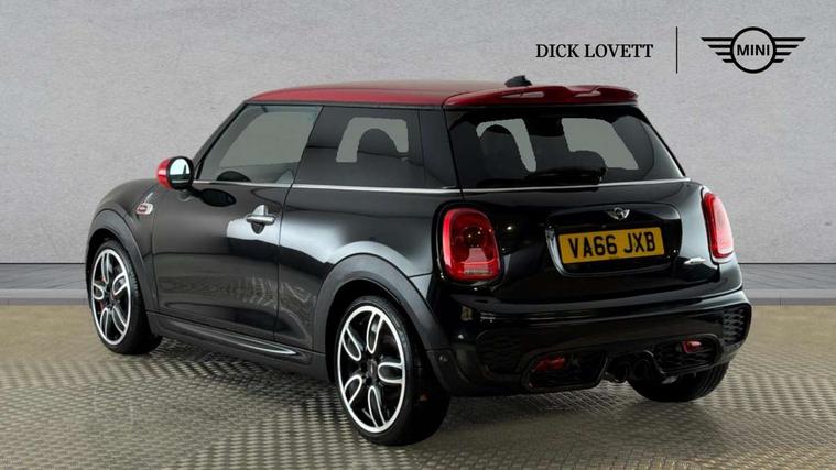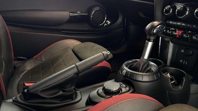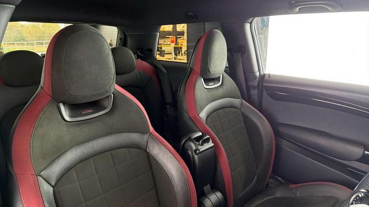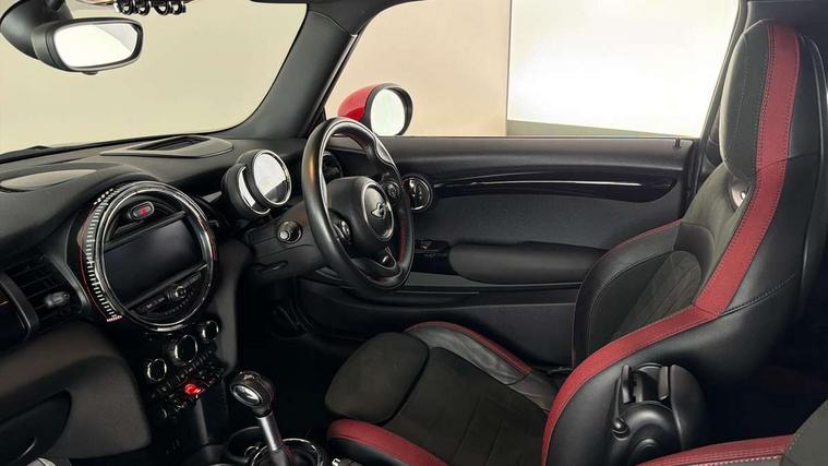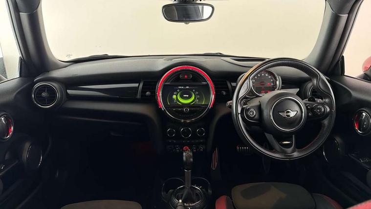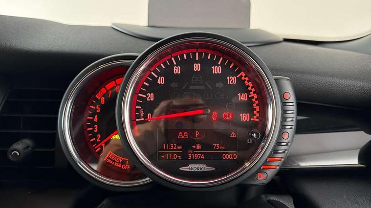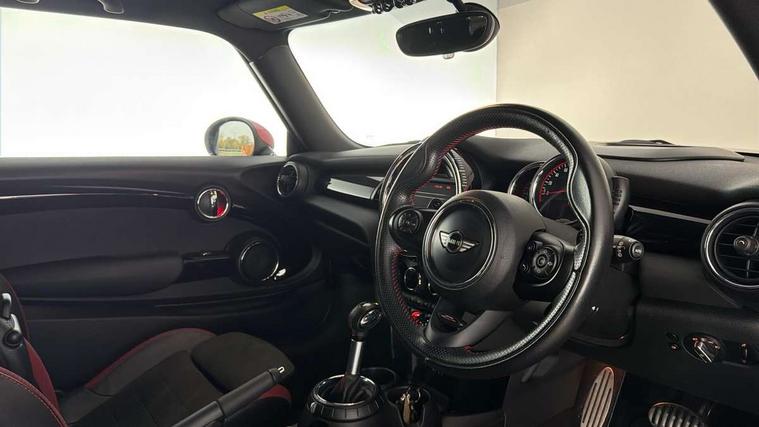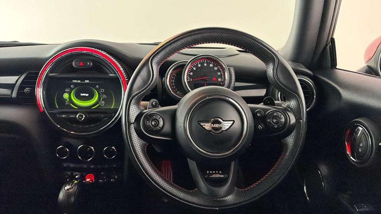 Acoustic seat-belt warning, Brake fluid level warning light, Brake pad wear indicator warning light, DTC - Dynamic traction control, Exterior temperature gauge, Intelligent emergency call, MINI Driving Modes - centre toggle switch to control driving setting (sport, mid and green), MINI TeleServices, Oil level indicator, On board computer, Push button starter, Service interval indicator, Servotronic PAS, Electronic differential lock, Performance Control, Auxiliary input socket, DAB digital radio module, 2 speed wipers+intermittent wipe, Anti dazzle mirror, Anti trapping/one touch open close front windows, Body colour scoop integrated into engine- compartment lid, Body coloured bumpers, Chili red grille bar, Chrome bezels around rear lights and headlights, Chrome door handles, Chrome plated fuel cap, Chrome plated trim on bottom edge of window, Chrome strip on lower grille, Electric front windows, Electrically adjustable door mirrors, Extended wheel arches, Follow me home headlights, Green tinted heat insulating glass, Heated door mirrors/heated windscreen washers, Heated rear window with auto timer, High gloss black tailgate, Honeycomb radiator grille, John Cooper Works roof spoiler, Metal look door sill finishers, Rear wiper, Side scuttles, Twin chromed exhaust pipes, White indicator lights, 2 rear head restraints, 4 boot load lashing points, 6 way manually adjustable passenger seat, 6-way manually adjustable driver's seat, Active carbon filter, Air recirculation system, Anthracite headlining, Auxiliary socket in centre console storage compartment, Centre console storage, Driver's seat height adjuster, Driver/passenger sunvisors, Easy entry seats, Front and rear cupholders, Front head restraints, Front interior light, Front passenger grab handle, Front seat backrest storage nets, Front sports seats, Gear/selector and handbrake in artificial leather, Internal chrome door handles, Isofix child seat preparation, Luggage compartment lighting, Multifunction steering wheel, Passenger seat height adjuster, Reach + rake adjustable steering column, Rear grab handles, Rear storage trays, Split folding rear seats, Storage compartments in doors, Toolkit in luggage compartment, Vanity mirrors, 3 point seatbelts, ABS/EBD, ASC+T, Brake calipers in red, Cornering brake control (CBC), Crash Sensor - activates hazard/interior lighting + unlocks doors, Driver and passenger airbags, Driver/front passenger side airbags, DSC - Dynamic Stability Control, Fuel cut off safety device, Head airbags, Hill start assist, Passenger airbag deactivation system, Seatbelt pretensioners, Tyre pressure warning, Ventilated front disc brakes, Drive away door locking, Locking wheel bolts, Remote central locking/doors+fuel cap+tailgate, Second remote key, Thatcham category 1 alarm + immobiliser,