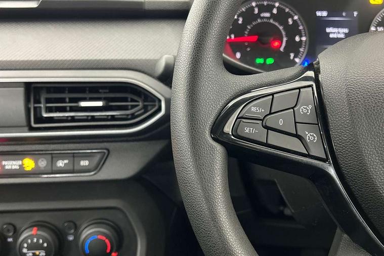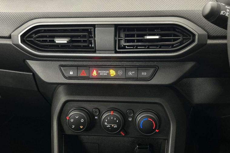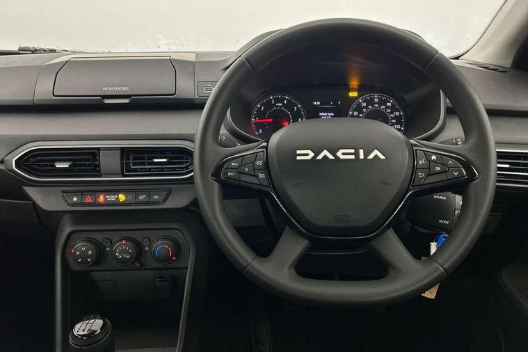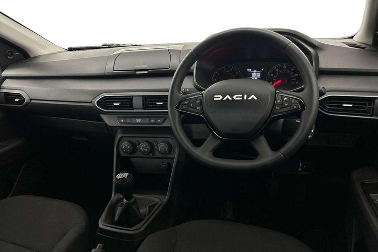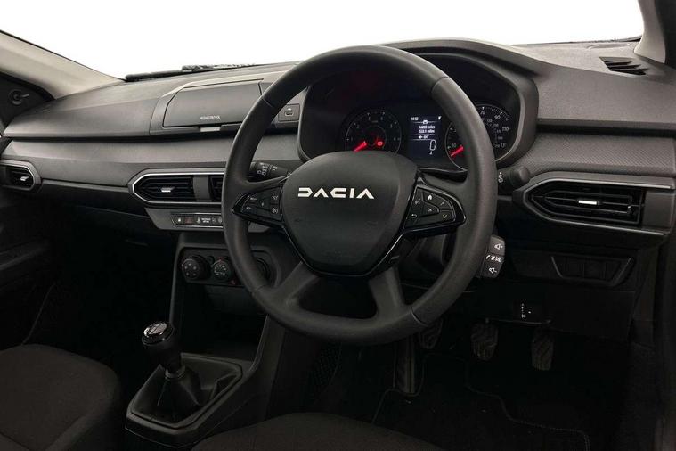 3.5" TFT instrument panel with on-board computer, Cruise control with speed limiter, eCall emergency call system, Eco mode, Electric power assisted steering, Rev counter, Stop/start system, Media Control - DAB Radio with display on instrument panel, Bluetooth, 2 Speakers, Pre-wiring for radio and speakers, USB connection for data transfer and charging, USB socket, 3 speed windscreen wipers, Auto lighting, Black door handles, Black door mirrors, Black radiator grille, Front and rear body coloured bumpers, Front electric windows, Heated rear window, High level third brake light, LED automatic daytime running lights, LED Y shape Dacia signature lighting, Manually adjustable door mirrors, Rear manual windows, Rear side wing doors, Rear wash/wipe, Tinted windows, 1/3 to 2/3 split folding rear seats, 12 volt front socket, 3 height adjustable rear headrests, 3 seat rear bench, Black interior door handles, Fabric upholstery, Fixed smartphone holder on dashboard, Fog grey air vents with white slider, Gear shift indicator, Height adjustable drivers seat with armrest, Height adjustable front headrests, Height/depth adjustable steering wheel, Isofix points for child seats in both outer rear seats, Manual air conditioning, Single front passenger seat, Steering wheel controls, 3x3 point rear seatbelts, 6 airbags - Driver, front passenger, curtain and side airbags, ABS and Emergency brake assist, Automatic emergency braking system, Child locks on rear doors, Door open visual and audible warning, ESC (Electronic Stability Control), ESP (Electronic Stability Program) + Hill Start Assist, Front seatbelt pretensioners, Height adjustable front seatbelts, Seatbelt reminder for driver and front passenger, Tyre pressure monitor, Automatic central locking, Engine immobiliser, Remote central locking, 15" Steel wheels with full wheel cap,