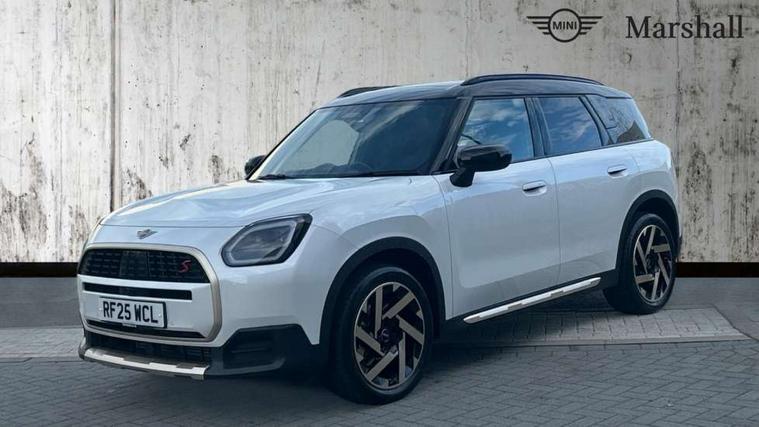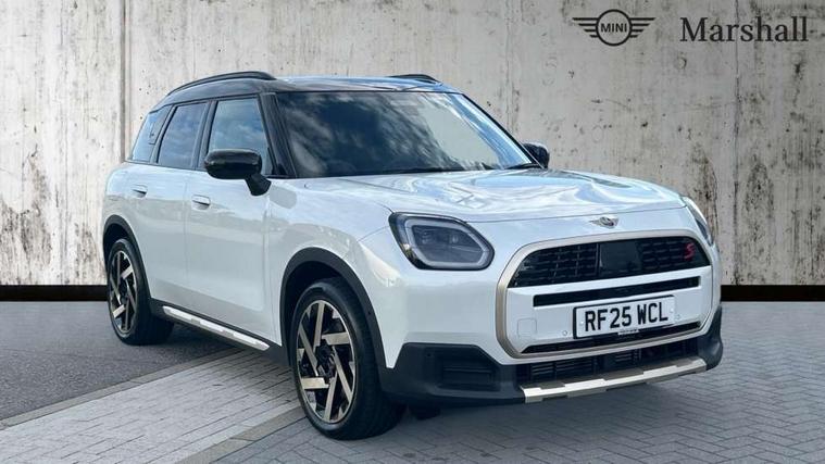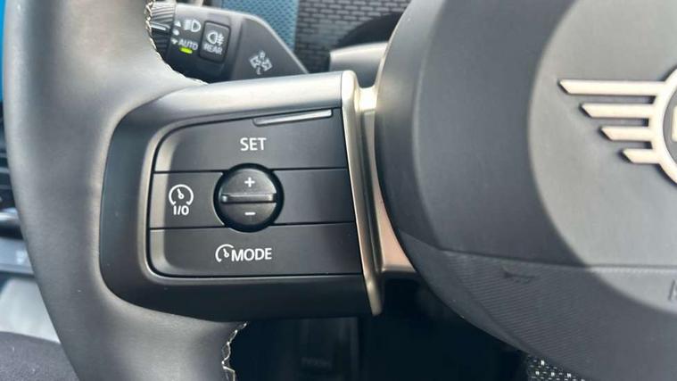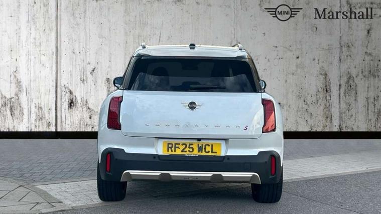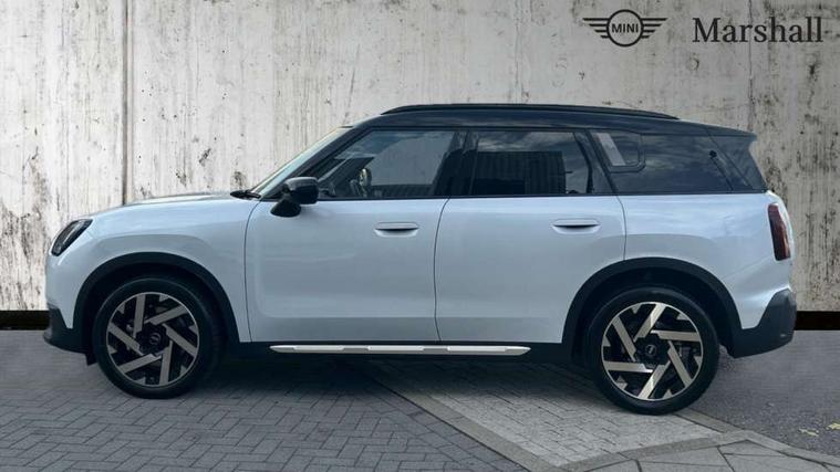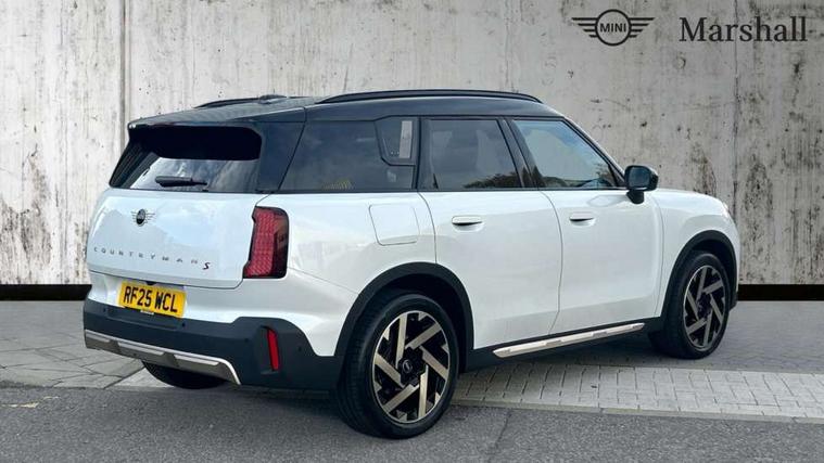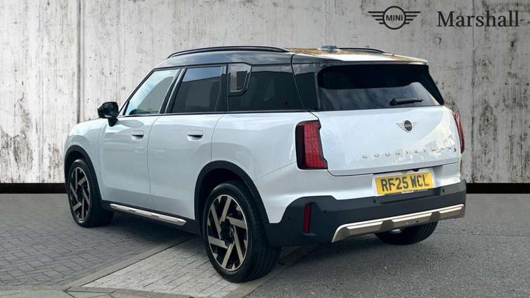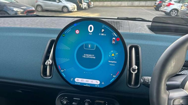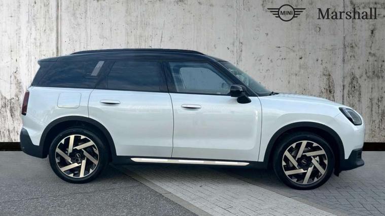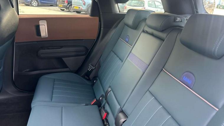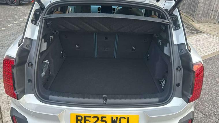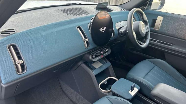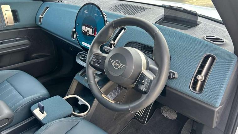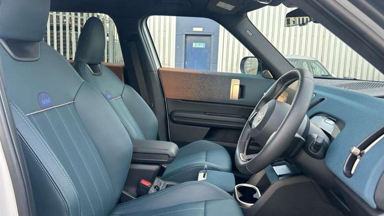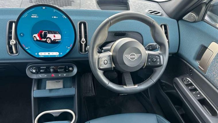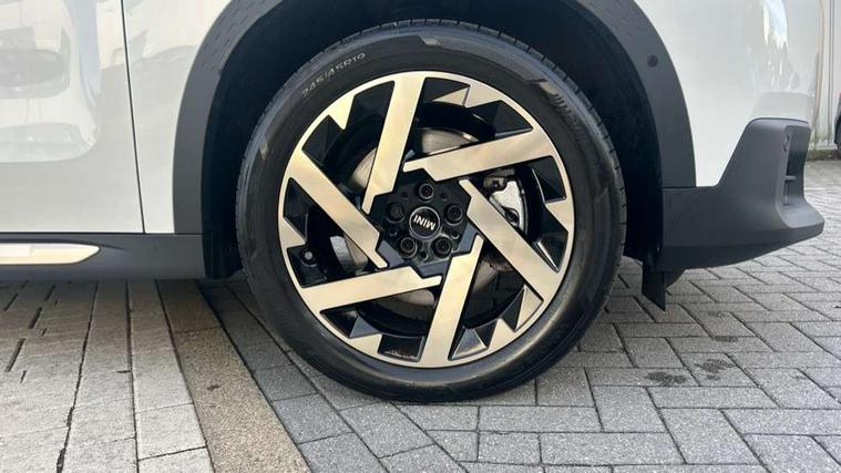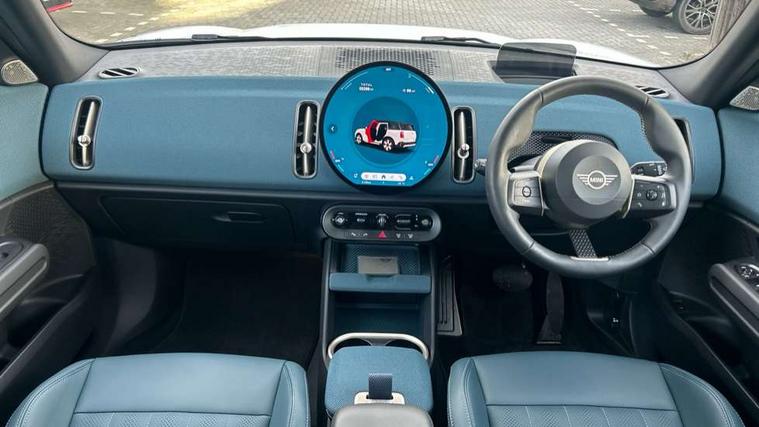 Bluetooth connection, Circular OLED Screen, Compatible mobile phone bluetooth with audio streaming, Cruise Control (DCC), Digital dashboard display, Driving assistant, Driving Assistant Plus Preparation, E-call, Electro-mechanical speed dependant steering assistance, MINI Experience Modes, MINI Head up display, Mini navigation system, MINI TeleServices, Parking assistant in camera and ultrasound based assistance system, rear view camera, parking aid and distance control, Auto transmission with Paddles, Larger capacity fuel tank, 6 speakers, DAB Digital radio, Personal eSim, Auto tailgate, Electric adjustable heated door mirrors, Front and rear electric windows, Heated rear window, High beam assistant, Interior rear-view mirror with automatic anti-dazzle function, LED daytime running lights, LED headlights with extended contents including Adaptable light signatures, LED rear lights, LED third brake light, Logos in Vibrant Silver, Rain sensor with auto headlights, Rear side wing doors, Rear window wiper, Roof rails, Vibrant silver grille surround, 3 Seat sliding rear bench in 2nd row, 60/40 split rear bench seat, Anthracite headliner, Auto air conditioning, Driver and front passenger seat heating, Floor mats, Front armrest, Front headrests, Front sport seats, Heated steering wheel, Height and length steering column adjustment, Lidded storage box in Petrol knit, Luggage compartment separating net, Rear headrests, Seat adjustment for rear seats, Single front passenger seat, Sport Vescin Steering Wheel, Sunvisors with vanity mirrors, Vescin synthetic leather upholstery, Vibrant Silver sill inlay, Wireless charging tray, Interior and exterior mirror package - Mini Countryman, 3x3 point rear seat belts, 6 Airbags - front, side, head and seat belt tensioners, ABS, DSC - Dynamic Stability Control, Electronic handbrake, Electronic Stability Programme (ESP), Front ISOFIX (iSize), Hill descent control, Hill hold assist, Hill start assist, Manual rear child locks, Traction control, Tyre pressure monitoring system, Warning triangle, Alarm system with tilt sensor, monitoring doors, bonnet interior and tailgate, Auto drive away locking, Comfort access system, Deadlocking function, Electronic vehicle immobiliser, Locking wheel bolts, Remote control locking, Start/stop toggle with keyless go, Petrol/Brown dashboard knit, MINI Mobility Kit,