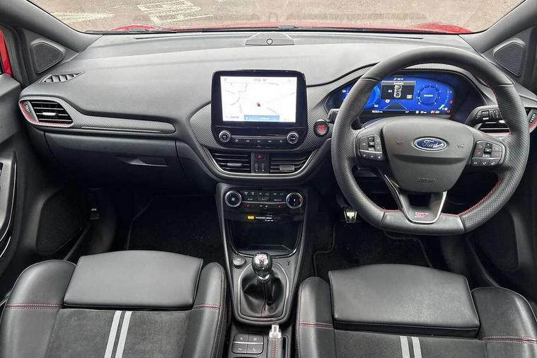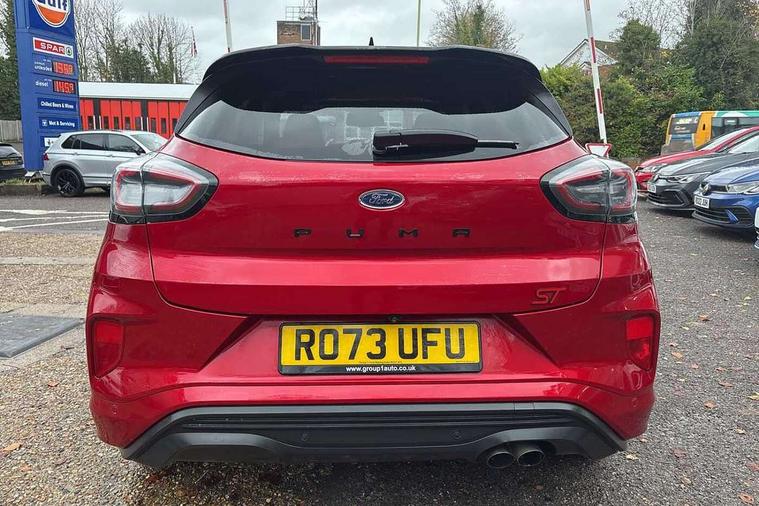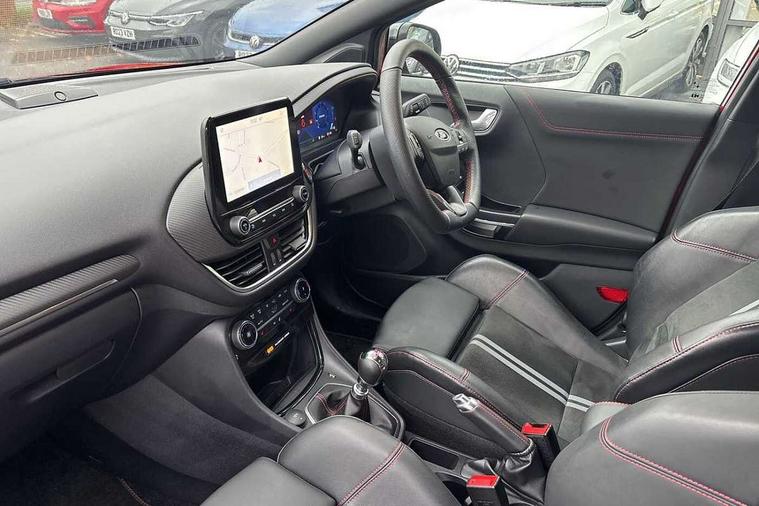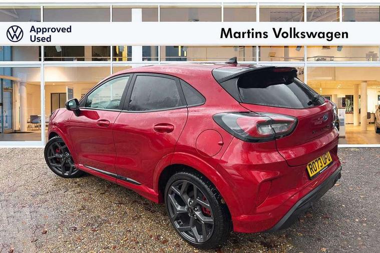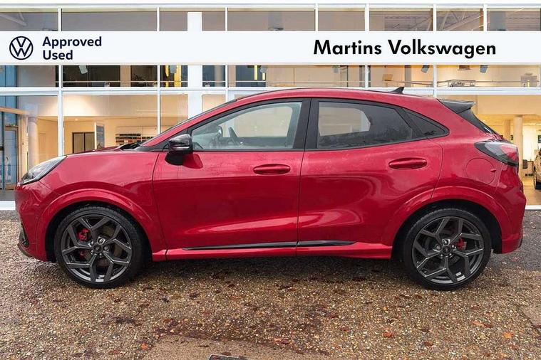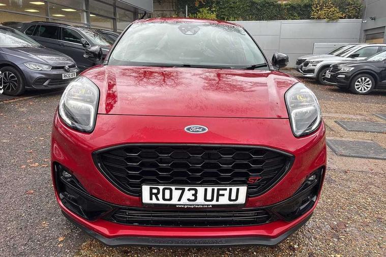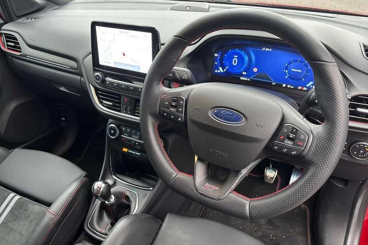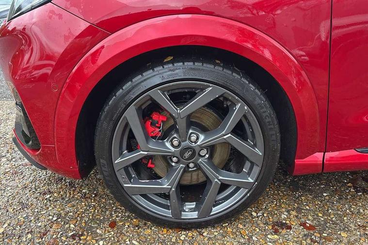 Cruise control with Intelligent speed assist, Driver impairment monitor, Emergency call service, Ford easy fuel, Front and rear parking sensors, Full digital 12.3" instrument cluster, Lane keeping aid with lane departure warning, Power assist steering, Selectable drive modes (normal, sport, eco, track), Speed sign recognition, Engine sound enhancer, ST suspension, Automatic headlights with auto high beam, Automatic rain sensing wipers, Dual chrome exhaust, Fixed LED signature headlamps, Front fog lamps, LED daytime running lights, LED rear lamps, Power foldable heated door mirrors with puddle lamps and puma logo protection, Privacy glass to side rear windows and tailgate glass, Quickclear heated windscreen, Rear side wing doors, Rear wiper, ST scuff plates, Third brake light, Unique ST body styling kit including contrast black roof, large rear spoiler and wing mirrors, plus Ford Performance embossed splitter, 3 seat bench in 2nd row, Alloy sports pedals, Centre console with armrest and stowage, Ford megabox extended bootspace, Ford Performance sensico partial premium leather upholstery with metal grey stitching, Front and rear floor mats, Front and rear head restraints, Manual 6 way driver seat adjust with lumbar adjustment, Manual 6 way passenger seat with lumbar seat adjustment, Single front passenger seat, ST flat bottomed steering wheel with metal grey stitching, ST logo projection, Unique ST gear shift knob, Wireless charging pad with electronic air temperature control (EATC), B&O Premium Audio system + Ford SYNC 3 navigation pack - Puma, Winter pack - Puma, 3 rear seatbelts, Child safety lock, Electronic stability control (ESC) and hill start assist, Pedestrian/cyclist detection & post-collision braking, Pre collision assist system, Red brake calipers, Tyre pressure monitoring system (TPMS), Keyless entry and power start button, Thatcham alarm, Carbon look interior deco spears, 19" 5 Spoke magnetite dark finished alloy wheel, Tyre inflation kit,