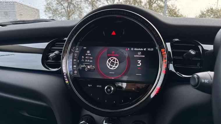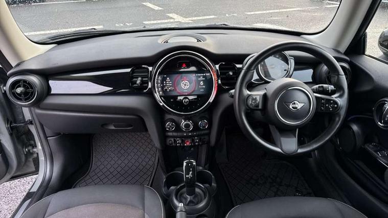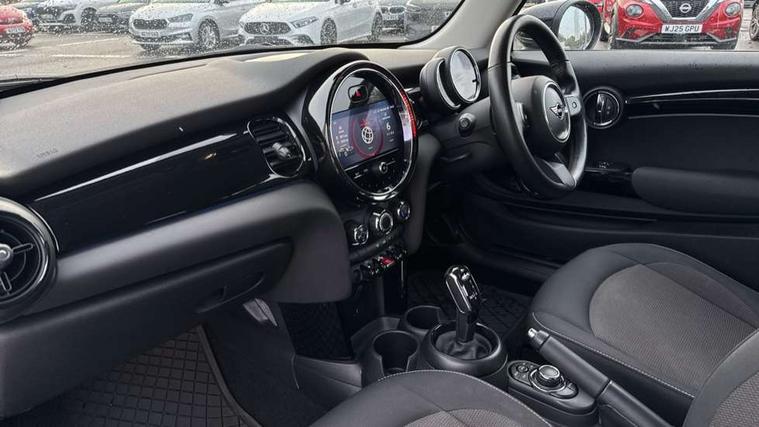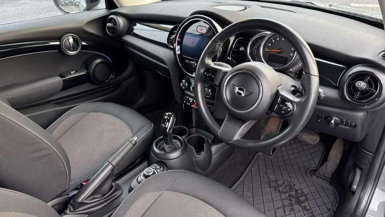 Automatic start/stop function with brake energy recuperation, Compatible mobile phone bluetooth with audio streaming, Cruise control with brake assist, Electro-mechanical speed dependant steering assistance, Flexible car sharing preparation, Instrument cluster, Mini E-call, MINI TeleServices, On board computer, Service interval indicator, Double Vanos system, Fully variable valve control, High precision injection, Performance Control, Steptronic transmission with double clutch, 4 speakers in front door trims and underneath front seats, 8.8" touchscreen with LED ring, FM tuner and DAB digital radio, Automatic headlight activation switch, Body colour fuel filler cap, Chrome border high gloss black slats radiator grille, Dynamic brake lights, Electric front windows, Exhaust tailpipe on left with chrome finisher, Heated rear window, Heated windscreen washer jets, LED headlight with closed ring and daytime driving lights, Metal door sill strips with MINI imprint, Model logo Cooper on right of tailgate, Rain sensor window wipers, Rear fog lights, Rear LED lights with union jack design, Rear window wiper, Side scuttle panel with integrated indicator, Sun/heat protection glass, White indicator lenses, 12V Accessory socket in centre console, 4 lashing eyes in luggage compartment, 60/40 split folding rear seat, Ambient lighting, Carbon black colour line - Knee roll and door armrest, Chrome interior highlights, Cupholders, Front and rear head restraints, Front and rear isofix with front passenger airbag deactivation, Glove compartment, Height and length steering column adjustment, Interior lighting with 12 different colours across the dashboard, underneath door bezel with illuminated laser-engraved design on central display, Leatherette gearshift lever and handbrake gaiters, LED reading lights, vanity mirror lights, front foot well light and spotlight on front seats, Manual air conditioning, Mechanical seat adjustment - forward/back & backrest for front seats and driver seat height adjust, Multifunction steering wheel, Passenger seat height adjuster, Satellite grey headlining including grab handles and clothes hooks, Sport leather steering wheel with speed limiter and audio/communication controls, Storage compartments in doors, Sunvisors with vanity mirrors, Tool kit, Velour floor mats, 3 point seatbelts on all four seats, 6 Airbags - front, side, head and seat belt tensioners, Anti-lock braking system (ABS), DSC - Dynamic Stability Control, Front and rear disc brakes, Single tone fanfare horn, Tyre pressure monitoring system, Alarm system with tilt sensor, monitoring doors, bonnet interior and tailgate, Electronic vehicle immobiliser, Start/stop toggle with keyless go, Piano black interior trim, Tyre repair kit,