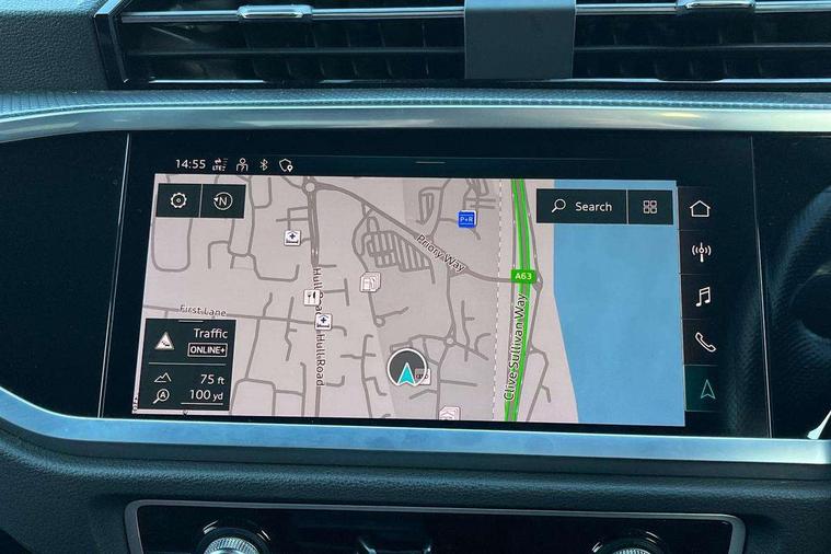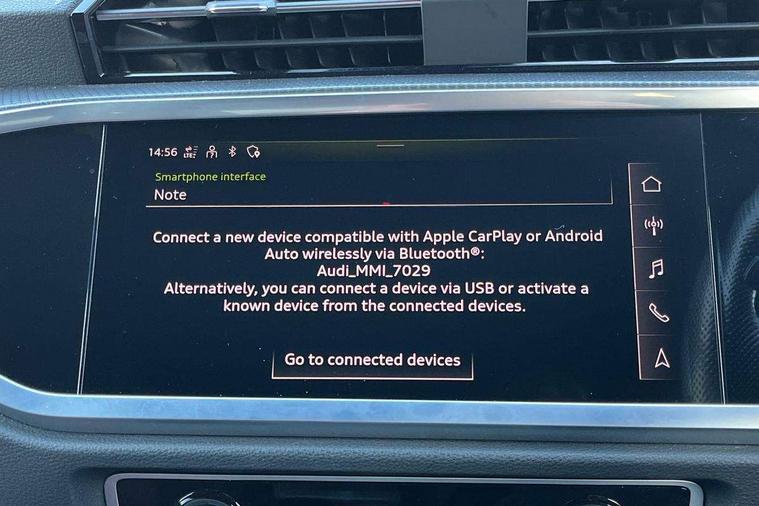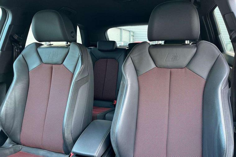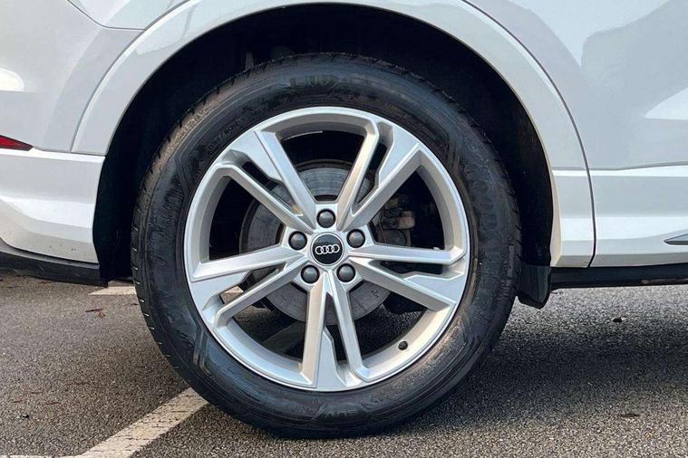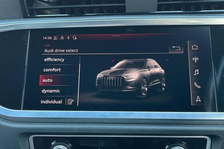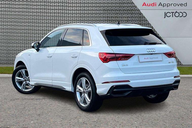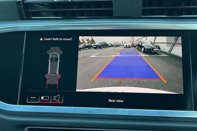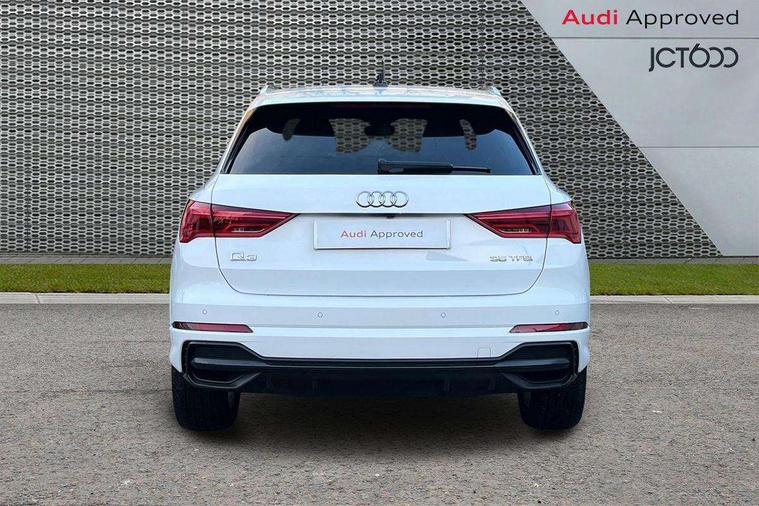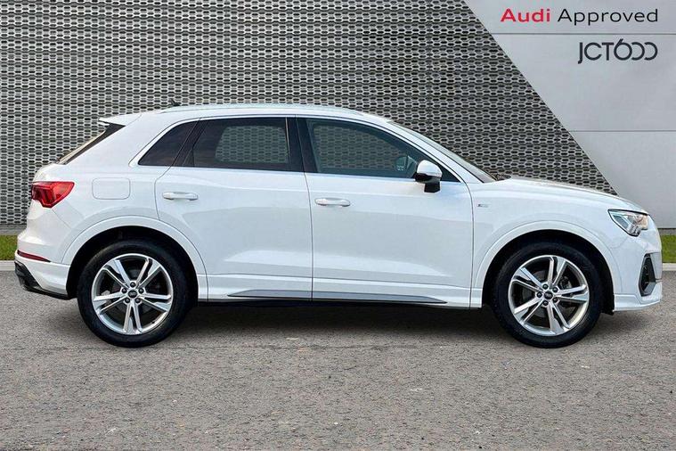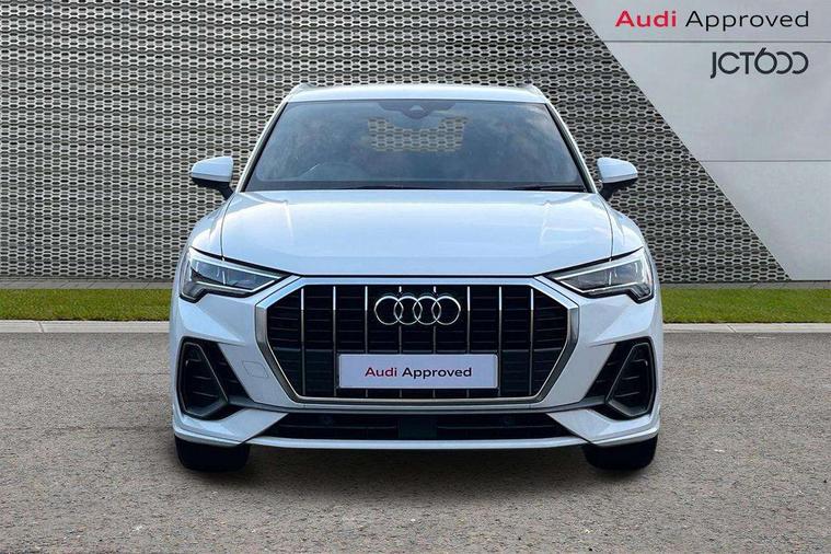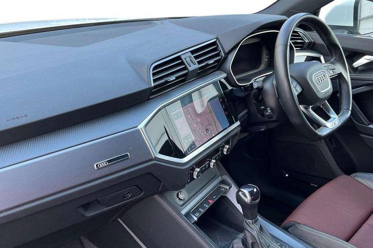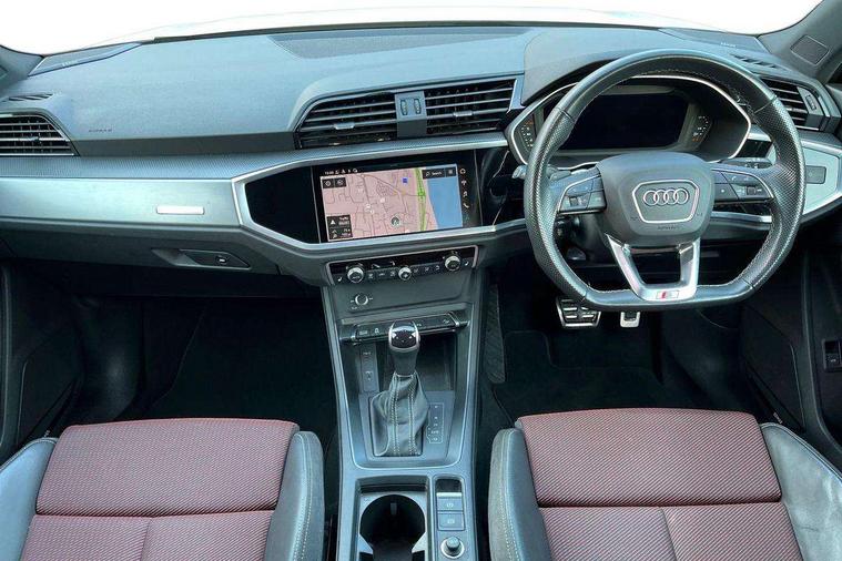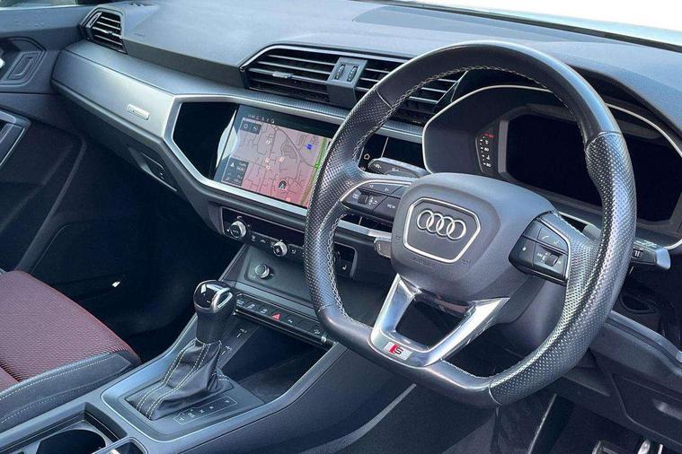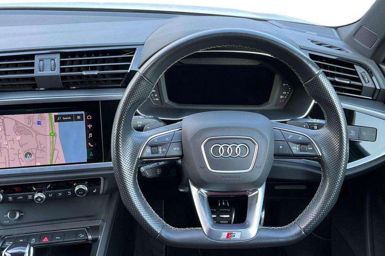 Amazon alexa Integration, Audi drive select, Audi lane departure warning, Audi Virtual Cockpit - 10.25" display, Bluetooth interface, Camera based traffic sign recognition, Legal emergency call, MMI Navigation Plus with high resolution 10.1 inch touchscreen colour display, Power operated tailgate, Progressive steering, Service interval indicator, Smartphone interface includes wireless Apple carplay/Android Auto, Start stop system with recuperation, Voice control system with natural language interaction, Sports suspension, 2 USB-C ports with charge and data functions, 6 passive loudspeakers, DAB digital radio module, Acoustic windscreen, Aluminium roof rails, Aluminium window trim, Auto dimming frameless rear view mirror, Body colour front spoiler blade, Body coloured bumpers, Electrically folding, adjustable and heated door mirrors with integrated LED side indicators and kerb view function for passenger side, Front and rear electric windows, Front fog lights, Front side air inlets in matt platinum grey, Grille vertical bars in aluminium silver/Matt, High gloss black finish B and C pillars, LED Dynamic rear indicators, LED headlights with LED daytime running lights, LED rear lights, LED third brake light, Privacy glass dark tinted rear and rear-side windows (from B-pillar backwards), Rain and light sensors, Rear diffuser grille in grained matt black, Rear diffuser strip in matt titanium black, Rear side wing doors, Rear wiper, S line badges on front wings, S Line front and rear bumpers, Side skirt insert in matt Platinium grey, Titanium black radiator grille, Variable front intermittent wipers, 12V socket in rear centre console, 3 seat bench in 2nd row, 40:20:40 folding with manual adjustment for 60:40 forwards/backwards position and backrest angle, Adjustable rear seat bench/backrest with centre armrest and cupholder, Black cloth headlining, Dual zone electronic climate control, Front and rear black floor mats with contrast stitching in rock grey, Front and rear headrests, Front and rear roof module including reading lights, Front centre armrest, Glove compartment lighting, Height and reach adjustable steering wheel, Illuminated door sill trims with S logo, ISOFIX child seat mounting for front passenger with airbag deactivation and outer rear seat including top tether attachment point for outer rear seats, Luggage compartment light, Manual front seats with height adjustment, Perforated leather gearknob, Single front passenger seat, Stainless steel luggage compartment sill finisher, Stainless steel pedals, Ambient lighting pack - Q3, Non smoking pack - Q3, 3x3 point rear seatbelts, 6 airbags - Driver, front passenger, curtain and side windows, Audi pre-sense front with pedestrain and cyclist recognition, Electrically operated child locks on rear doors, Electromechanical parking brake, Electronic stabilisation control including ABS, ASR and EDL, Front seatbelt reminder, Hill descent control, Hill hold assist, Pre sense basic, Seatbelt monitoring, Tyre pressure warning, Warning triangle and first aid kit, Anti theft alarm, Anti theft wheel bolts, Immobiliser, Remote central locking, Dark matt brushed aluminium inlay, Detail dashboard around MMI touch colour display in glass look, black with surround in aluminium look, Leatherette door armrest,