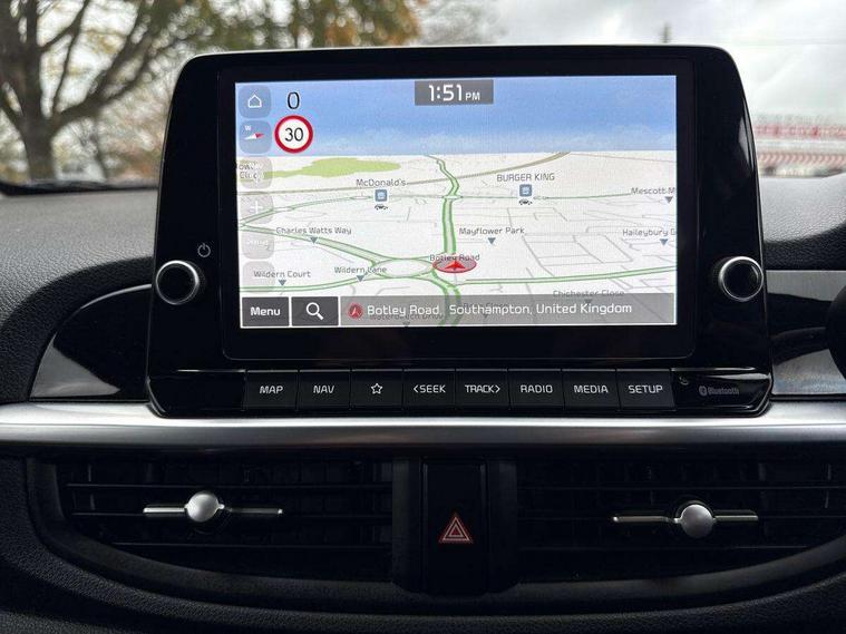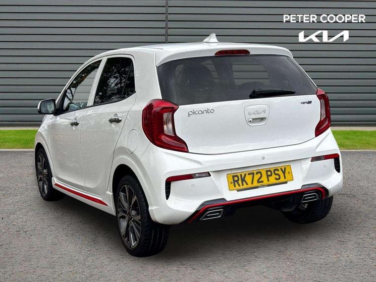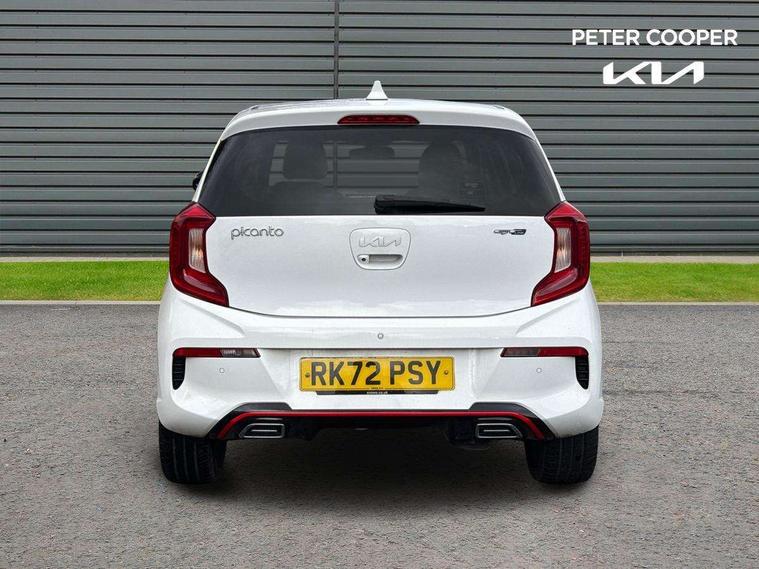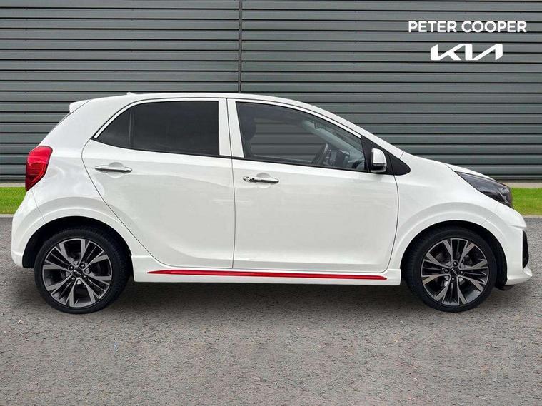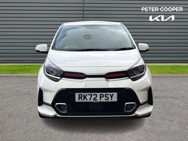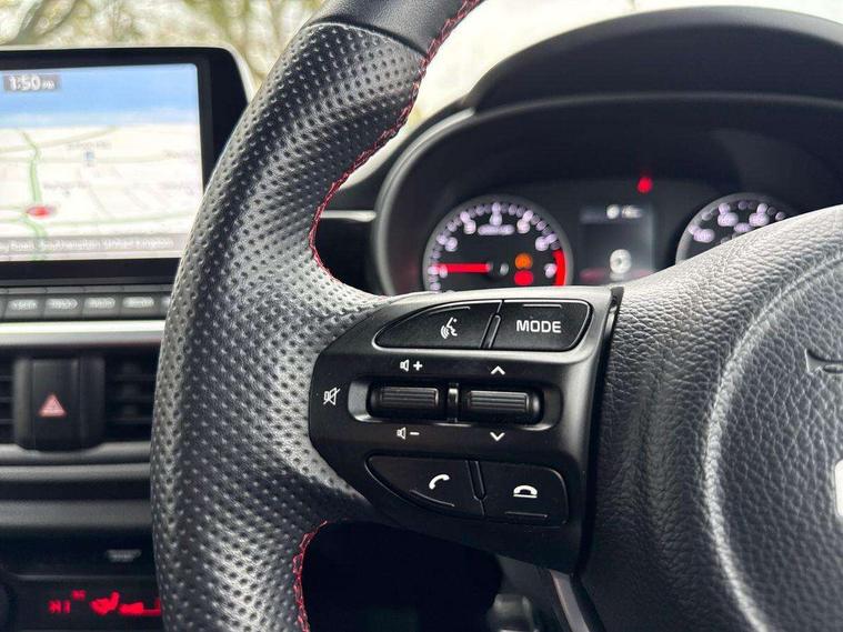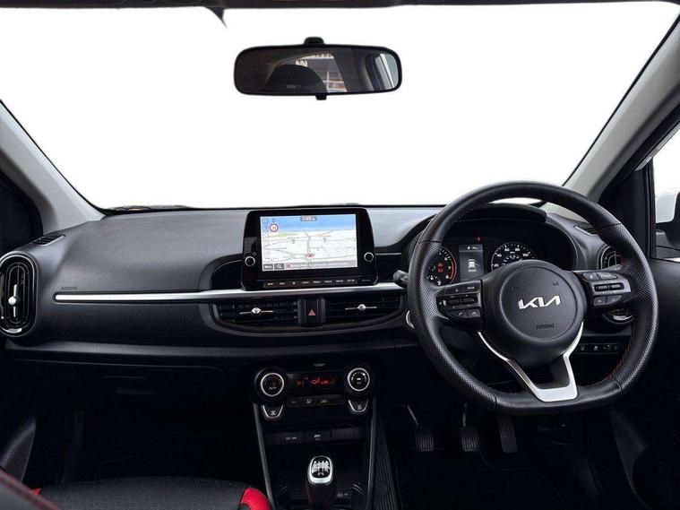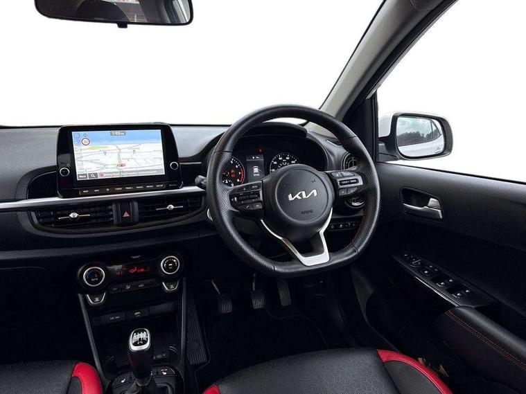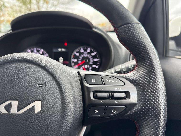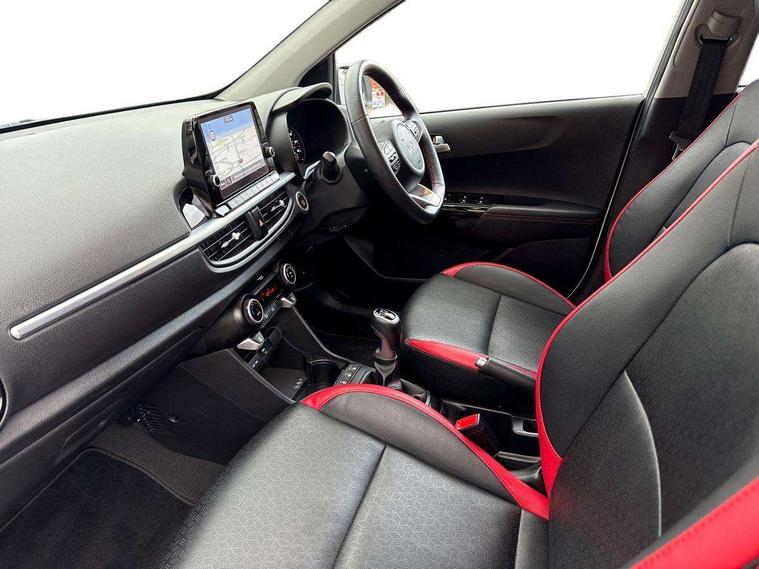 8" touch screen satellite naviagtion with RDS and DAB with telematics, Apple car play/Android Auto with voice control, Cruise control + speed limiter, Emergency call service, Emergency stop signalling system, External temperature gauge, Kia Connect (UVO), Motor driven power steering, Rear parking sensors, Reversing camera system with dynamic guidelines (Integrated into centre fascia screen), Tachometer, Trip computer, Wireless Smartphone charger, 6 speaker audio system, Bluetooth with music streaming, Steering wheel mounted controls, USB ports for connection of a media device, Automatic headlight control system, Bi-function projection headlights, Black beltline mouldings, Black grille with silver surround, Body colour B pillars, Body colour bumpers, Body colour side sill mouldings, Body coloured mirrors and chrome exterior handles, Day/night rear view mirror, Electric adjustable/heated/folding door mirrors with LED indicators lights, Front and rear electric windows with drivers's auto up/down function, Front fog lights, Headlamp levelling, Heated rear window, High mount brake light, LED daytime running lights, LED rear fog lights, Privacy glass - Rear windows and tailgate, Rain sensor, Rear side wing doors, Rear wash/wipe, Speed variable front wipers, Sports front and rear bumpers with gloss black skid plates twin exhaust, Tinted glass, Visible VIN plate, Welcome and follow-me home light functionality, 1 x rear coat hook, 12V power point front, 2 seat bench in 2nd row, 3 x passenger assist grips, 60/40 split/folding 2nd row of seats, All round height adjustable headrests, Automatic air conditioning, Black and red accents front door armrest, Centre Console with Storage Box and Sliding Armrest, Cupholders in centre console, D-cut steering wheel with red stitching, Driver and front passenger sunvisors with driver's side illuminated vanity mirrors, Driver seat height adjust, Faux leather upholstery, Front cabin lights, Glovebox, Heated front seats, Heated steering wheel, High gloss lower centre fascia trim, door armrest and air vents, ISOFIX Child seat top tethers and anchor fixings, Leather trimmed steering wheel and gearshift, Luggage area light, Luggage area parcel shelf, Passenger front seatback pockets, Satin chrome interior door handles, Single front passenger seat, Slide/reclining front seats, Tilt adjustable steering wheel, Advanced Driver Assistance Pack - Picanto, 2 x 3-point rear seatbelts, ABS/EBD, Automatic unlocking of doors in case of impact, Dual front airbags, ESC + BAS + VSM + HAC, Front passenger airbag cut-off switch, Front seatbelt height adjusters, Front seatbelt pretensioners + load limiters, Hill hold control, Knee airbags, Rear child proof door locks, Seatbelt warning, Side impact protection, Torque vectoring brake based and straight line stability (SLS), Traction control, Twin curtain airbags, Twin front side airbags, Tyre pressure monitoring system, Anti theft alarm, Engine immobiliser, Locking wheel nuts, Smart key with engine start/stop button, 16" alloy GT-Line wheels, Tyre mobility kit,