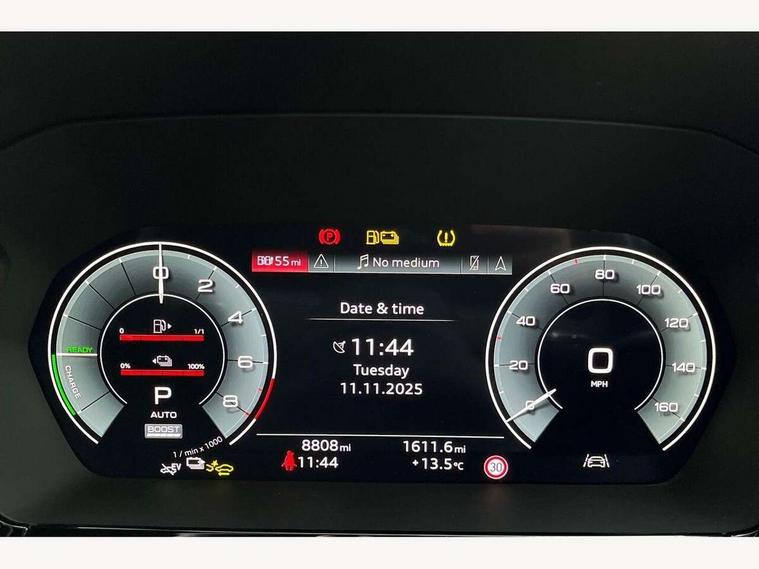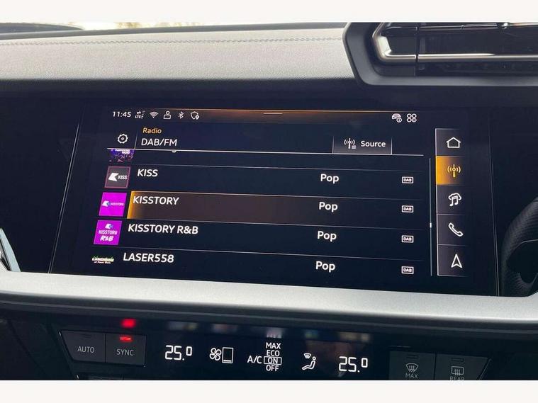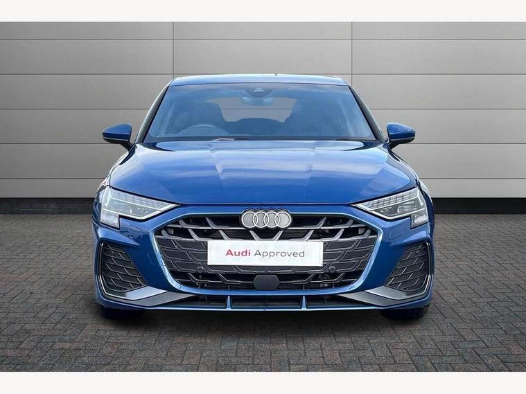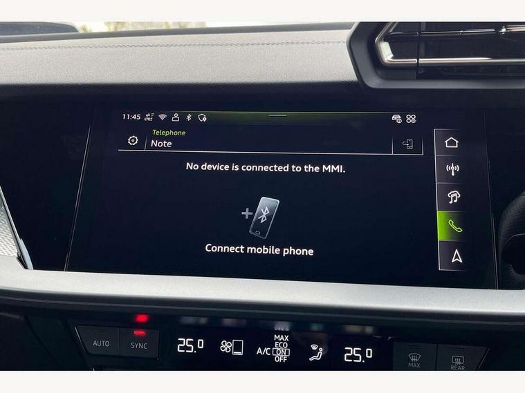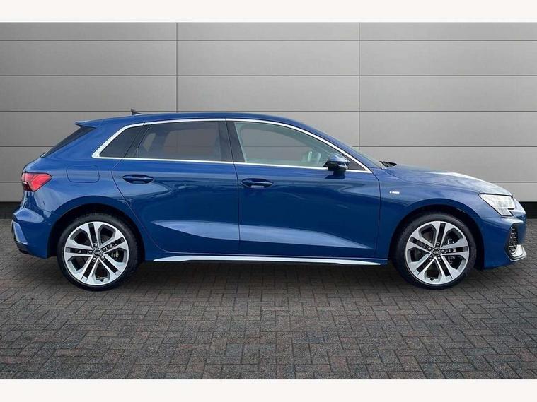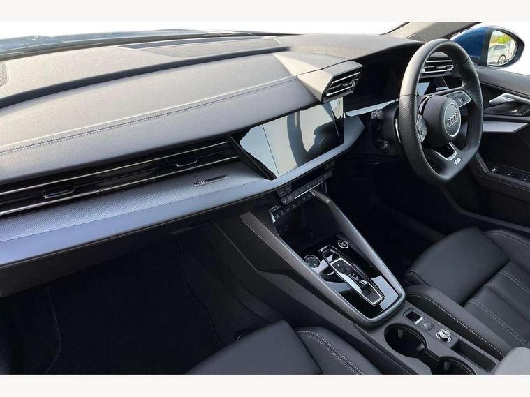 Adjustable speed limiter, Audi drive select, Audi smartphone interface with app store includes wireless Apple carplay, Android auto and Amazon alexa integration, Audi virtual cockpit plus - 12.3" full HD resolution dynamic digital instrument cluster, Automatic start/stop system with recuperation, Bluetooth interface, Camera based traffic sign recognition, Collision avoidance assistant, Cruise control, Distraction and Fatigue warning, e-Call (emergency call), Electromechanical power speed sensitive steering, Lane departure warning system, MMI Navigation Plus with high resolution 10.1" colour touch screen display, Park Assist with parking system Plus, Service indicator, Trip computer, Voice control system with natural language interaction, 3 pin 10 amp domestic charging cable, CCS socket for DC charging, Charging cable for public charging, mode 3 (type 2), up to 22 kW (AC), Compact charging system, Industrial connector CEE 32 A, 230 V, length 1.6 m, Standard suspension, Type 2 socket for AC charging, Audi Phonebox light with wireless charging, Audi sound system - 10 loudspeakers including centre loudspeaker and subwoofer, DAB Digital radio, USB ports with charging function in the rear, Acoustic glass windscreen, Aluminium window trim, Auto dimming frameless rear view mirror, Body colour exterior mirrors, Chrome exhaust tailpipes, Electrically adjustable/heated/folding/auto dimming door mirrors with integrated LED indications + kerb view function for passenger side, Exterior model badging, Front and rear side air inlets in grained matt black with dark liquid chrome frame, Front electric windows, Front radiator grill in high gloss dark chrome, Heat insulating glass windscreen, Illuminated door sills with aluminium inserts at the front with S logo, LED 3rd brake light, LED daytime running lights, LED headlights with LED rear lights and dynamic rear indicators, Light and rain sensors, Privacy glass - dark tinted rear window, rear door and side windows, Rear diffuser and grill in grained matt black with inlay in dark liquid chrome, Rear electric windows, Rear side wing doors, Rear wiper, S line bumpers, S roof spoiler, Side S line emblems on front wings, Side sill trim in dark liquid chrome, 12V socket and storage compartment in front centre console, 3 seat bench in 2nd row, 3 spoke flat bottomed leather multifunction sport steering wheel with gear shift paddles, 3-zone deluxe automatic air conditioning, 4 way electrically adjustable lumbar support for driver and front passenger, 40/20/40 split folding rear seat bench, Black cloth headlining, Convenience auxiliary air conditioning, Front and rear centre armrest in artificial leather, Front and rear centre armrest in artificial leather with contrasting stitching on armrests and instrument panel, Front and rear headrests, Front/rear floor mats, Heated front seats, Height and reach adjustable steering wheel, Manual boot compartment lid, Manually adjustable front seats, Rear cup holders, S badging on the steering wheel, Seat side bolsters, Single front passenger seat, Stainless steel pedals and front footrest in black, Twin leather upholstery with front sports seats S embossed logo, Aluminium interior elements pack - A3 Sportback, Multi-coloured LED interior lighting package - A3, 3x3 point rear seat belts, Acoustic vehicle alerting system, Driver and front passenger airbag with passenger airbag deactivation, Electronic Stabilisation Control (ESC) including ABS, ASR and EDL, First aid kit with warning triangle and 2 safety vests, Front side airbags with head airbags and interaction airbag, Hill hold assist, Pre-sense front with pedestrian and cyclist detection, Seatbelt monitoring, Tyre pressure loss indicator, Anti theft alarm, Anti-theft wheel bolts, Electronically operated child locks, Immobiliser, Remote central locking with safelock, Dash & door Inlay in dark aluminium Spectrum, Tyre repair kit,